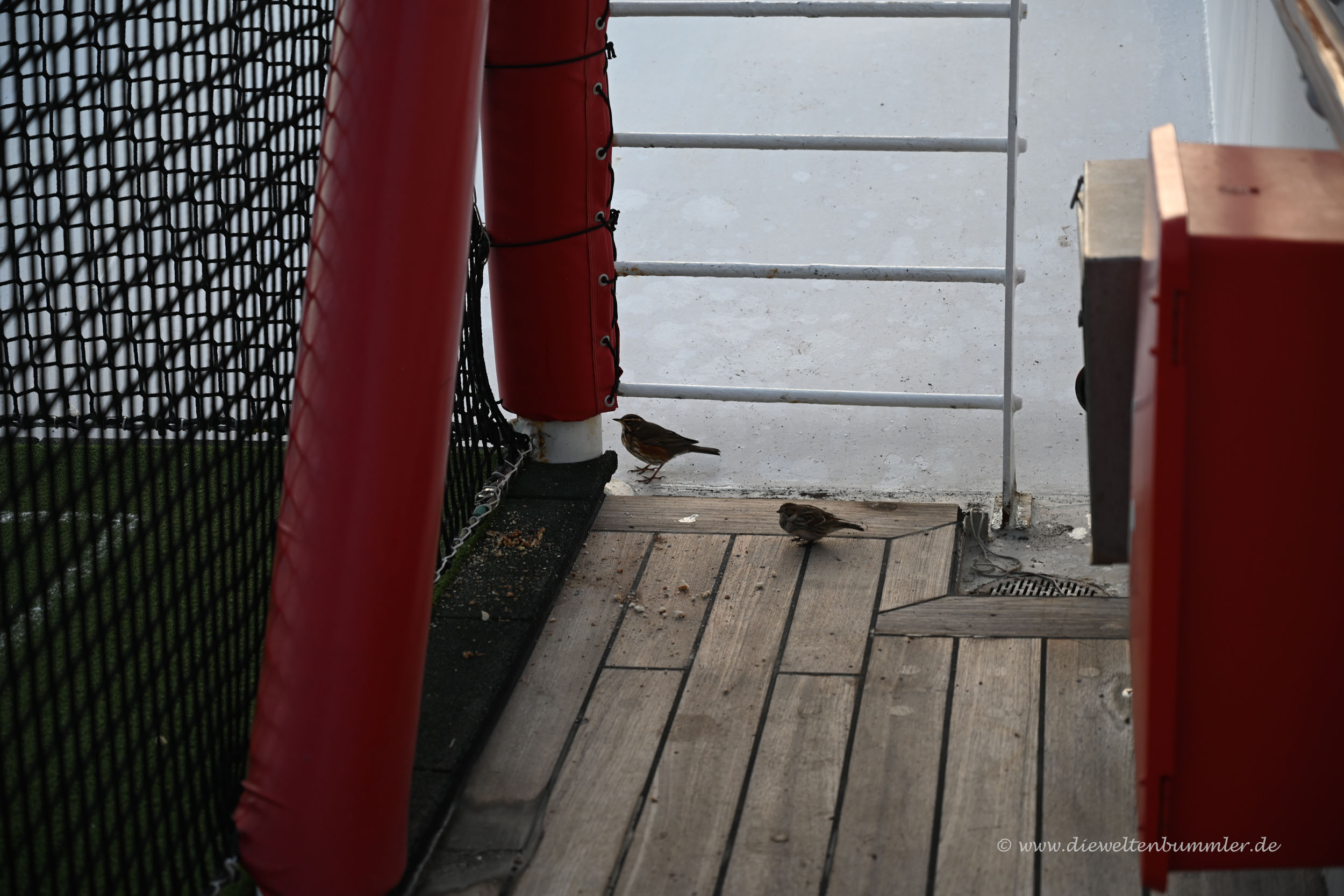 Daher blieben wir an Bord und beobachteten wie die einen von und die anderen an Bord gingen. Außerdem verabschiedeten wir uns gedanklich von den Vögeln, die die Abfahrt in New York verschlafen hatten und die gesamte Überfahrt an Deck verbrachten. Jetzt sind sie in ihrer neuen Heimat Großbritannien.