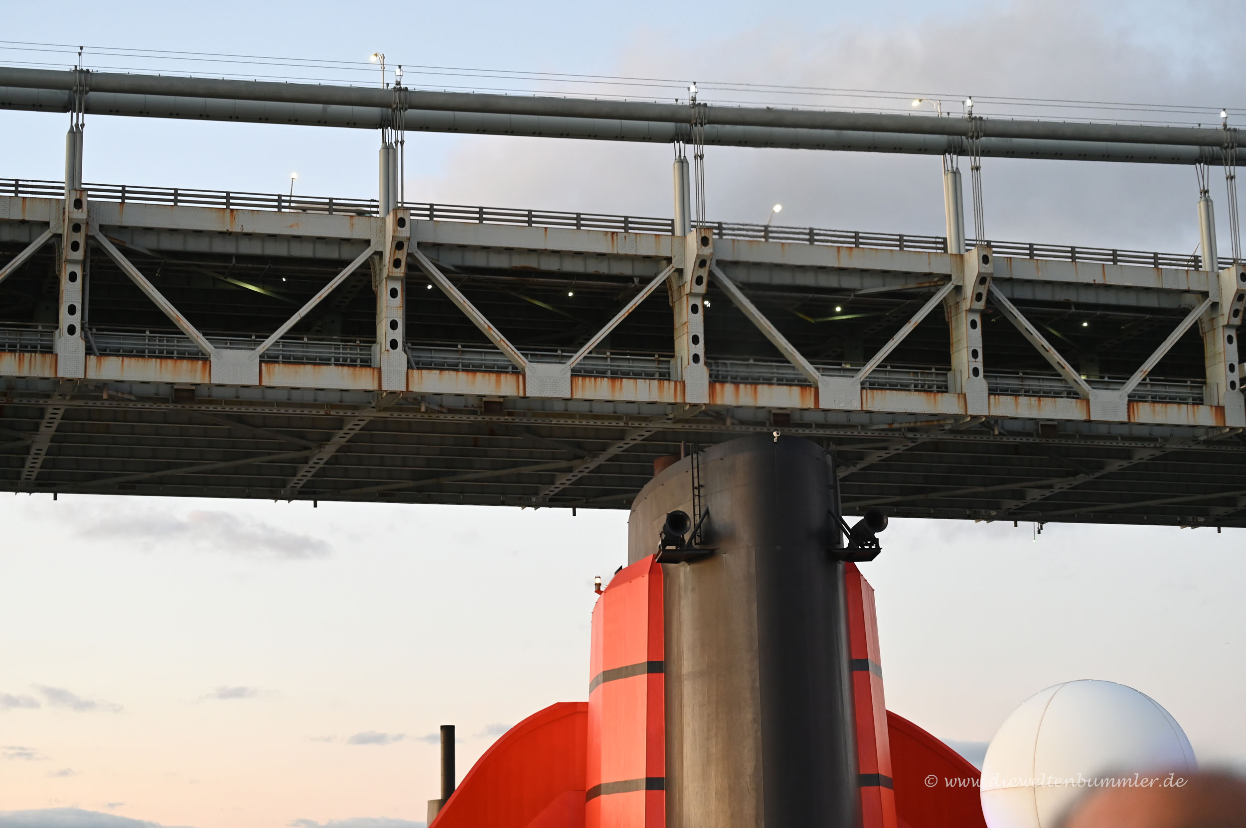 Während der Dämmerung unterquerten wir wie gewohnt mit nur wenigen Metern Abstand die Verrazzano-Narrows-Bridge, auf der wir zwei Tage zuvor noch mit unserem Chevrolet Suburban nach Brooklyn fuhren. Ab hier fühlte es sich endgültig an: Wir waren unterwegs. Im Schein der Abendsonne blickten wir auf Coney Island und verschwanden dann auch so langsam unter Deck. Es wurde Zeit, sich für das Dinner zurecht zu machen.