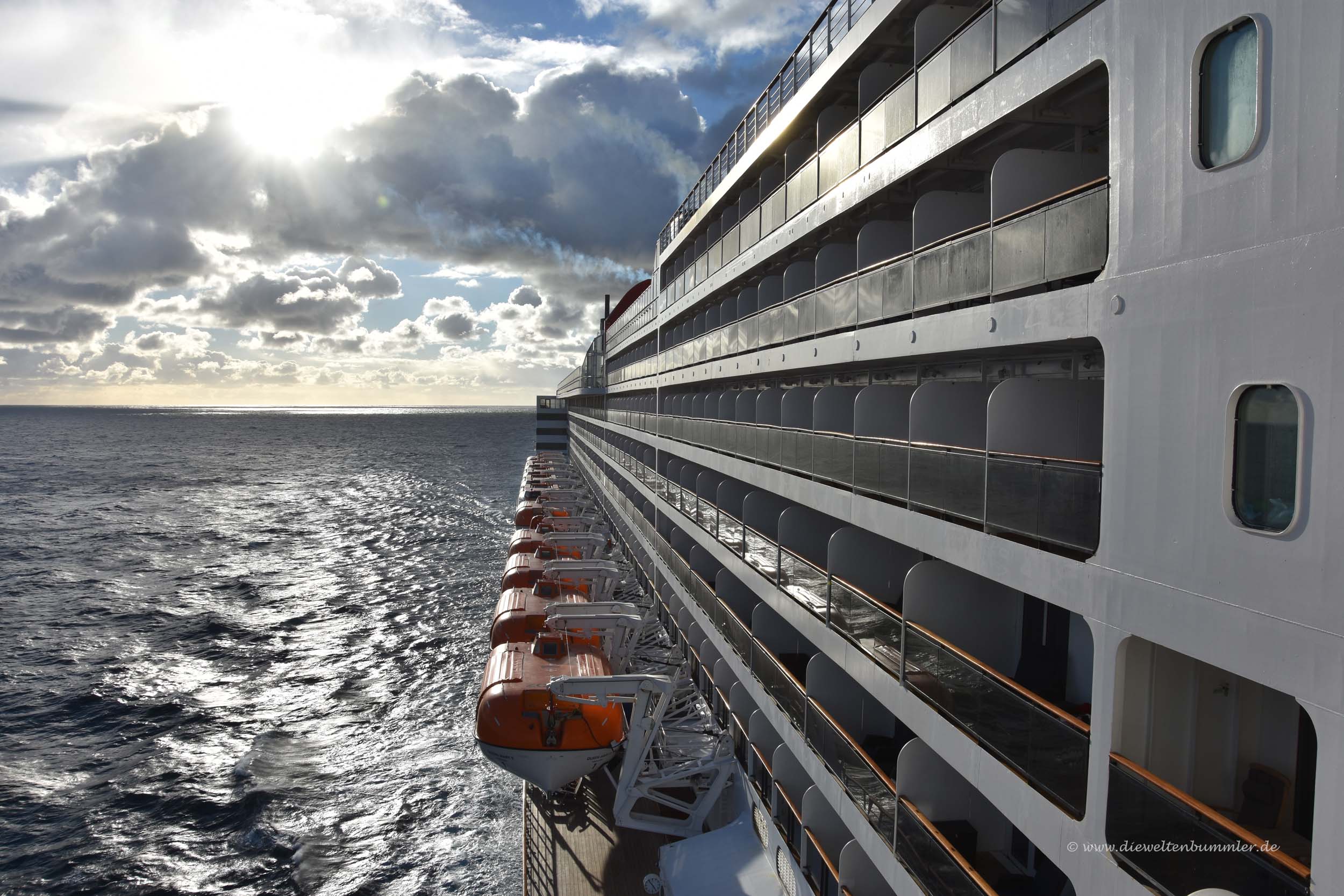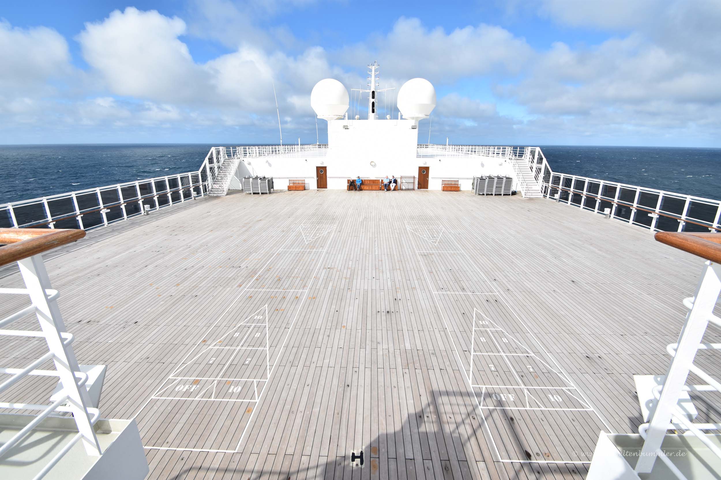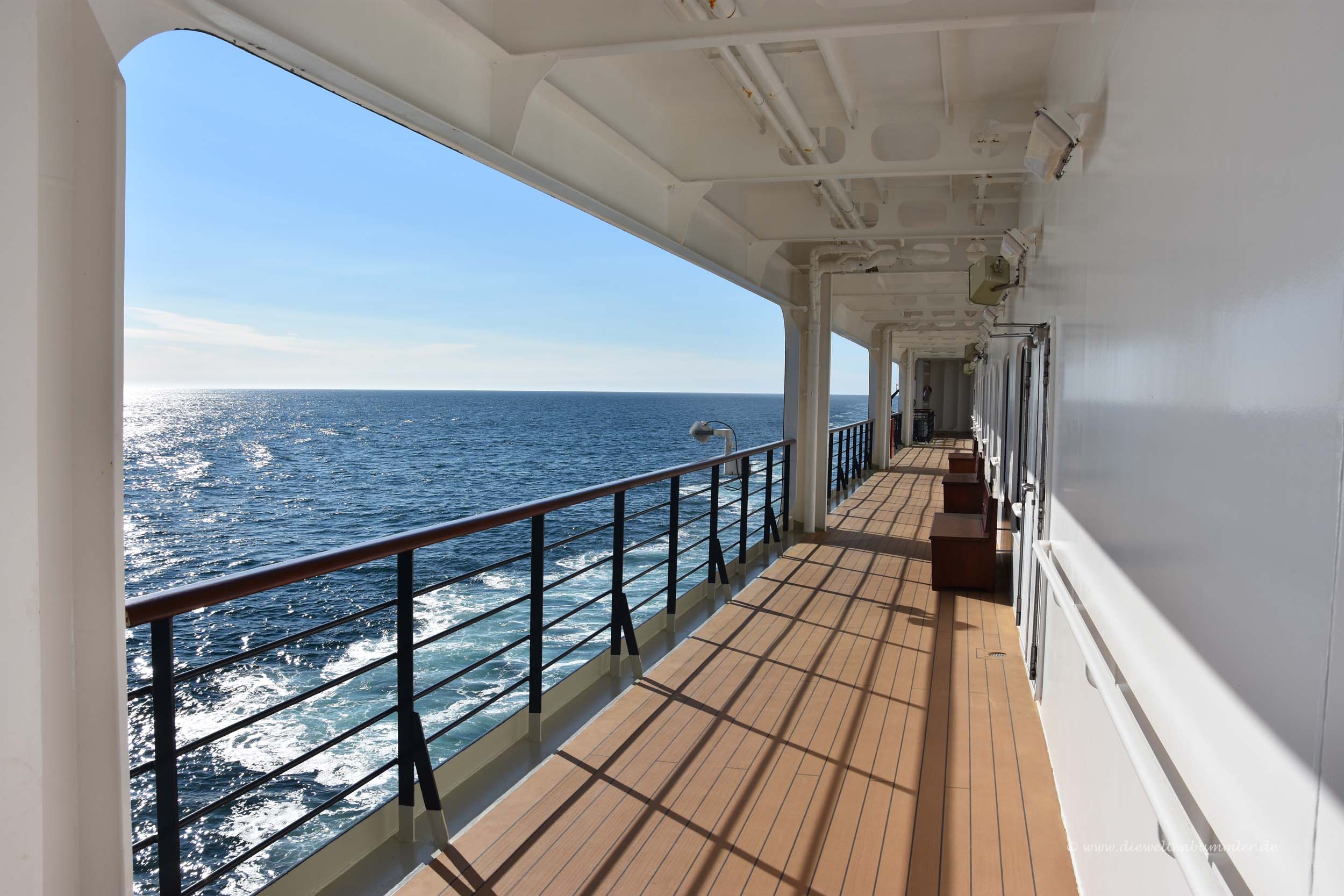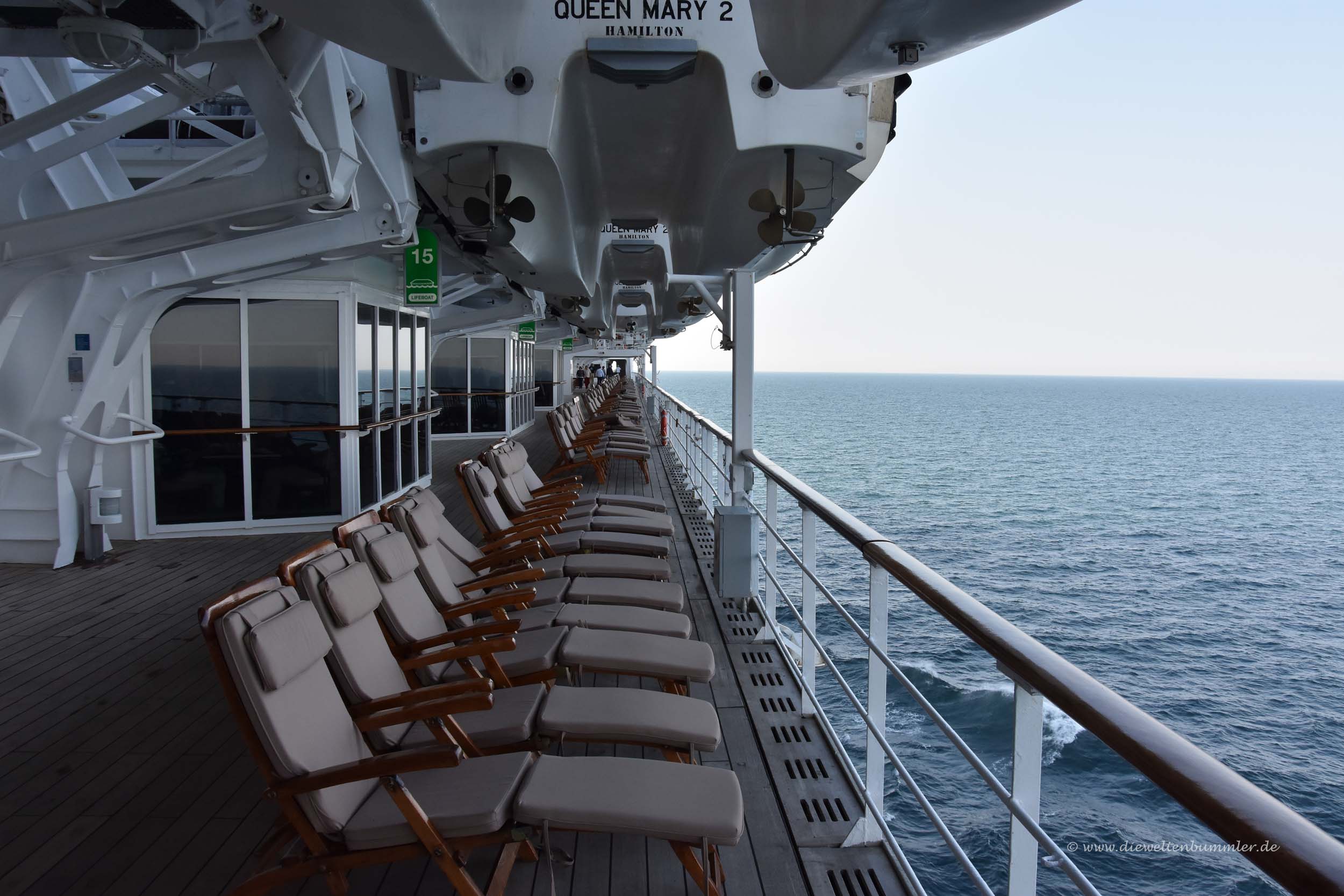 Ganz anders ist es wieder bei der größeren Queen Mary 2. Denn hier gibt es den Rundweg auf dem höher gelegenen Deck 7, der vorne auch noch zu einer Aussichtsplattform führt und außerdem Ausgangspunkt für die beiden Außenfahrstühle am Bug ist.
