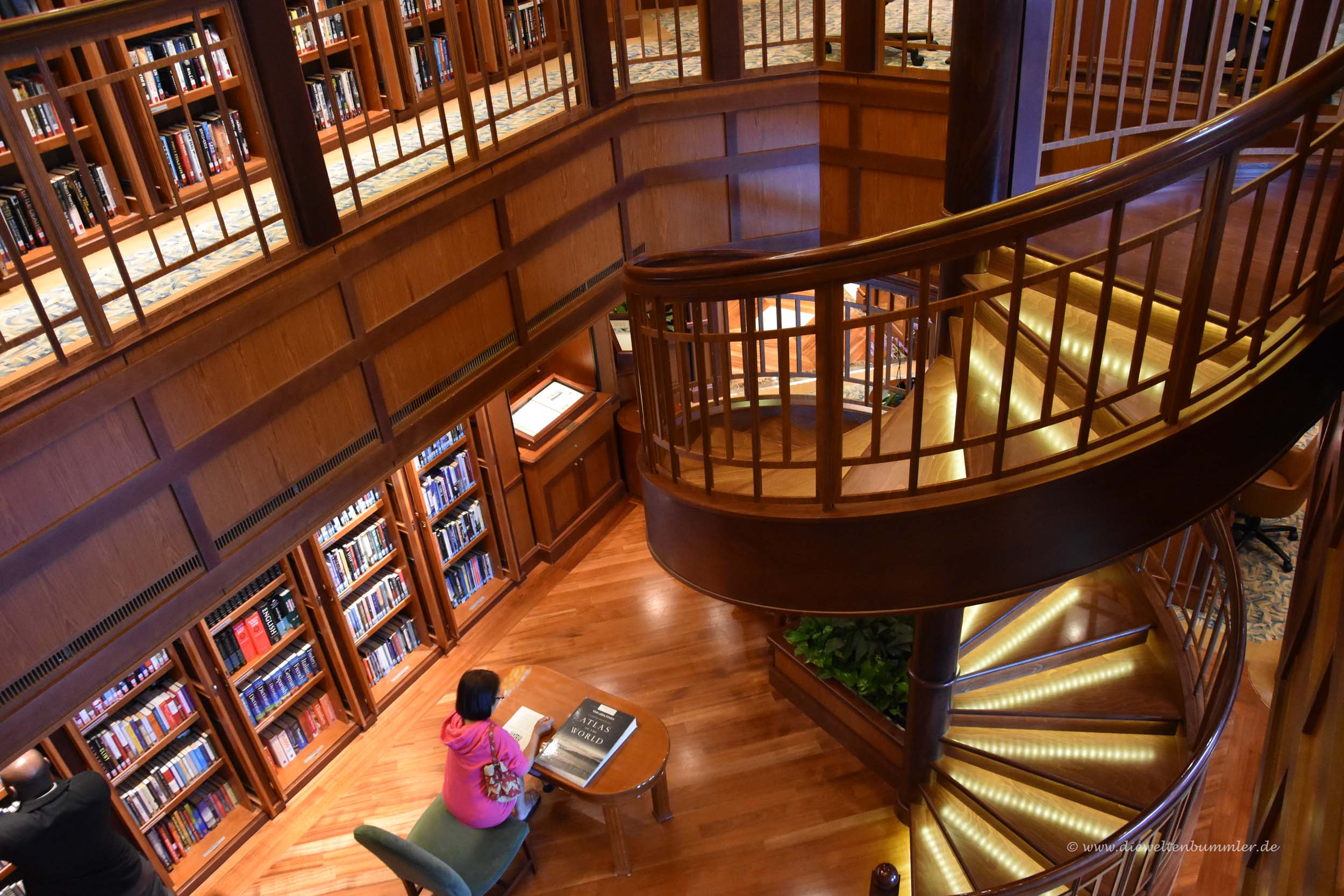 Die Bibliothek auf der Queen Mary 2 ist am Bug von Deck 8 untergebracht. Auf der kleineren Queen Elizabeth ist die Bibliothek eher mittschiffs, erstreckt sich dafür aber auf den beiden Decks 2 und 3. Verbunden sind die beiden Bereiche über eine schöne hölzerne Wendeltreppe.
