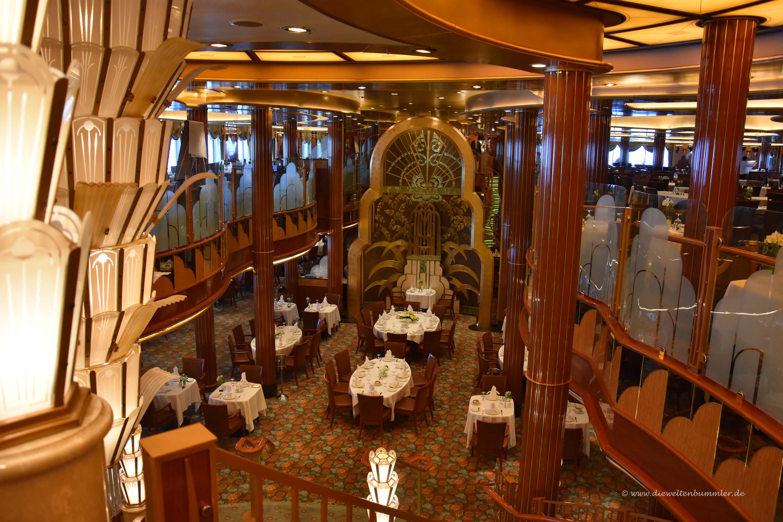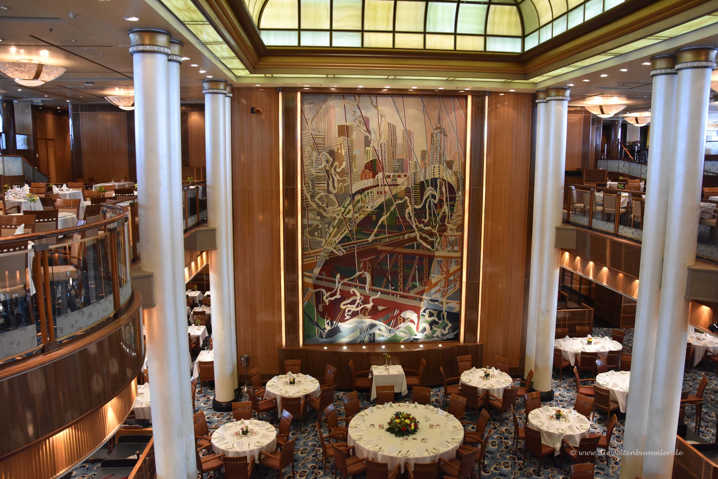 Hier kommt aber eben auch die unterschiedliche Bauweise der Schiffe ins Spiel. Die Queen Elisabeth hat ein relativ steiles Heck während die Queen Mary 2 hinten eben mehrere offene Decks zeigt und dadurch in ihrer Linie sanft abfällt. Daher kann man im Britannia-Restaurant auf der Queen Elizabeth auch ganz hinten sitzen und in das Kielwasser blicken. Das geht auf dem größeren Schiff halt nicht.