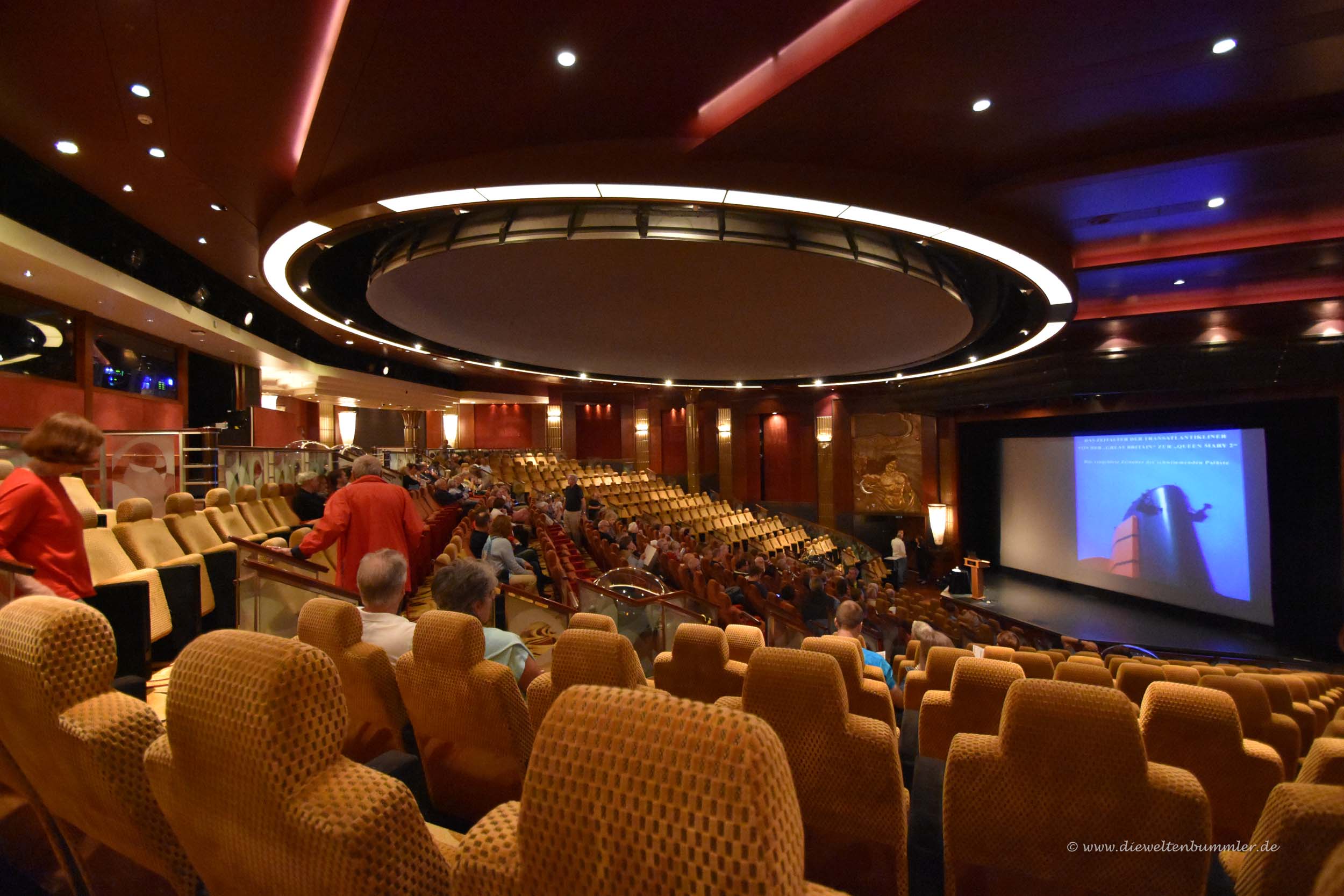Hier werden auch noch Vorträge gezeigt und mehrmals am Tag wird eine große Kuppel hinab gelassen, so dass der Saal als Planetarium dient. Darüber hinaus ist das Illuminations auf der Queen Mary 2 eher der Ort, an dem Kinofilme gezeigt werden.