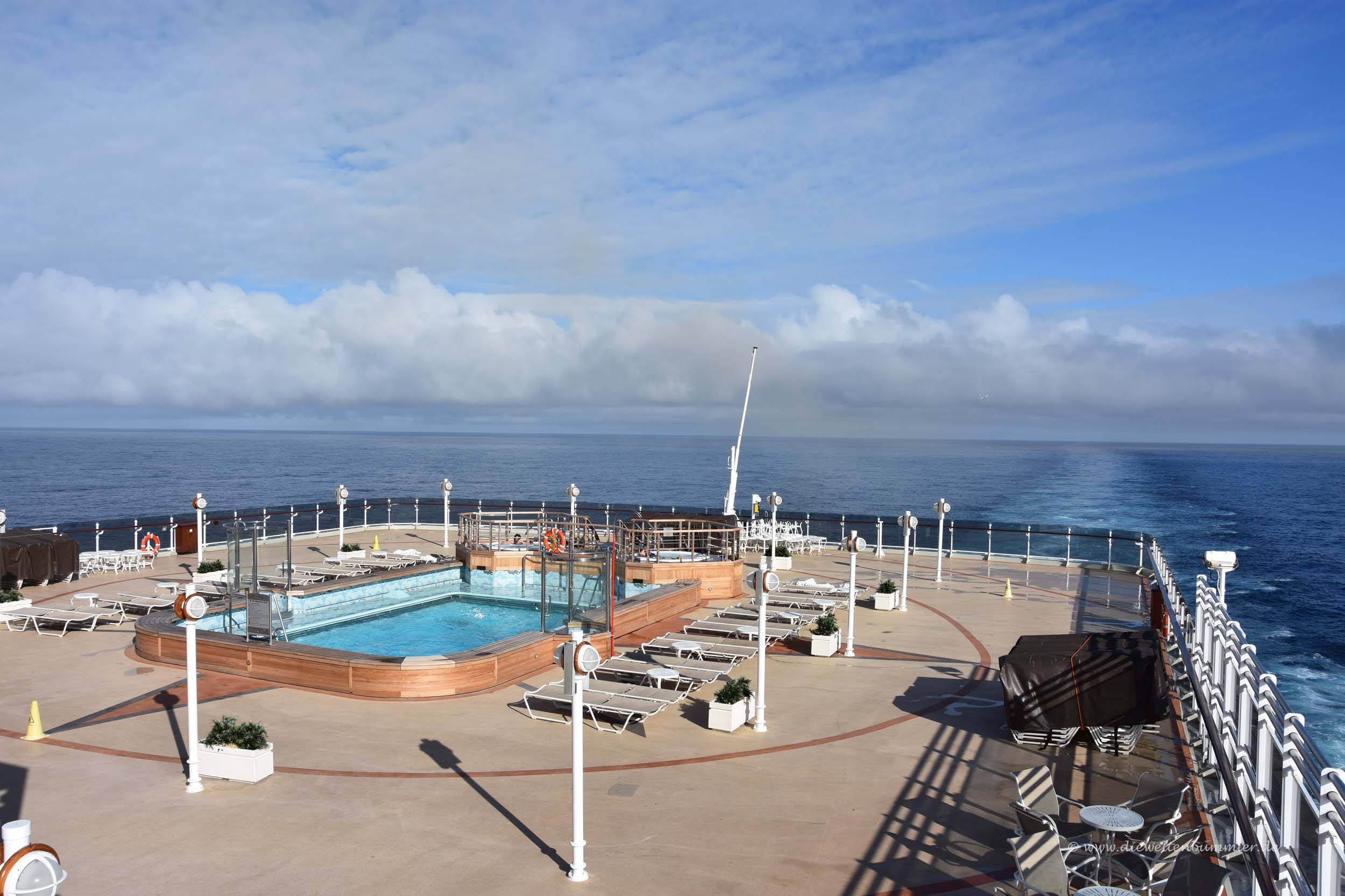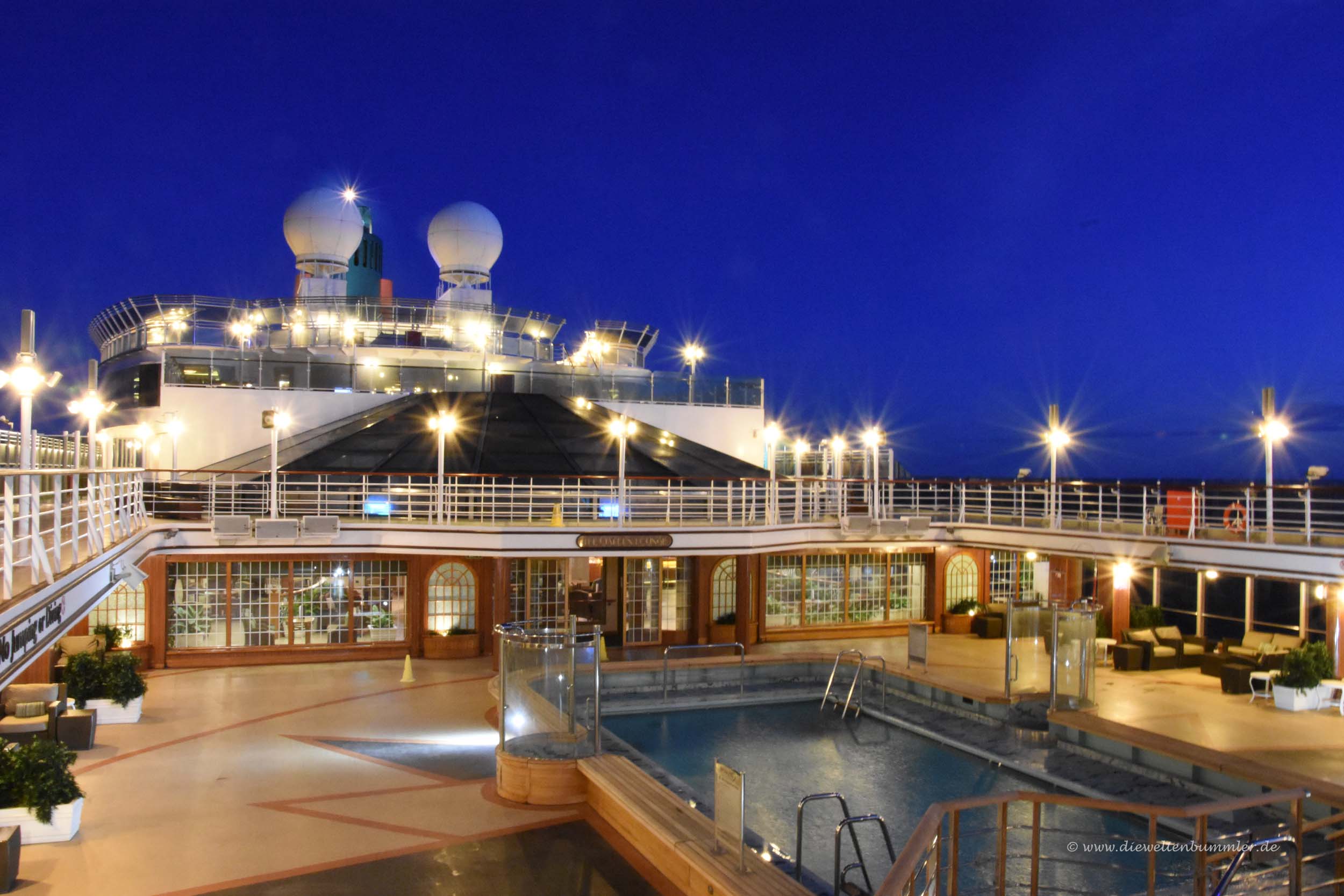 Die Queen Mary 2 ist nämlich zum Beispiel sehr großzügig in ihrem Außenbereich und bietet viel Platz. Außerdem kann man sowohl steuerbord als auch backbord an den Aufbauten vom Bug zum Heck gehen. Das geht auf Deck 9 der Queen Elizabeth so in dieser Form nicht. Denn dafür muss man das Büffetrestaurant durchqueren. Um an dem Restaurant vorbeizugehen, müsste man noch ein Deck höher und dann kann man außen entlang gehen. Klingt kompliziert, aber es ist so, dass der vordere Poolbereich auf der Queen Elizabeth etwas tiefer liegt als die Außenseiten des Schiffes. Man kann dort also nicht am Pool liegen und gleichzeitig aufs Meer blicken. Das geht nur beim hinteren Pool, ebenfalls auf Deck 9. Dazwischen befindet sich aber, wie gesagt, das Büffetrestaurant.