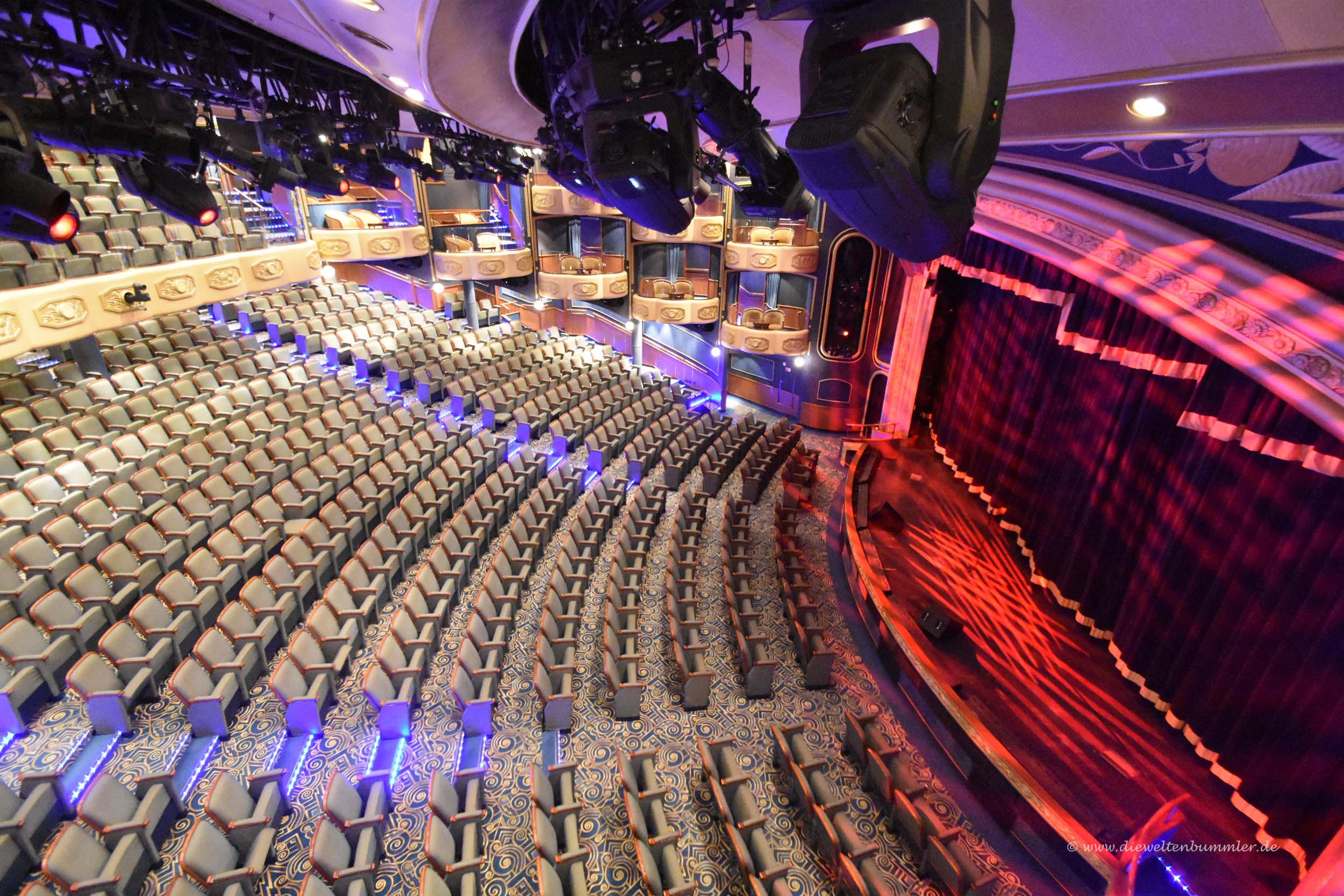 Beide Schiffe haben weiter vorne auf den Decks 2 und 3 außerdem das Royal Court Theatre, das für Vorführungen und Kinofilme genutzt wird. Auf der Queen Elizabeth ist das Theater ganz vorne im Bug. Doch auf der Queen Mary 2 geht es nach vorne sogar noch weiter. Man kann sowohl steuerbord als auch backbord noch an diesem ohne schon großen Theatersaal vorbei gehen, um zum Illuminations zu gelangen. Einen Saal wie das Illuminations gibt es auf der Queen Elizabeth schlicht nicht.