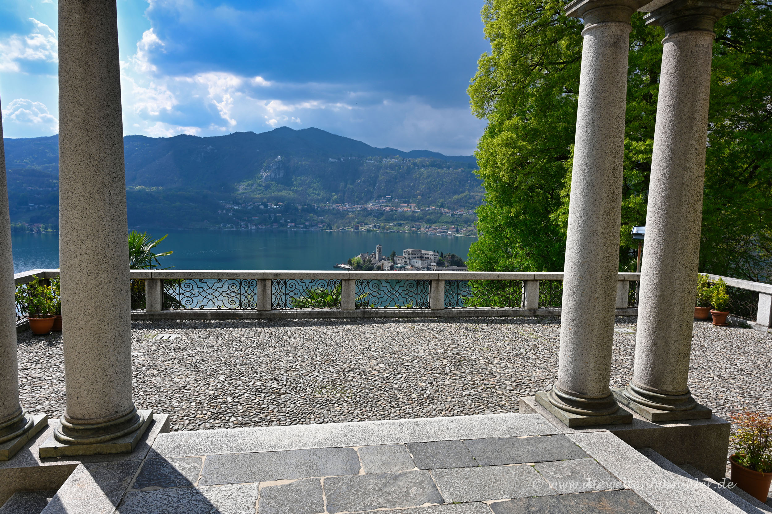 Während man nämlich durch den Wald hinauf wanderte, hat man vom See kaum etwas gesehen. Doch nun, auf der Terrasse vor der Kirche, blickt man auf den Lago d’Orta, der sich weit unterhalb bis zum gegenüberliegenden Gebirgszug erstreckt. Und mittendrin im Wasser zeigt sich die kleine Isola San Giulio.