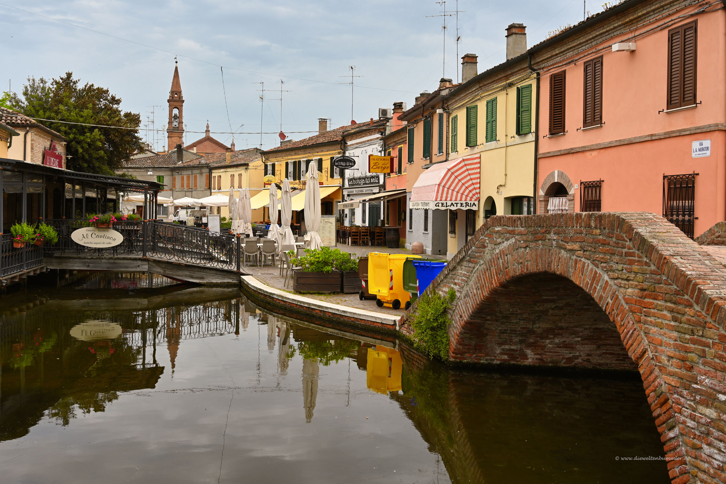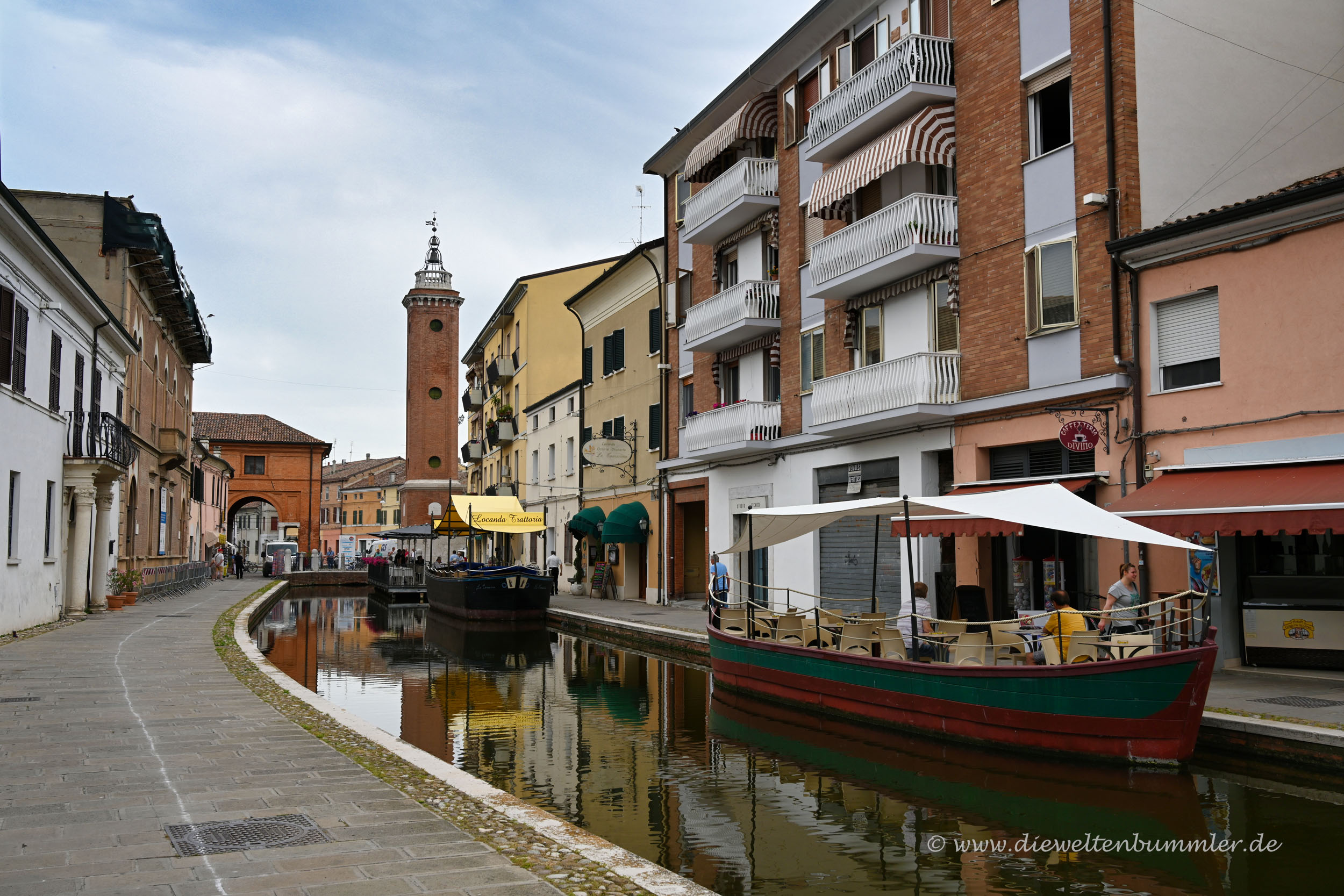 Aber Comacchio besteht nicht nur aus Kanälen bzw. Wasserstraßen. Am deutlich sichtbaren Stadtturm kreuzt sich beispielsweise einer der Kanäle mit einer kleinen, quirligen Einkaufsstraße. Eine Fußgängerzone ist sie nicht, könnte man aber fast meinen.