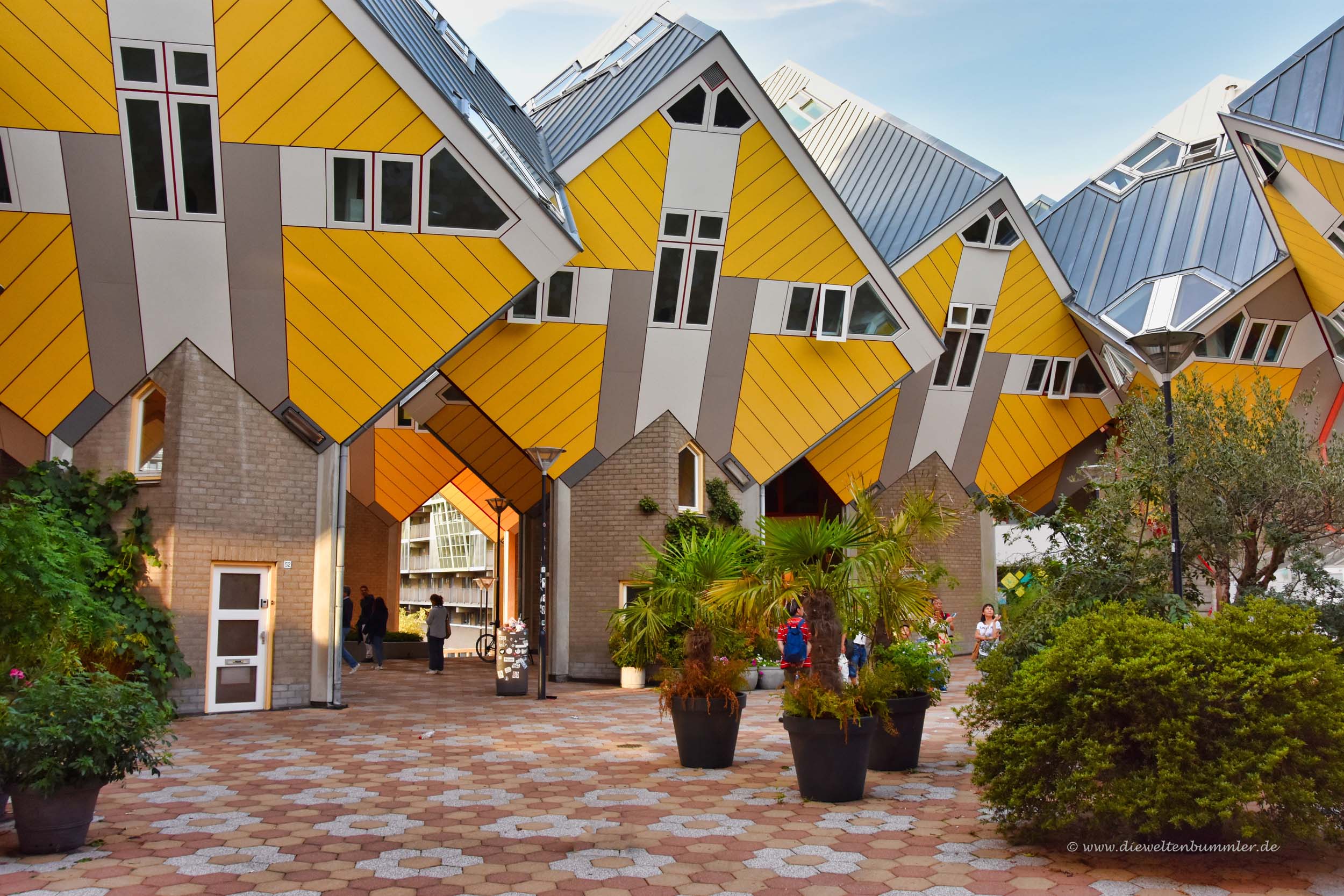 Als Besucher kann man den Fußweg ganz normal benutzen und auf diese Weise halb unter den Kubushäusern umher wandeln. Zusammen ergeben der Fußweg mit seinen kleinen Plätzen, Eingangstüren und Blumenvasen, die liebevoll vor den Häusern stehen, eine große Brücke die wiederum eine Hauptstraße überspannt.