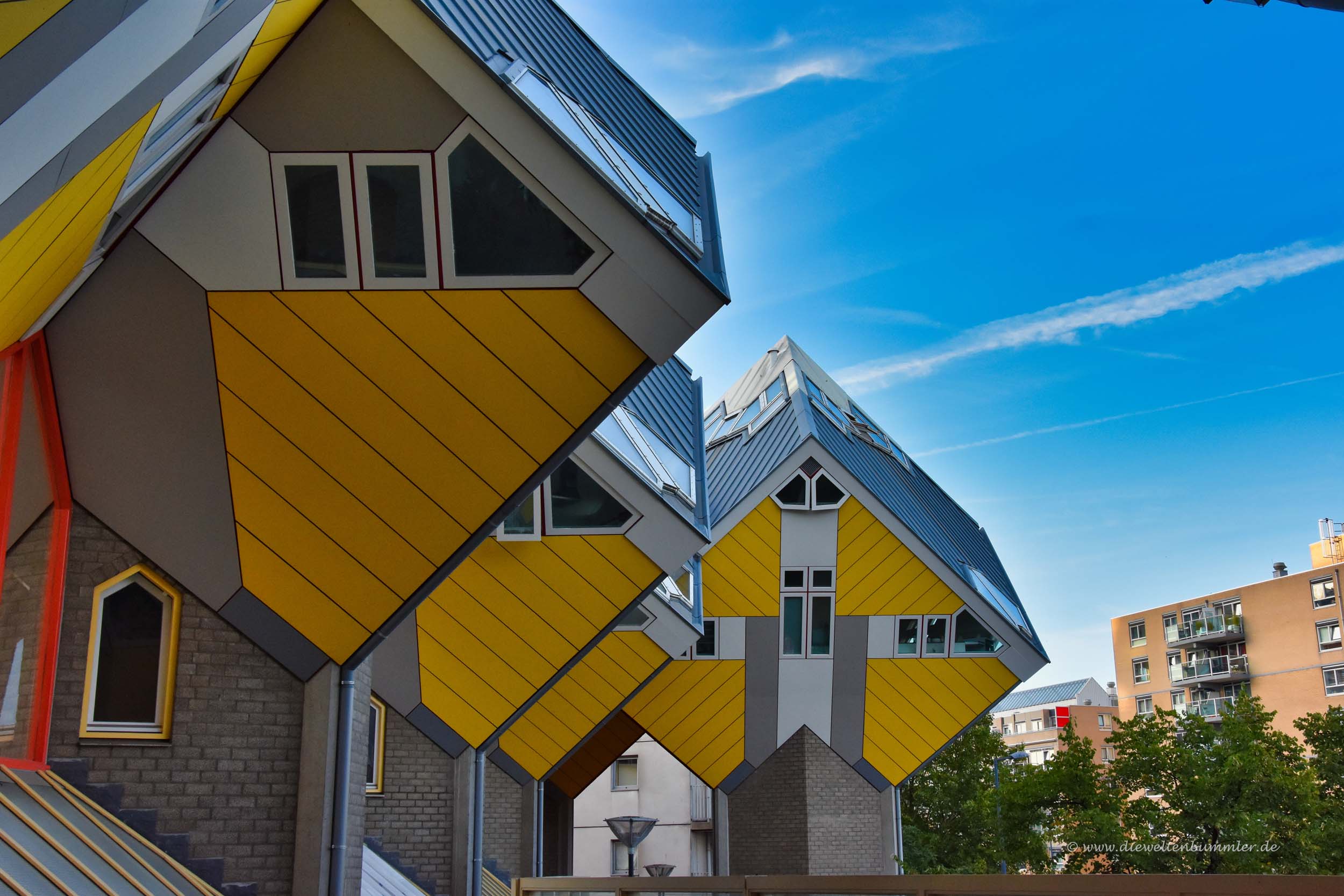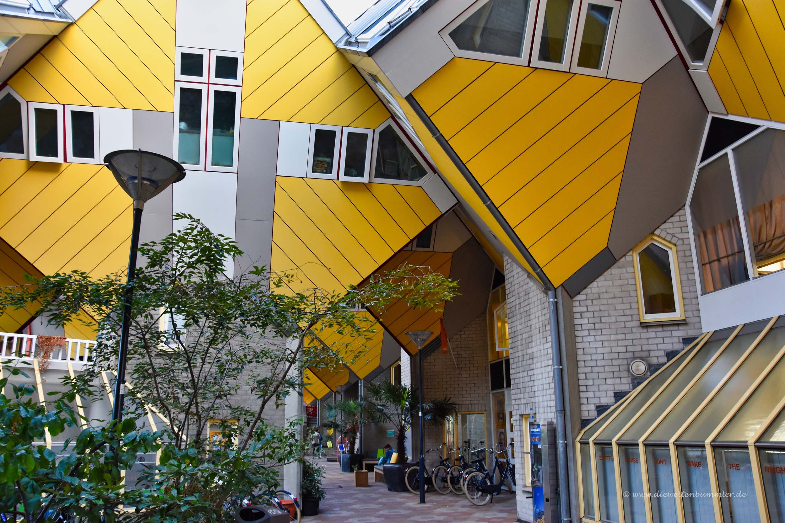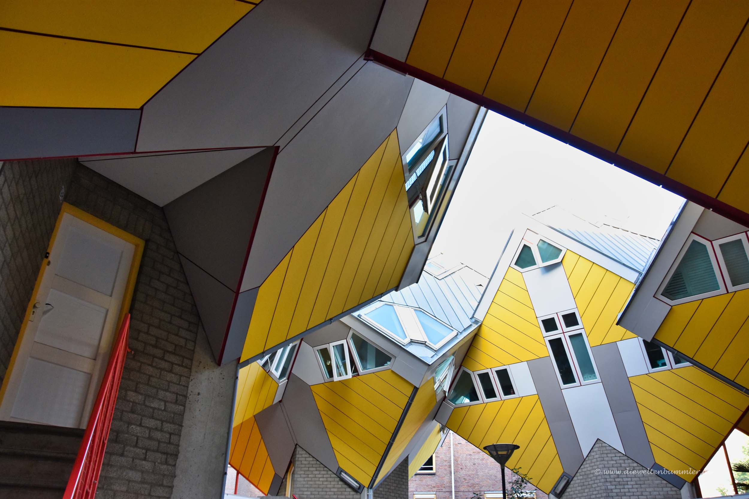 Doch durch die schräge Bauweise zeigen natürlich auch die Fenster sowohl nach unten als auch nach oben. Nach unten blicken die Bewohner der Kubushäuser auf den Fußweg, der sich unterhalb der Häuser befindet. Dort sind entsprechend natürlich auch die jeweiligen Eingangstüren, die durch die Schräglage aber lediglich über eine Treppe erreicht werden können.