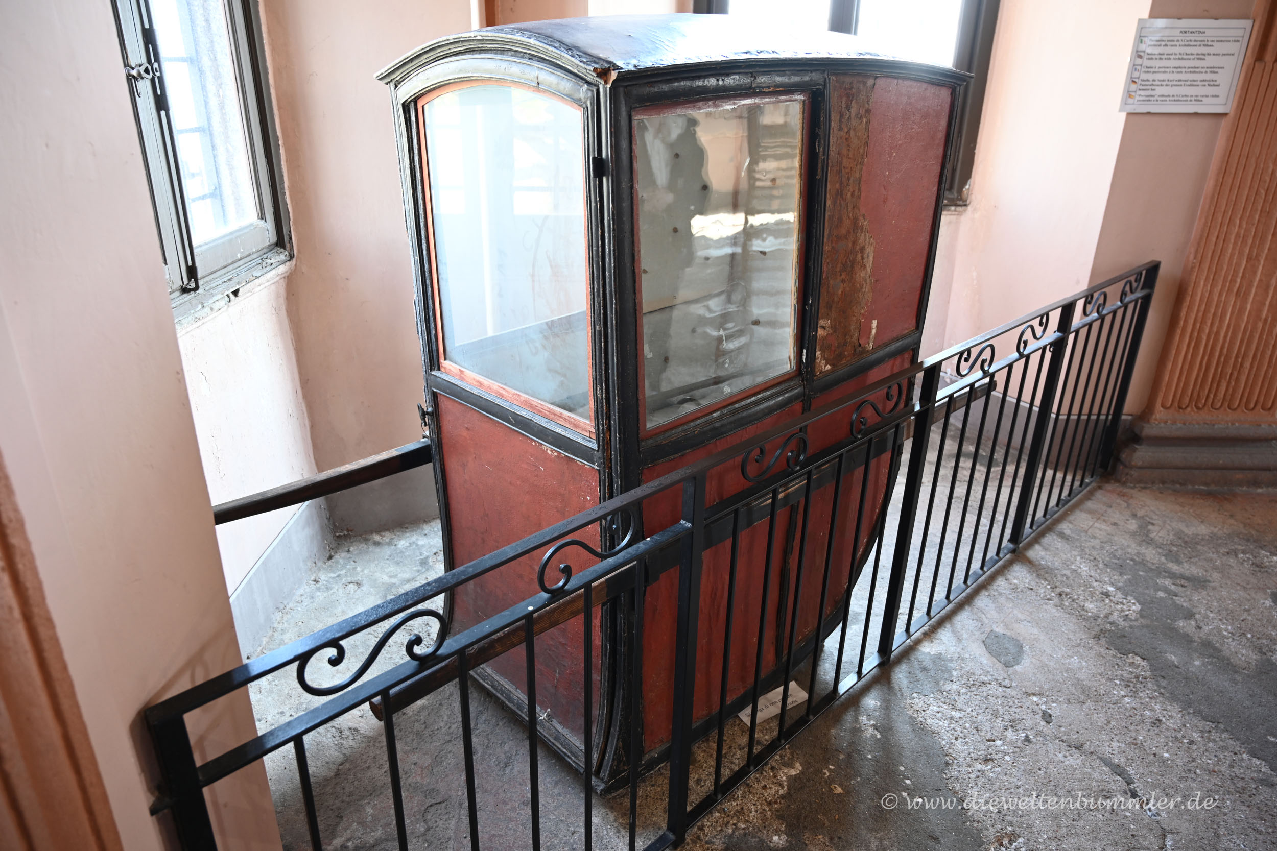 Auf der anderen Straßenseite, gegenüber der Statue, gibt es die kleine, nach ihm benannte Kirche Chiesa San Carlo Borromeo. In ihr ist auch eine kleine Ausstellung zu sehen, in der mir am besten die Sänfte gefallen hat. So eine Sänfte könnte man ja in gewisser Zeit als Vorläufer der ersten Wohnmobile bezeichnen.