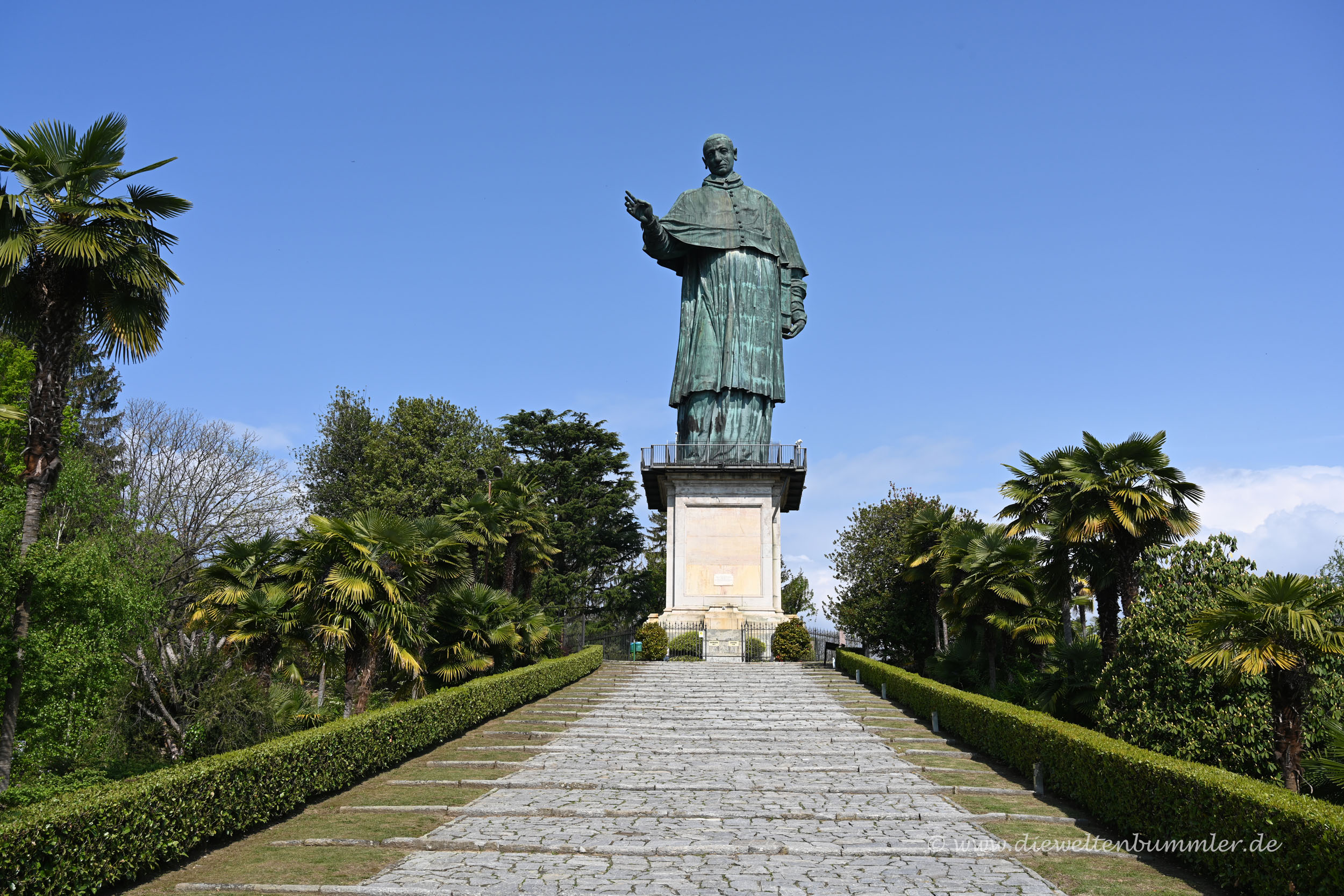 Weitere 19 Jahre später, also bereits im Jahr 1624 errichtete man ihm zu Ehren eine große Statue bei Arona, seinem Geburtsort. Diese Borromeo-Statue steht heute immer noch und hat eine Besonderheit: Sie war Vorbild für den Bau der Statue of Liberty, also der Freiheitsstatue in New York. Denn so wie die französische Dame in New York ist auch die Statue von Carlo Borromeo von innen begehbar. Durch die Augen und Ohren kann man nach draußen blicken.