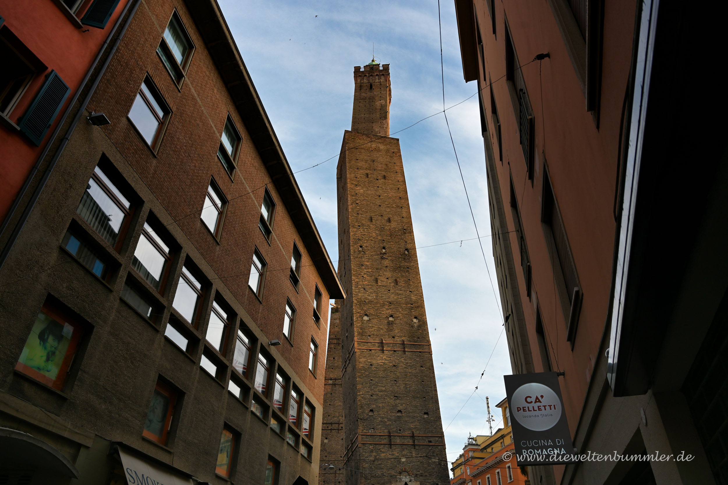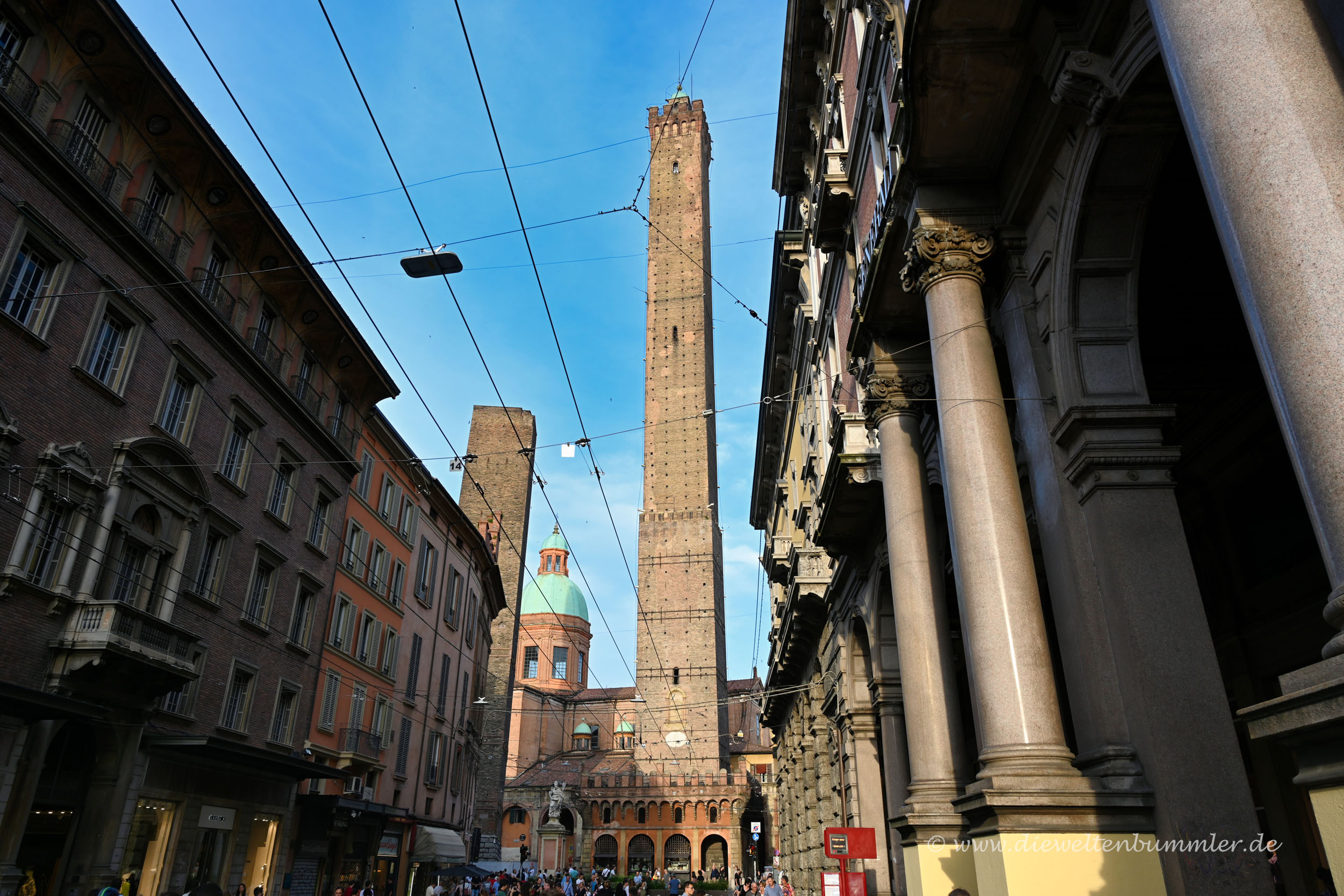 Eine der Hauptsehenswürdigkeiten von Bologna erreicht man jedoch über die Via Rizzoli, die vom Palazzo Re Enzo aus nach Osten führt. Man sieht die Attraktion schon aus der Ferne, denn sie ragt deutlich in den Himmel hoch. Ich rede hierbei von den beiden Türmen Garisenda und Asinelli.