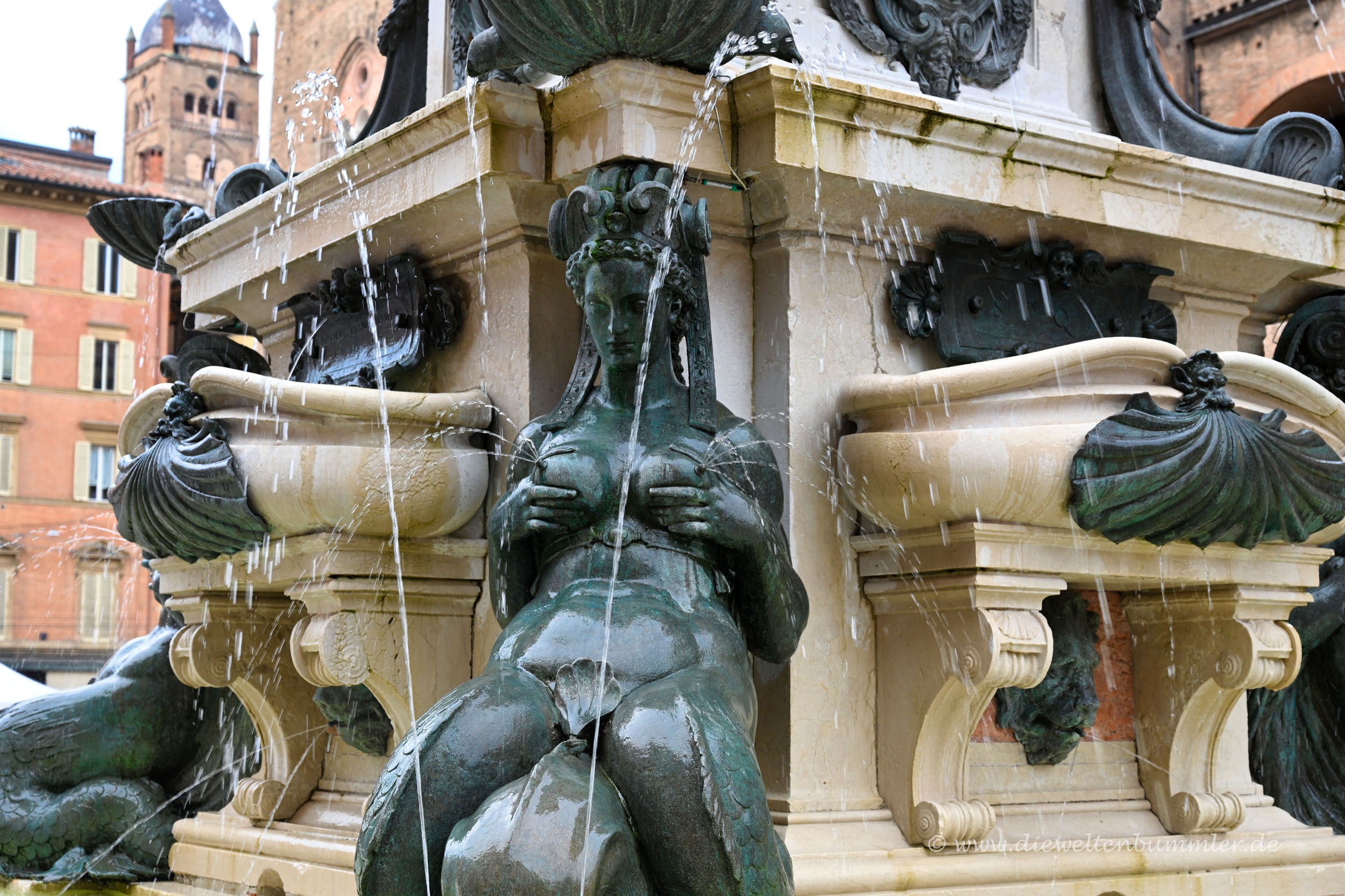 Diesen gibt es erst kurz darauf mit der Piazza Maggiore, aber dabei handelt es sich nicht um die Kathedrale, sondern um die Basilica di San Petronino. Gegenüber der Kirchenfassade, auf der nördlichen Seite der Piazza Maggiore erhebt sich der bereits erwähnte Palazzo Re Enzo. Gleich daneben befindet sich der Neptunbrunnnen, der nicht nur ein beliebter Treffpunkt, sondern auch ein gern fotografiertes Motiv ist. Könnte wohl an den etwas anzüglichen Figuren liegen, die den Brunnen beherrschen.