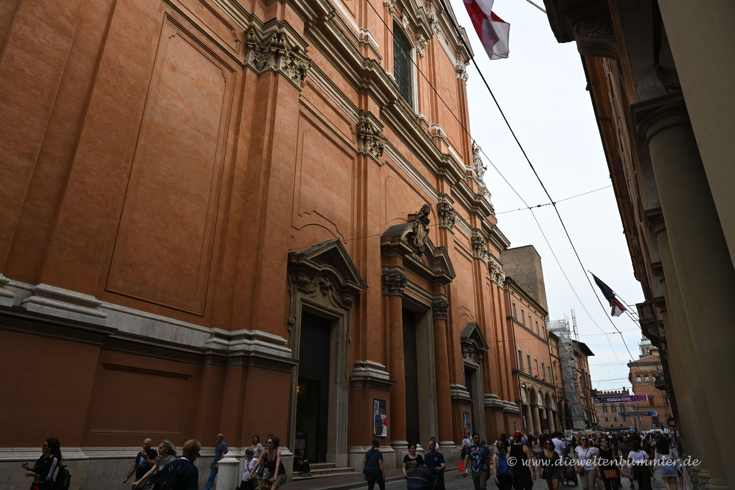 In der größeren Parallelstraße Via dell’Indipendenza gelangt man in das Zentrum der Altstadt. Hier tobt einerseits der Bär und von hier kommt man zu den vielen anderen Sehenswürdigkeiten von Bologna. Zunächst mal kommt man ganz automatisch an der Kathedrale vorbei, die trotz ihrer Größe ein wenig untergehen könnte. Denn es gibt keinen klassischen Kirchenvorplatz.