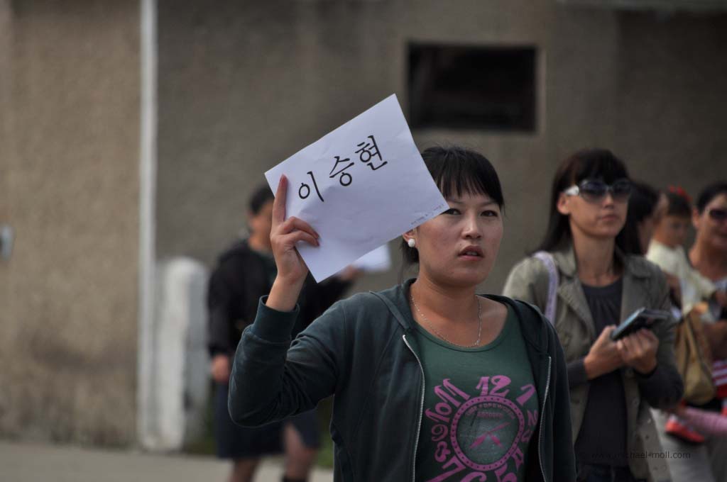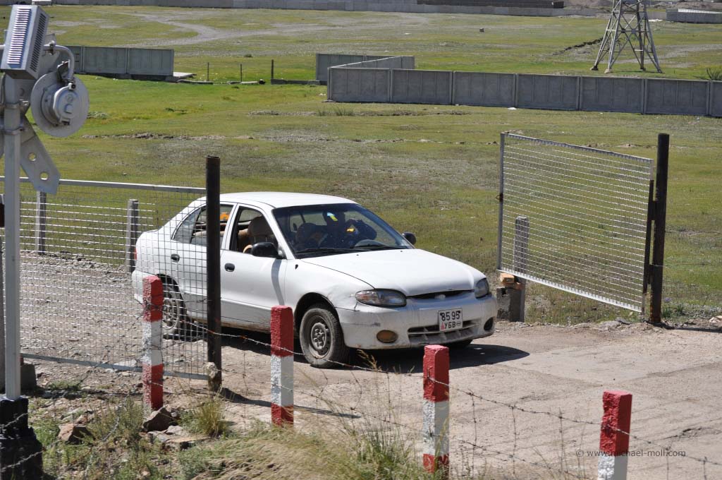 Nachdem der Zug fertig umgerüstet war, konnte die Fahrt weiter gehen. Wir verließen den letzten Bahnhof auf chinesischer Seite und zuckelten langsam der Grenze zur Mongolei entgegen. Beim Verlassen des Bahnhofs standen die chinesischen Grenzbeamten Spalier und aus großen Lautsprechern ertönte zum Abschied eine Hymne, es war jedoch nicht die chinesische. Vielleicht eine lokale Hymne? Es war auf jeden Fall sehr würdevoll, wirkte jedoch auch sehr militärisch.