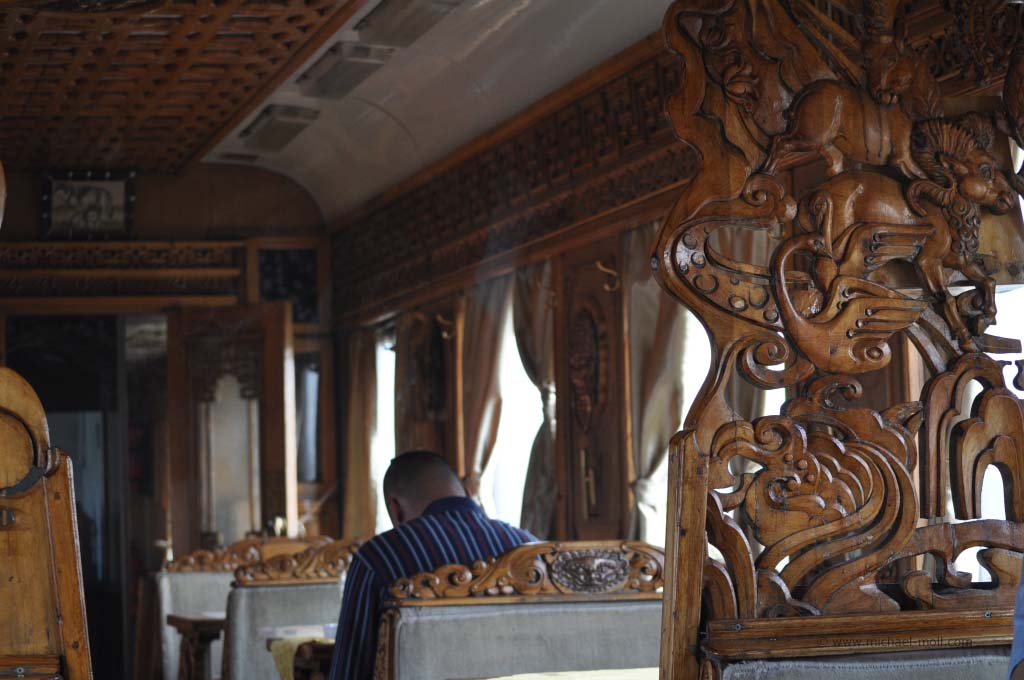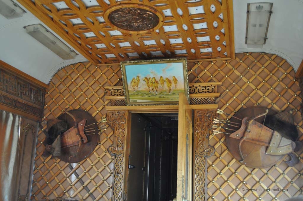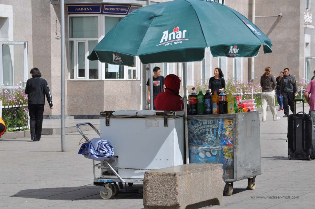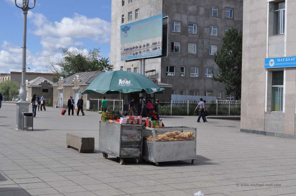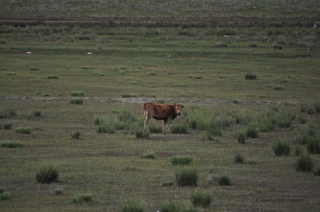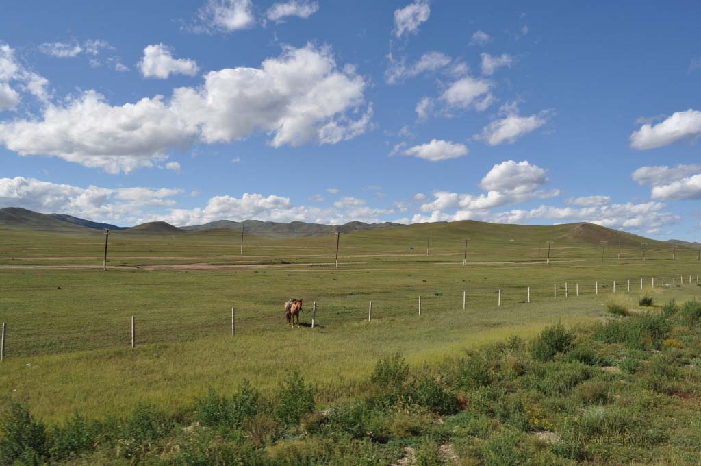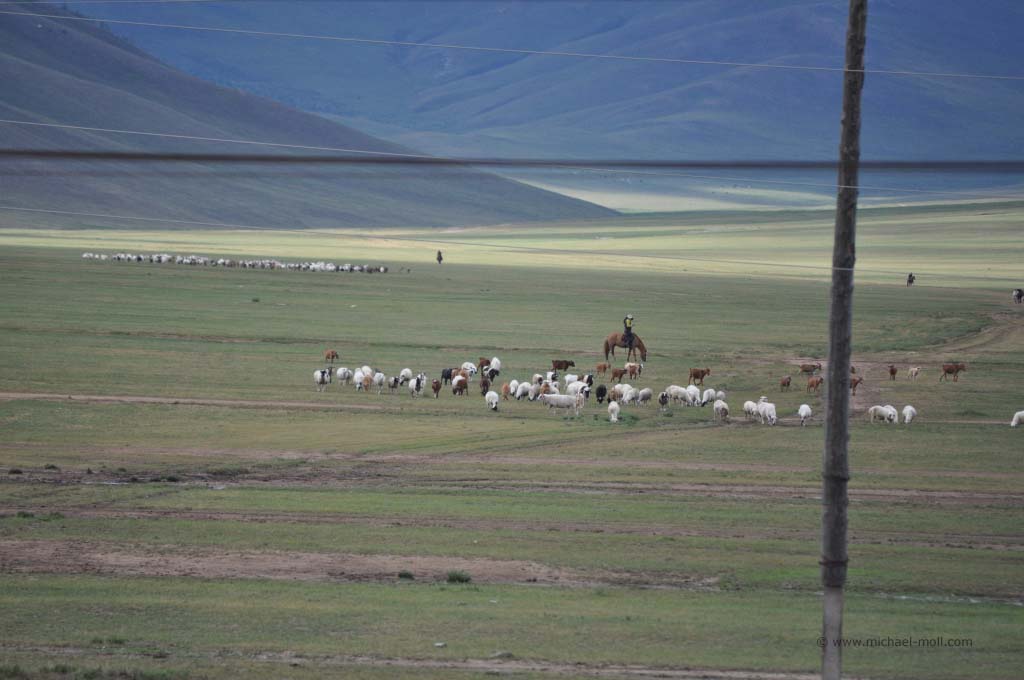Ich habe wirklich den ganzen Tag im Flur gestanden und nach draußen geschaut. Es war einfach nur herrlich. Die Wüste Gobi ging in eine sanfte Berglangschaft über und der Zug fuhr in weiten Kurven durch die grandiose Landschaft. Es folgte die Hauptstadt Ulaan Bator und ein enges Tal, in dem sich nur ein Fluss mit kleinen Auen sowie unser Eisenbahngleis befanden. Die typischen Jurten der Nomaden zogen an uns vorüber und arme Landwirte kümmerten sich um das Vieh, wobei sie cowboyhaft auf einem Pferd saßen. Wüsste man es nicht besser, würde man glauben, in einem Wildwest-Film zu stecken. Doch bei aller Schönheit der Landschaft sah man auch die Armut des Landes und es gab einem schon zu bedenken, dass man hier in einem luxuriösen Zug mit eigenem Badezimmer fährt, während die Menschen dort draußen in einen einfachen Zelten lebten.