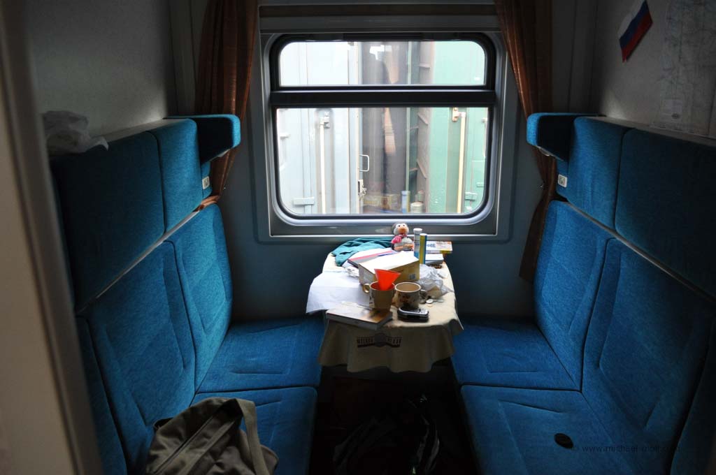 Zwei Sitzbänke mit blau-grüner Polsterung standen sich gegenüber. Dazwischen, unterhalb des mit dünnen Vorhängen verzierten Fensters ein Tisch. Auf diesem wiederum eine Tischdecke in Beige, am Rand mit der kyrillischen Aufschrift Moskau-Peking bedruckt. Über der Schiebetür, die von innen komplett verspiegelt war, hing ein Flachbildschirm. Dahinter befand sich ganz offensichtlich Stauraum, in dem sich zu dem Zeitpunkt die Kissen für die Nacht befanden. Wir saßen uns gegenüber, umgeben von unserem Gepäck und staunten. Dies alles machte einen sehr modernen Eindruck und übertraf unsere Erwartungen.