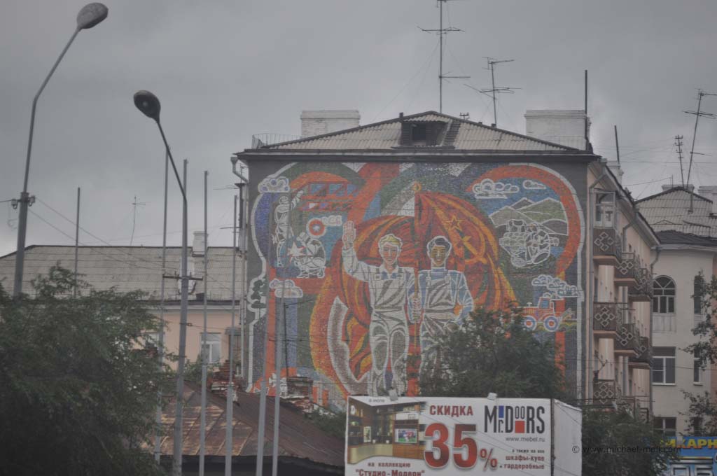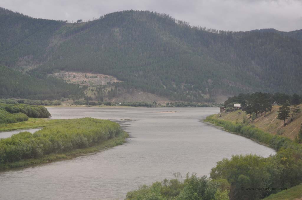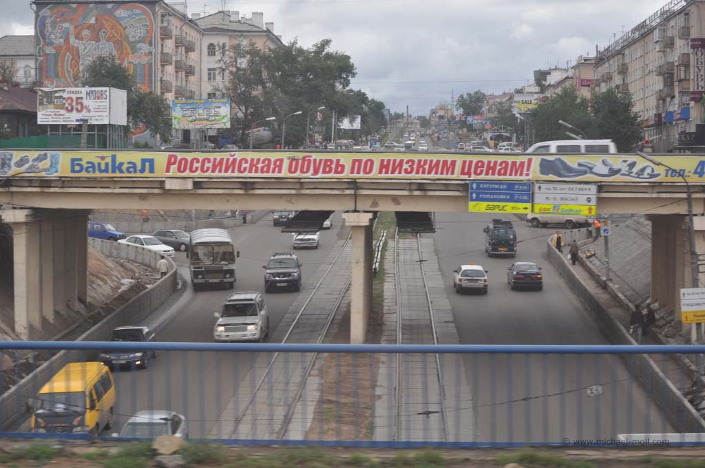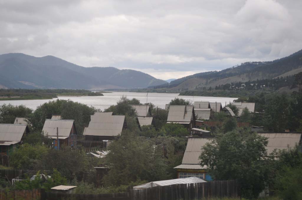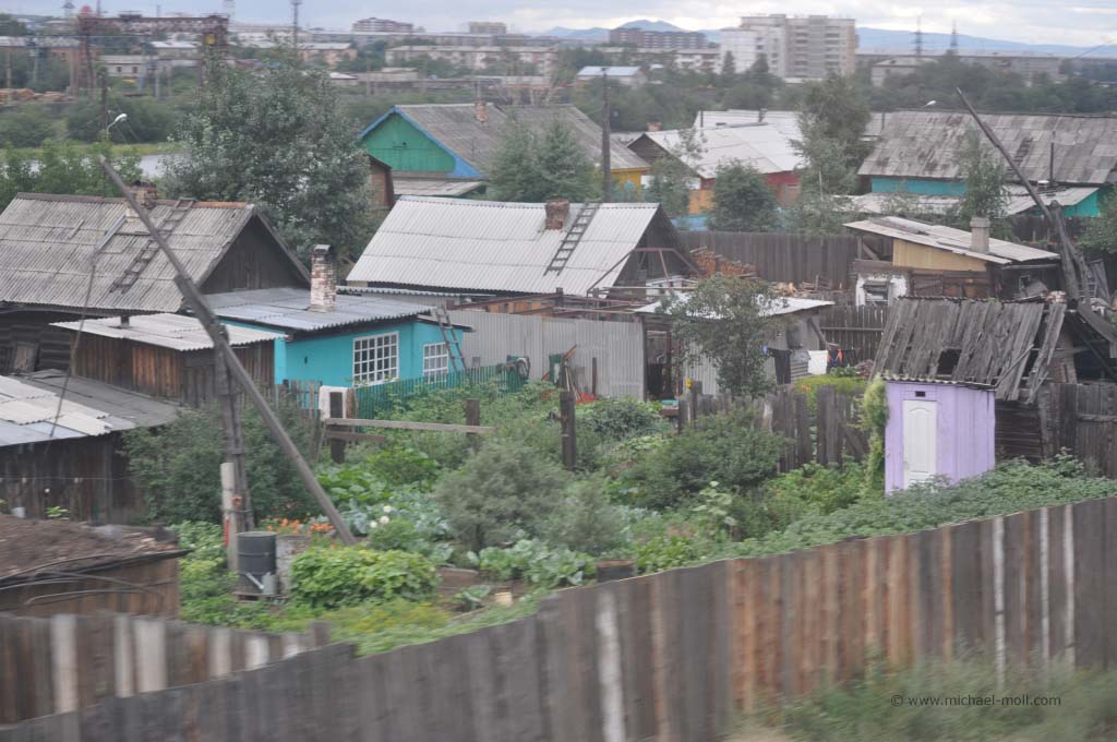 Bis es aber soweit war, passierten wir vorher noch den legendären Baikalsee. Das südliche Ende dieses tiefsten Sees der Welt liegt malerisch an einer Bergkette. Zwischen den Hügeln hindurch, fahren wir durch zwei kleine Tunnel, die ersten seit Moskau, und erblickten plötzlich den Baikal von etwas oberhalb. Langsam fuhr der Zug bergab, bis wir bei der Ortschaft Sljudjanka fast auf Seehöhe waren. Sljudjanka erinnerte uns rein optisch irgendwie an die südlichste Stadt der Welt – Ushuaia in Argentinien. Vielleicht liegt es aber auch daran, dass wir den Eindruck bekamen, am Ende der Welt zu sein, so wie es Ushuaia immer von sich behauptet.