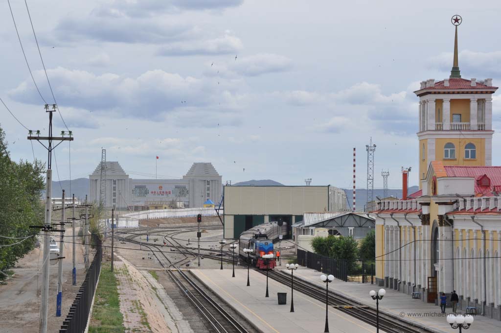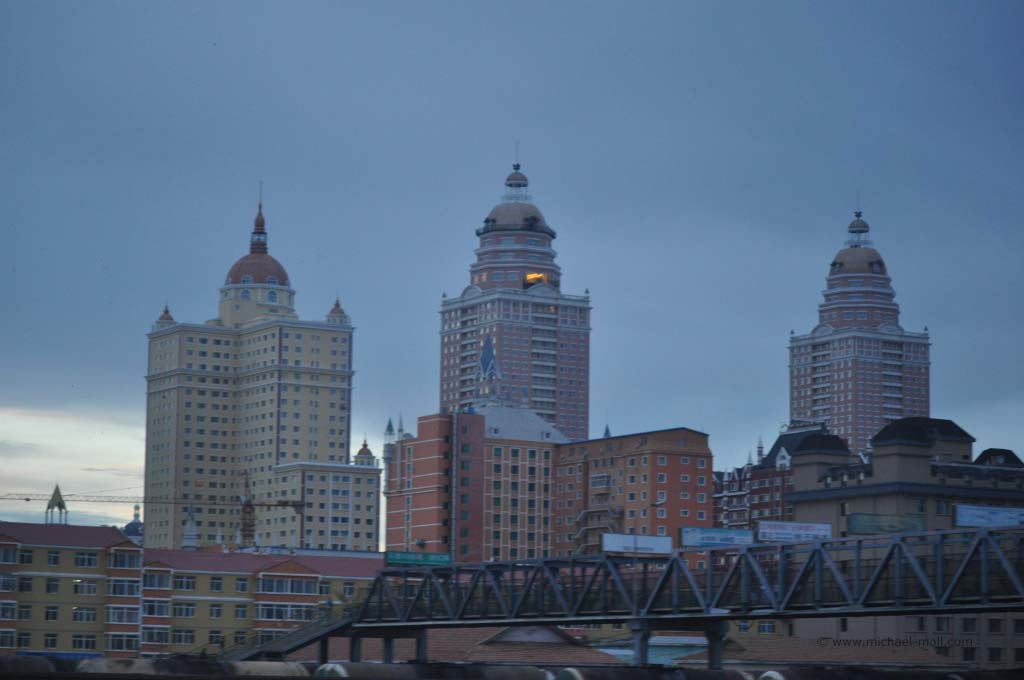 In Manjur (Manzhouli) auf chinesischer Seite sah es nicht viel anders aus. Nach Ankunft auf dem Bahnsteig betraten chinesische Zöllner den Zug und sammelten die Pässe ein. Moni und ich wurden nach unserem Beruf gefragt. Hier wurde ich dann doch etwas nervös. Wussten sie vielleicht doch, was ich mache? Die Angabe meines Nebenjobs reichte aber vollkommen aus. Bei Moni wurde es etwas lustiger. Ihr Englisch ist nicht ganz so ausgefeilt, weshalb sie sich ein wenig verhaspelte. Als dann endlich feststand, dass sie Sprachlehrerin ist (teacher for language) lockerte ich die Runde auf: „But not for English“ und hatte damit die Lacher der ohnehin schon freundlichen chinesischen Grenzkontrollen auf meiner Seite.