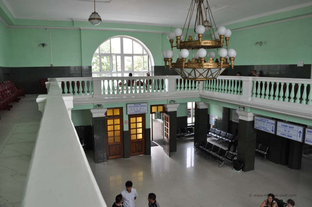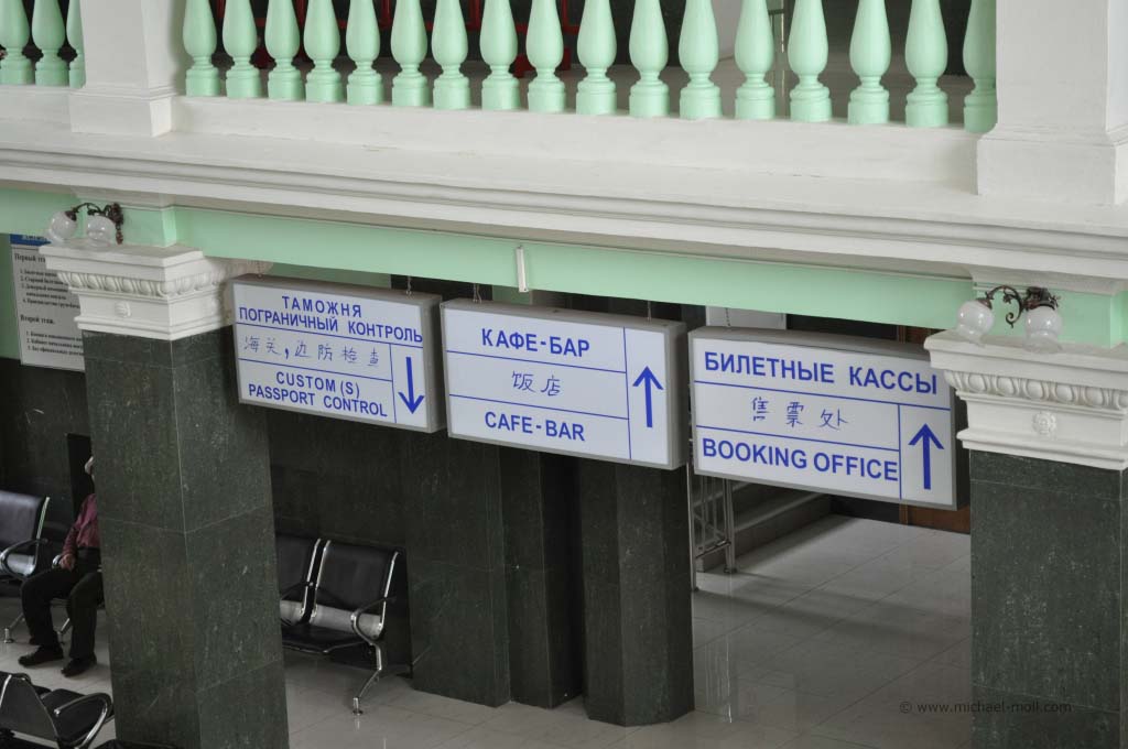 Nach der Passrückgabe durften wir den Zug für zwei Stunden verlassen. In dieser Zeit wurde der chinesische Speisewagen angekoppelt. Den Bahnhof durften wir dennoch nicht verlassen, lediglich die Bahnhofshalle konnte betreten werden. Dort gab es einige ältere Chinesinnen, die schwarz Geld tauschten und in der ersten Etage eine große Halle, in der an der Seite hinter milchgetönten Scheiben allerlei Produkte verkauft wurden. Die ausgebreiteten Schlafdecken auf den Sitzbänken deuteten darauf hin, dass die Verkäufer lange auf uns gewartet hatten. Immerhin sind die Passagiere aus unserem Zug die einzigen gewesen, die sich in der Halle aufhielten. Von Wodka, Keksen und Würstchen gab es bis zu Wolldecken alles Mögliche, was man an Reiseutensilien benötigen oder auch nicht benötigen könnte. Wir entschieden uns für eine überteuerte Flasche Coca-Cola, welche mich aber mehr wegen der Schriftzeichen darauf ansprach.