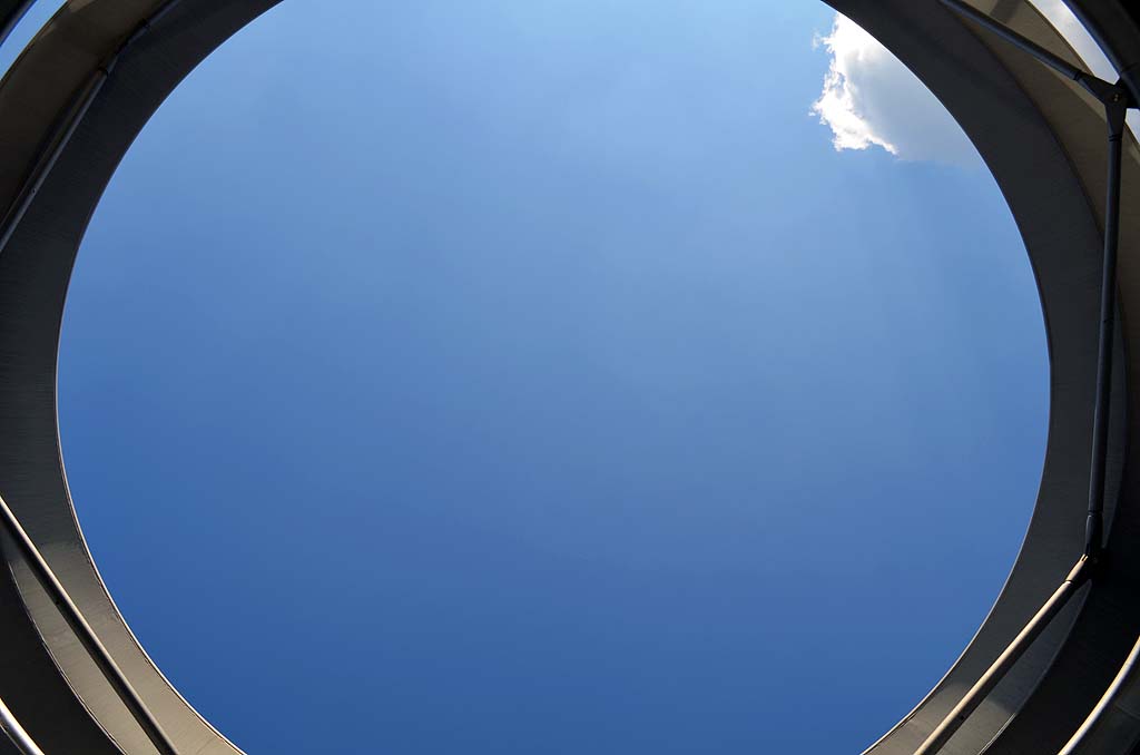 Oben angekommen gab es schon die nächsten Infotafeln – nämlich über die Geschichte des Reichstagsgebäudes. Danach gingen wir langsam den Gang hinauf bis zur obersten Ebene, wo es eine große Sitzbank gibt. Wir machten es uns gemütlich und schauten nach oben, wo wir etwas überrascht wurden. Uns war nicht bewusst, dass die Kuppel auf dem Reichstag nach oben hin offen ist. So lernt man eben auf Reisen.