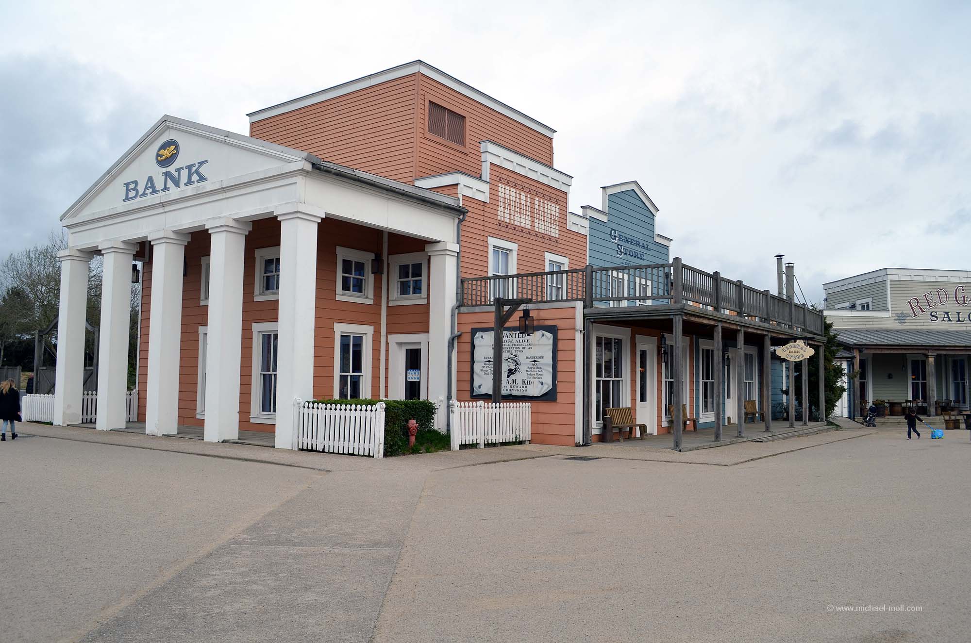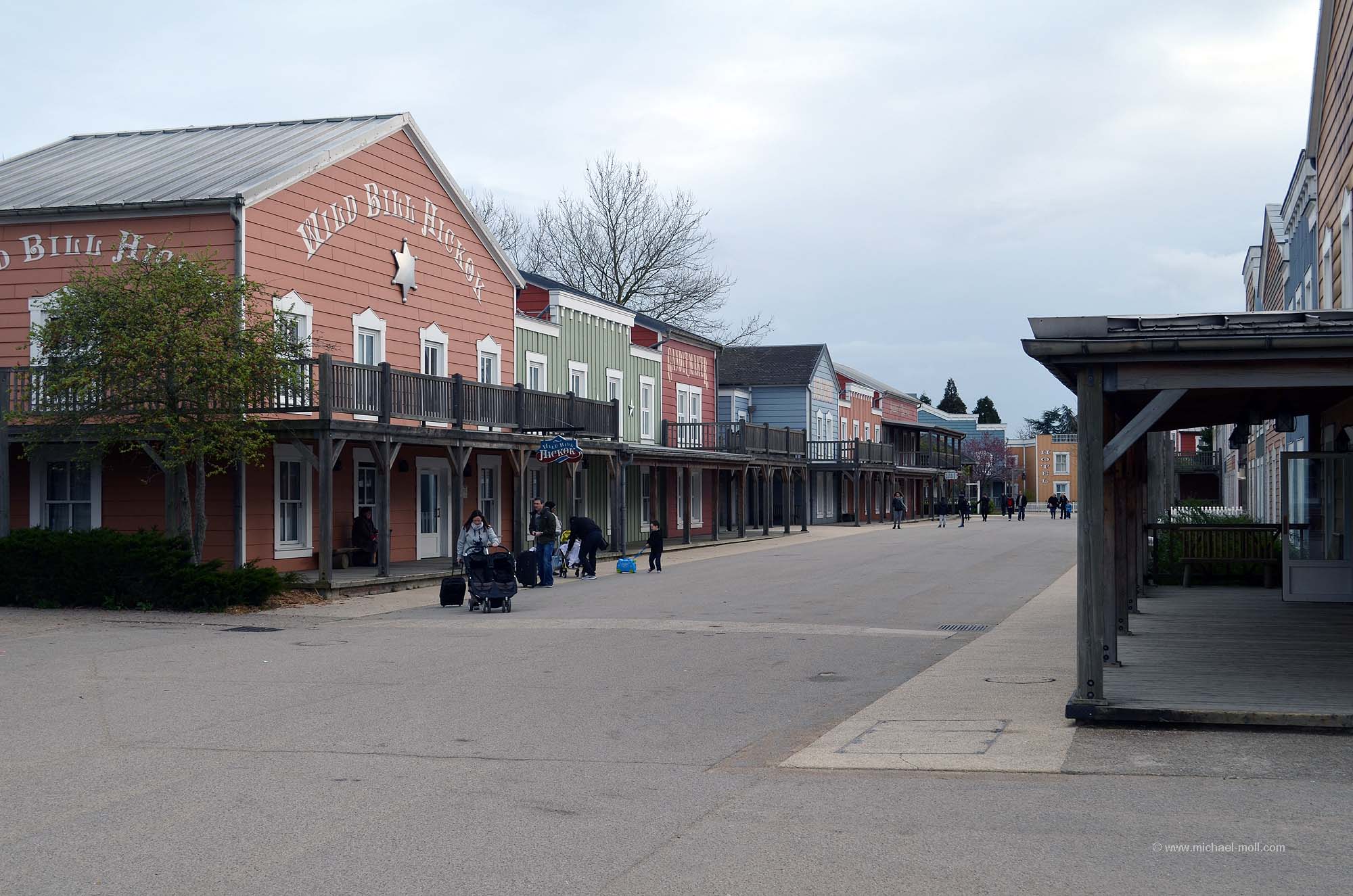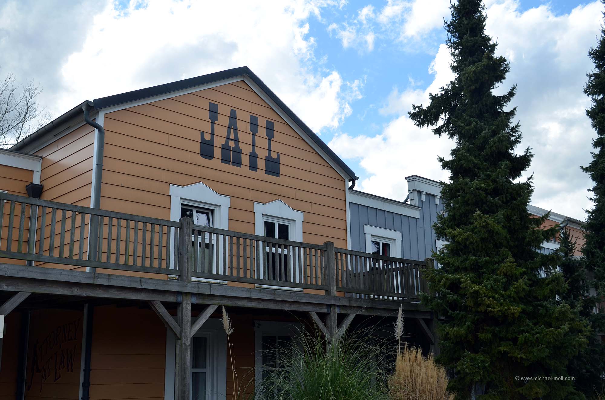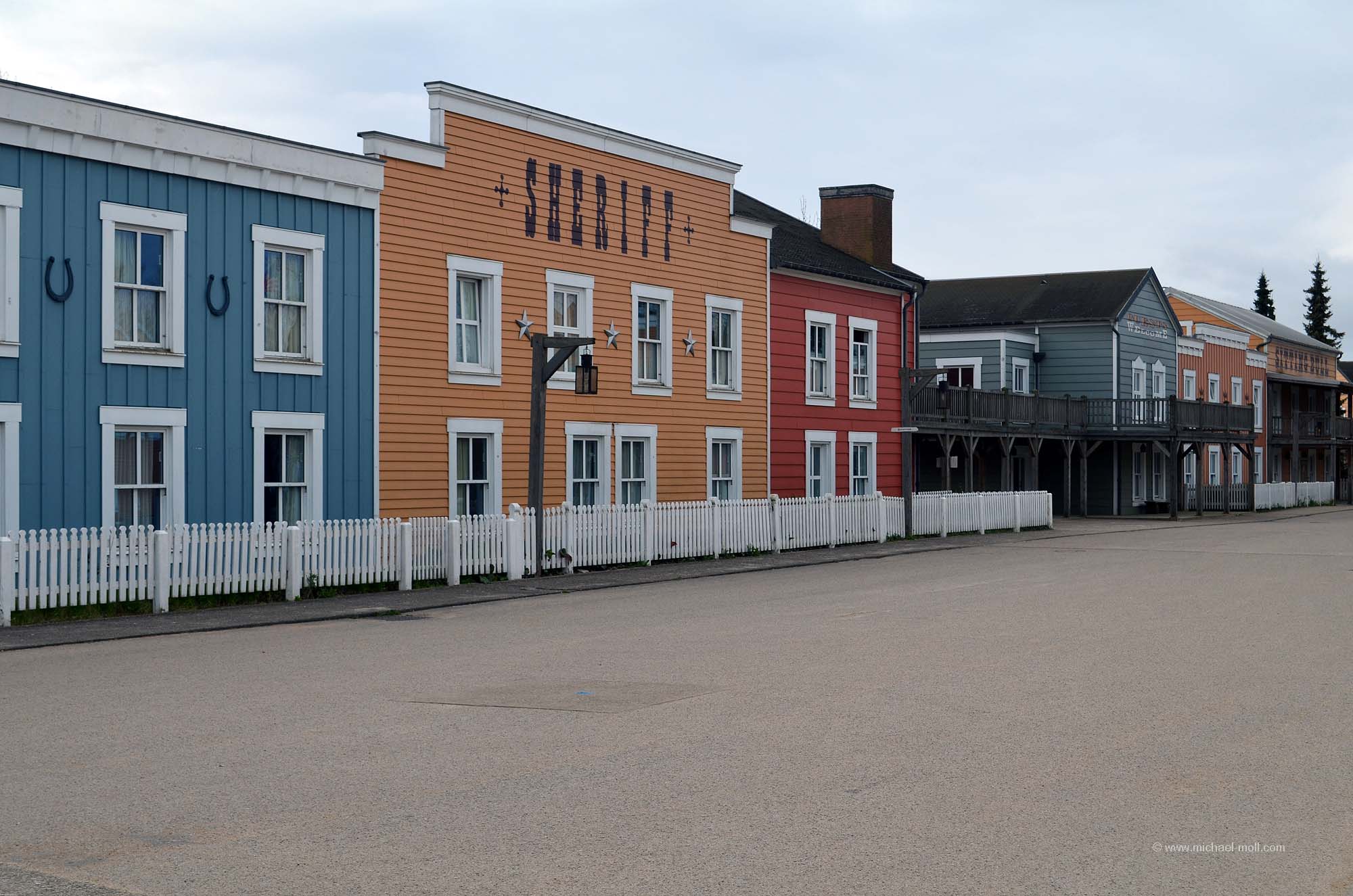 Danach marschierten wir sofort los. Es gibt zwar auch einen Shuttle-Bus, aber hey – doch nicht mit Ende 30. Der Weg vom Hotel Santa Fa führt an einem kleinen Fluss entlang, wo bereits einige kleine Attraktionen zu entdecken sind. Dazu gehört zum Beispiel ein abgestürztes Ufo oder eine Hinweistafel, dass es im Bereich des Hotelgeländes fünf kleine Abenteuertrails gibt. Ich hatte mir zwar vorgenommen, diese alle abzuwandern, aber dazu kam ich überhaupt nicht mehr. Auf der anderen Flussseite befindet sich das Hotel Cheyenne, das komplett im Western-Stil aufgemacht ist. Das gefiel uns rein optisch so gut, dass wir fortan immer einen kleinen Umweg durch diese hübsche Westernstadt machten, wenn wir zwischen unserem Hotel und dem Parkeingang pendelten.