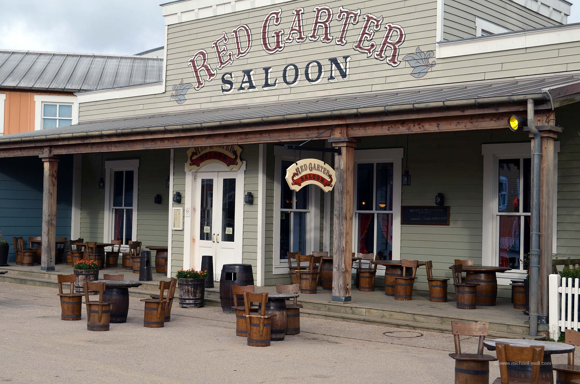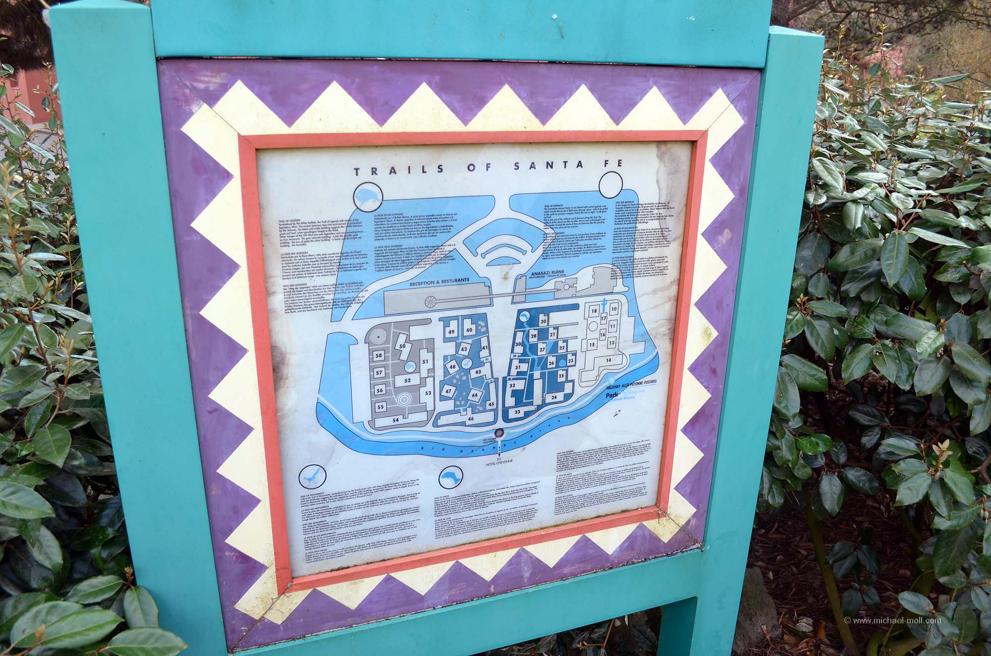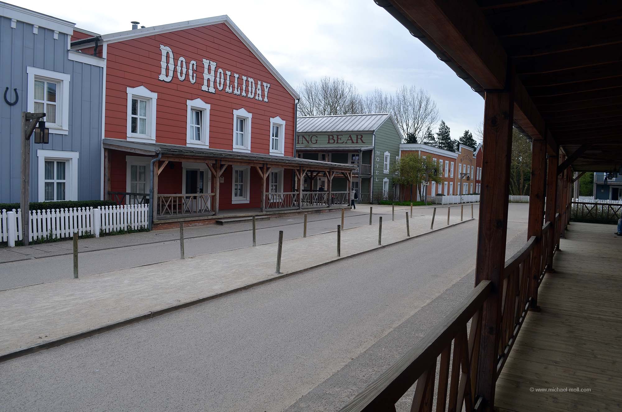 Danach marschierten wir sofort los. Es gibt zwar auch einen Shuttle-Bus, aber hey – doch nicht mit Ende 30. Der Weg vom Hotel Santa Fa führt an einem kleinen Fluss entlang, wo bereits einige kleine Attraktionen zu entdecken sind. Dazu gehört zum Beispiel ein abgestürztes Ufo oder eine Hinweistafel, dass es im Bereich des Hotelgeländes fünf kleine Abenteuertrails gibt. Ich hatte mir zwar vorgenommen, diese alle abzuwandern, aber dazu kam ich überhaupt nicht mehr. Auf der anderen Flussseite befindet sich das Hotel Cheyenne, das komplett im Western-Stil aufgemacht ist. Das gefiel uns rein optisch so gut, dass wir fortan immer einen kleinen Umweg durch diese hübsche Westernstadt machten, wenn wir zwischen unserem Hotel und dem Parkeingang pendelten.