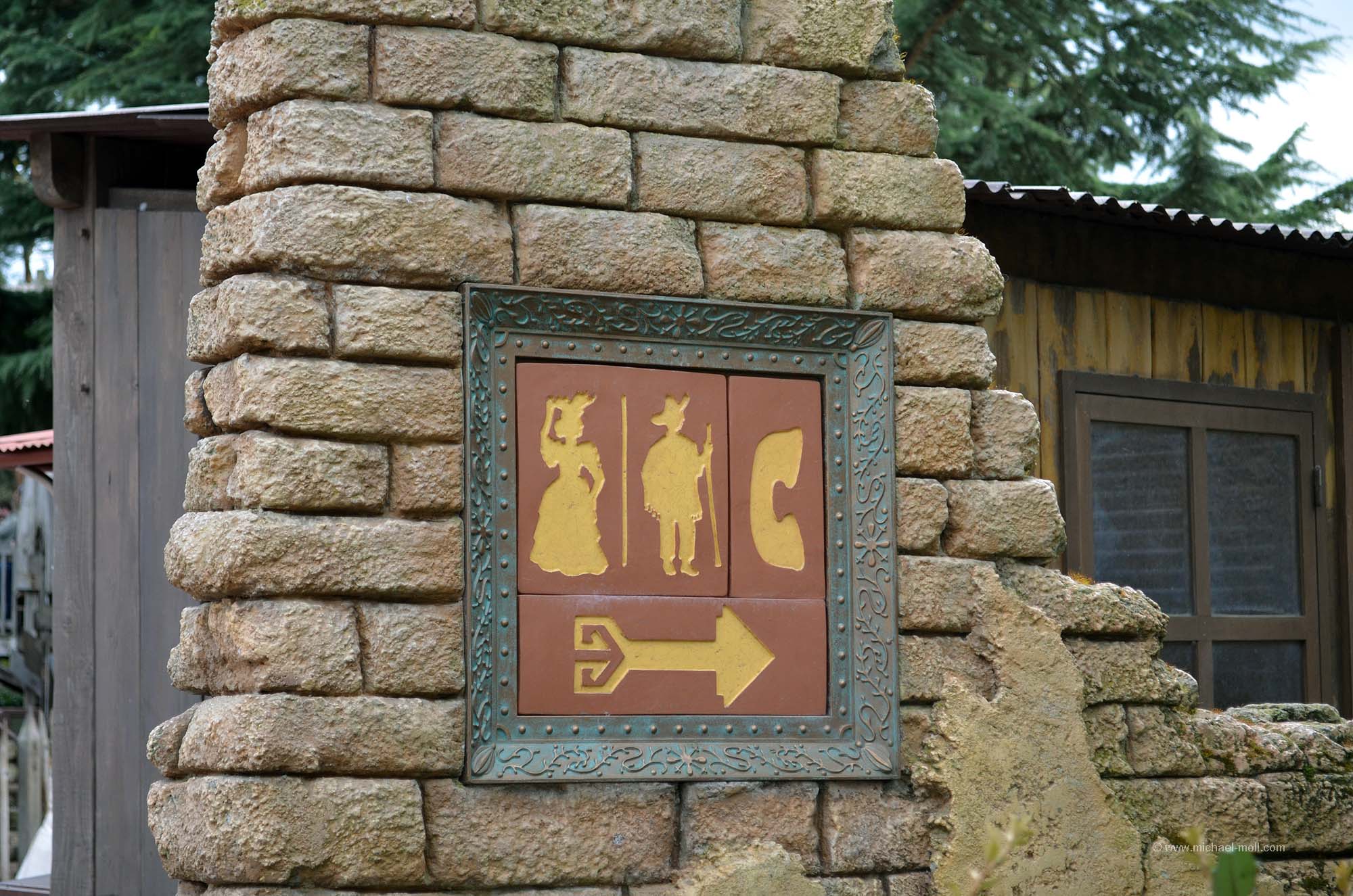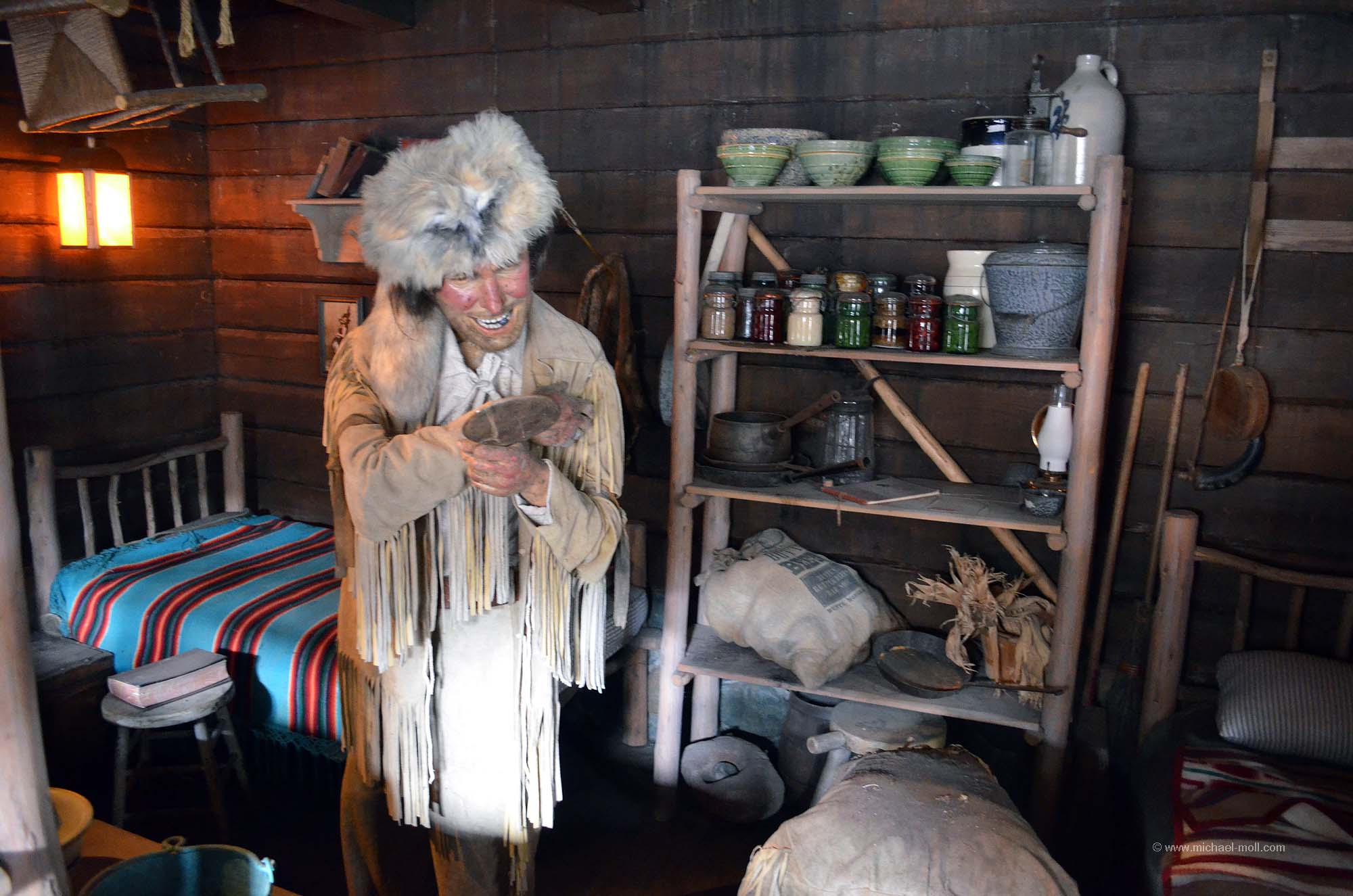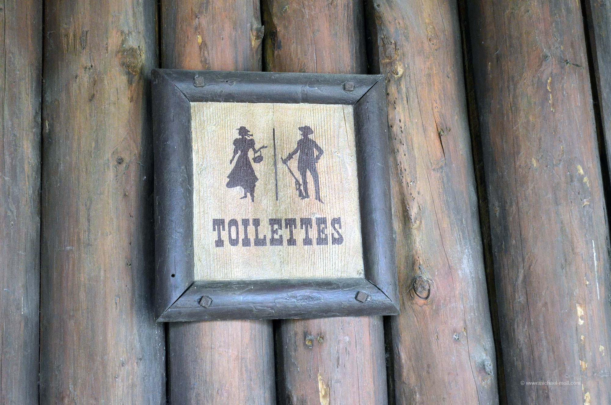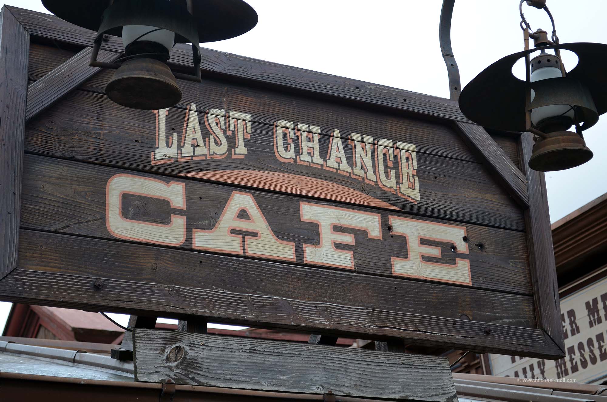 Danach marschierten wir sofort los. Es gibt zwar auch einen Shuttle-Bus, aber hey – doch nicht mit Ende 30. Der Weg vom Hotel Santa Fa führt an einem kleinen Fluss entlang, wo bereits einige kleine Attraktionen zu entdecken sind. Dazu gehört zum Beispiel ein abgestürztes Ufo oder eine Hinweistafel, dass es im Bereich des Hotelgeländes fünf kleine Abenteuertrails gibt. Ich hatte mir zwar vorgenommen, diese alle abzuwandern, aber dazu kam ich überhaupt nicht mehr. Auf der anderen Flussseite befindet sich das Hotel Cheyenne, das komplett im Western-Stil aufgemacht ist. Das gefiel uns rein optisch so gut, dass wir fortan immer einen kleinen Umweg durch diese hübsche Westernstadt machten, wenn wir zwischen unserem Hotel und dem Parkeingang pendelten.