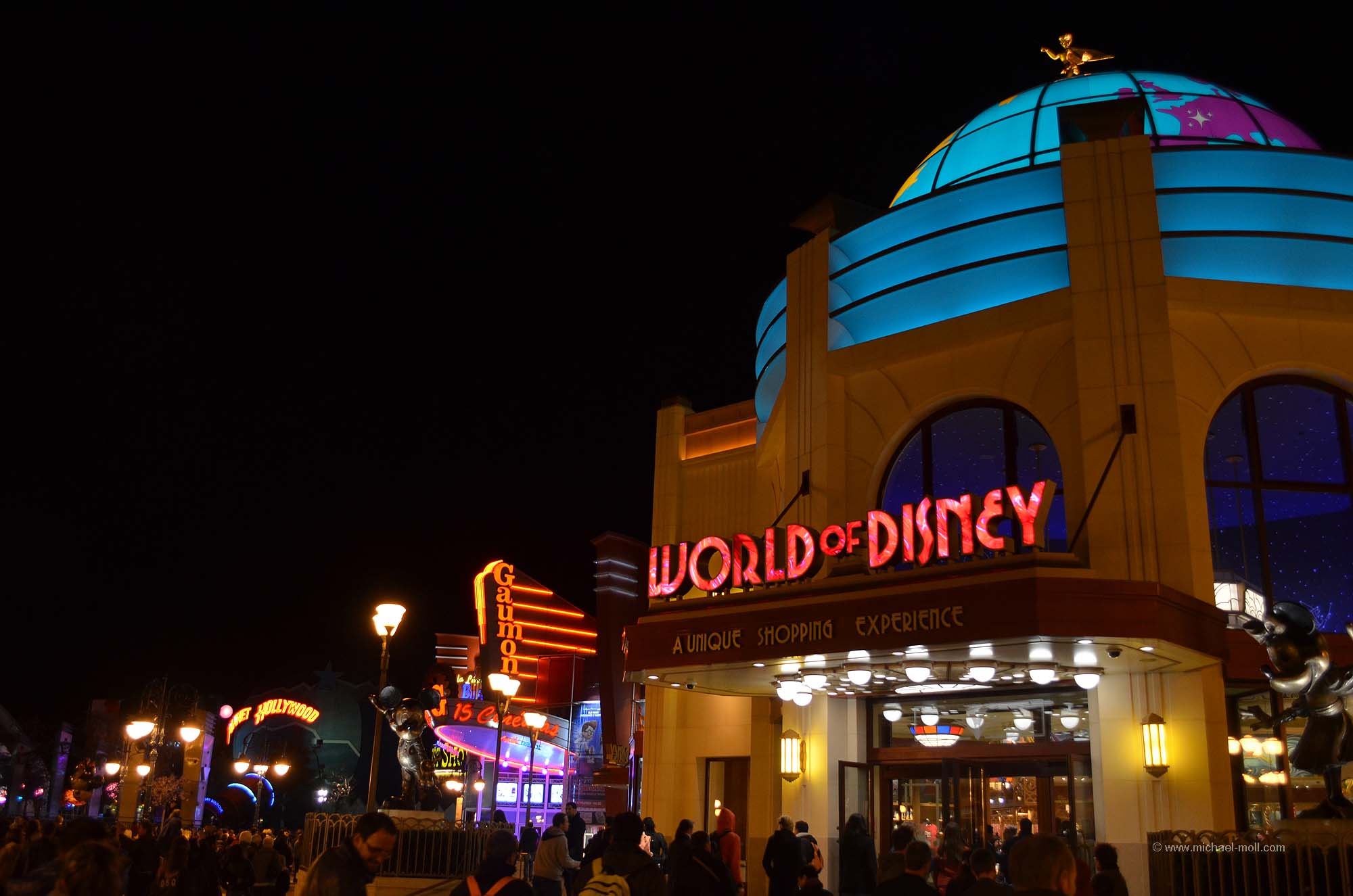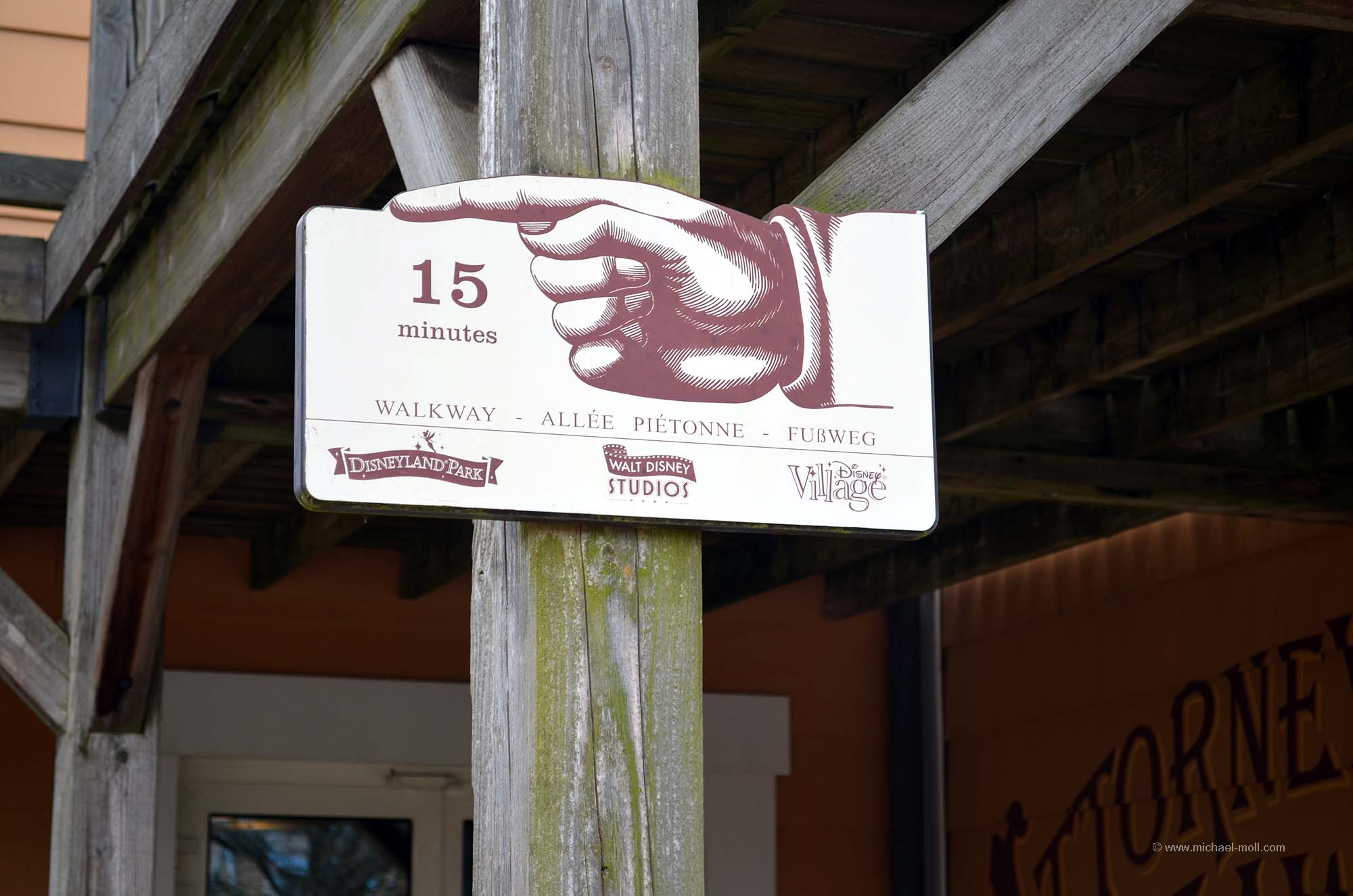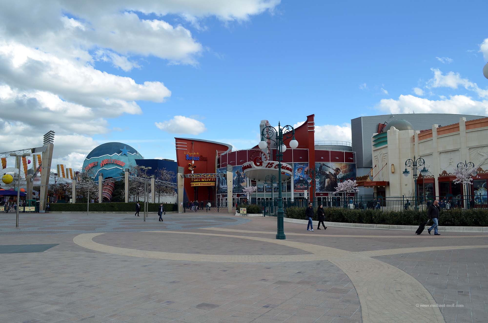 Keine zehn Minuten später gelangt man zu einem See, um den sich herum drei weitere Hotels befinden und wo gleichzeitig der Zugang zum Disney Village besteht. Das Disney Village ist öffentlich und kann von jedermann betreten werden. Es beherbergt zahlreiche Restaurants, Cafés und Shops. Da es abends länger geöffnet hat, als die beiden Parks durchquerten wir das Village zunächst und verschoben den Besuch auf die Abendstunden. Gleich dahinter kommt der TGV-Bahnhof, der Endpunkt des Shuttlebusses und die Zugänge zu den beiden Parks – Disneyland Park und Walt Disney Studios.