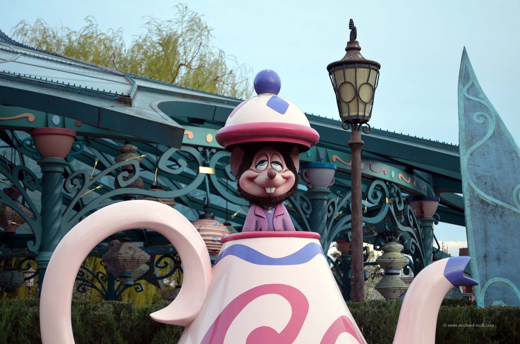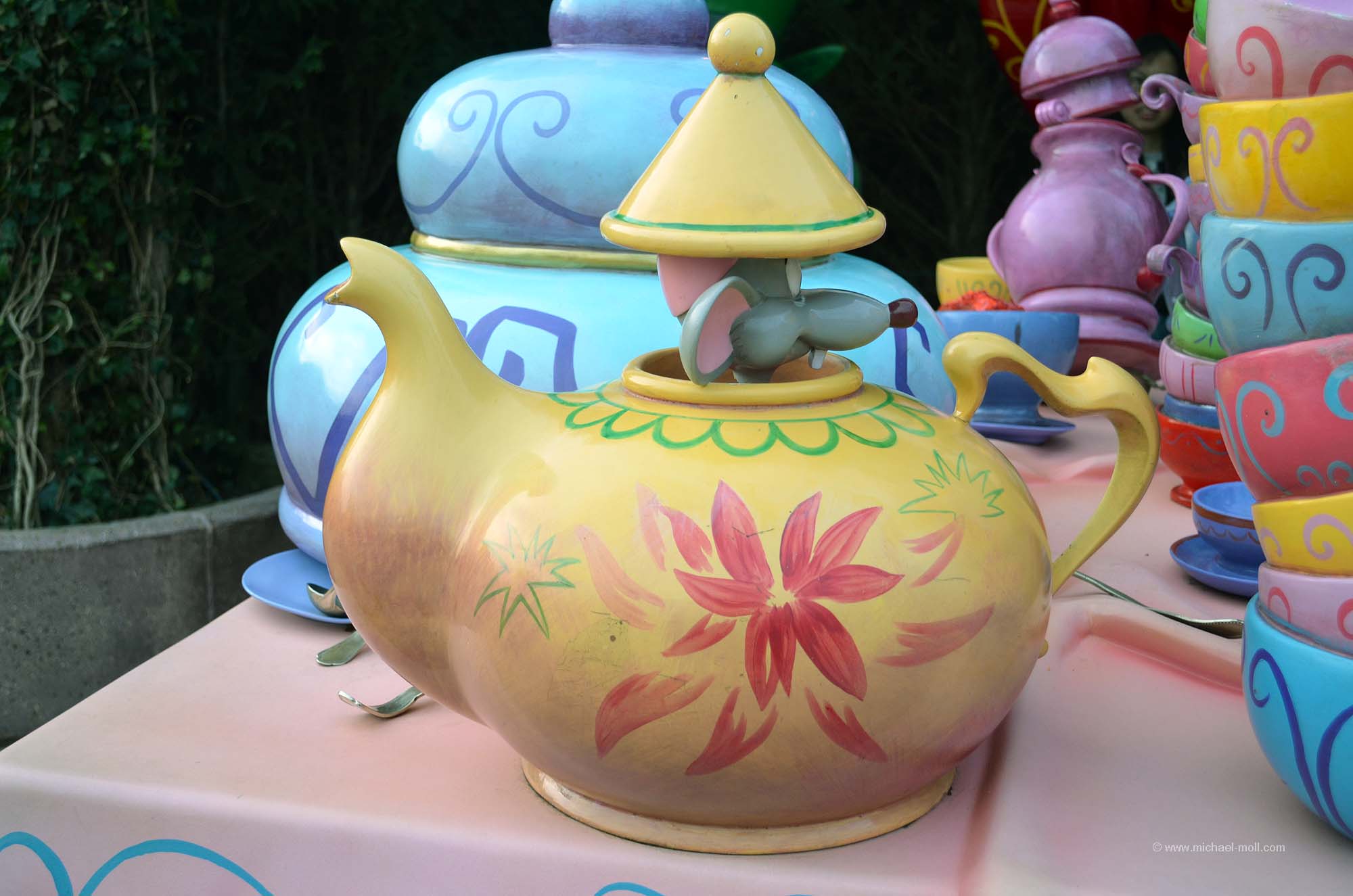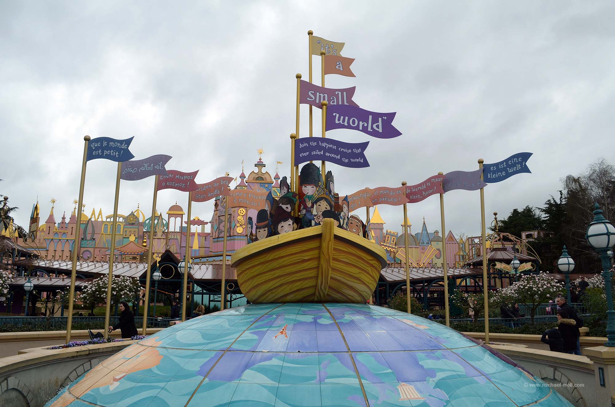 Anschließend spazierten wir direkt weiter ins Fantasyland zu einer Runde Teetassendreh, was natürlich immer eine Riesengaudi ist. Da auch gerade wenig Besucher an It’s a small world anstanden, sprangen wir dort schnell ins Boot zum sogenannten Puppengucken. Während Moni total fasziniert war, hatte ich hier einen kurzen Anflug von Enttäuschung. Denn in den letzten Wochen vor der Reise hatte ich viel über Disneyland gelesen und fand einige Foren, in denen Hardcore-Fans auch die weniger schönen Dinge aufzeigten. Mit diesen Threads im Hinterkopf ging ich den ersten Tag an und war selber ein wenig auf der Suche nach Makeln. Diese fand ich dann ausgerechnet in It’s a small world, wo ich früher sehr begeistert von war. Doch ich hatte in Erinnerung, dass die Fahrt durch eine relativ dunkle Halle führte, wo man nur die Puppen sieht.