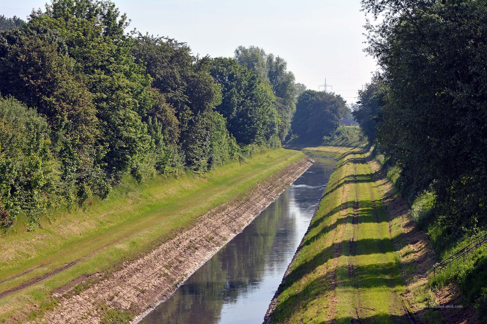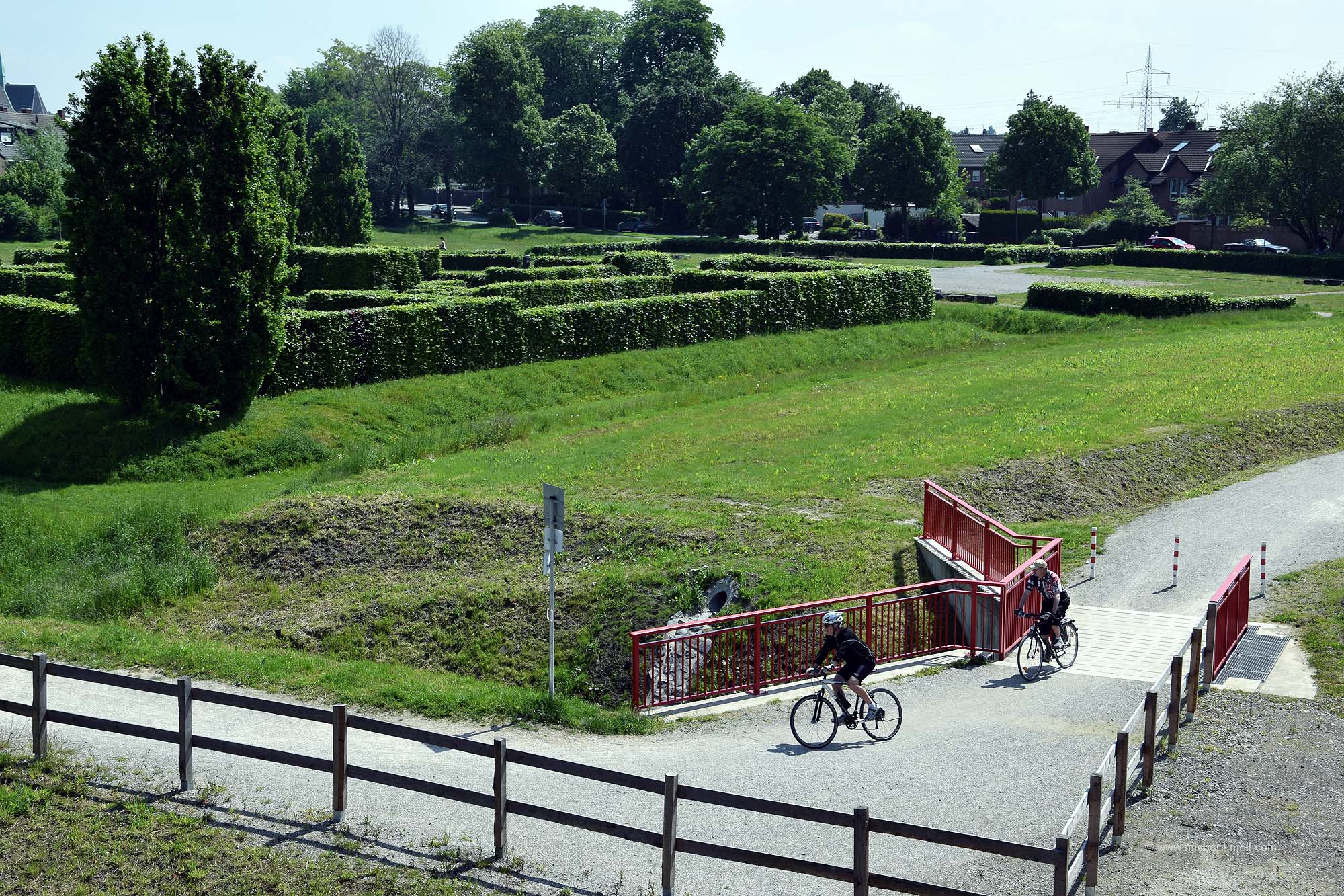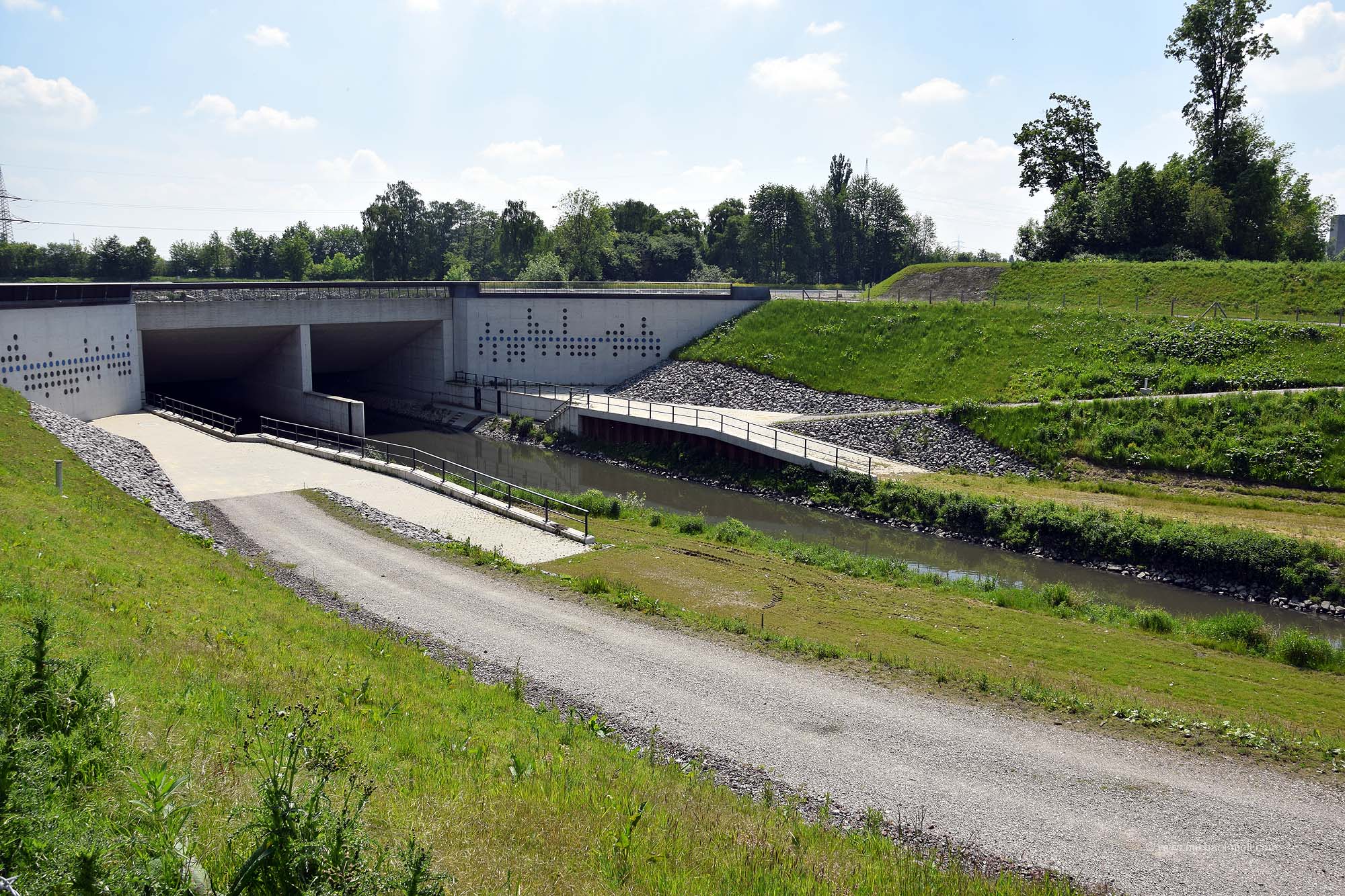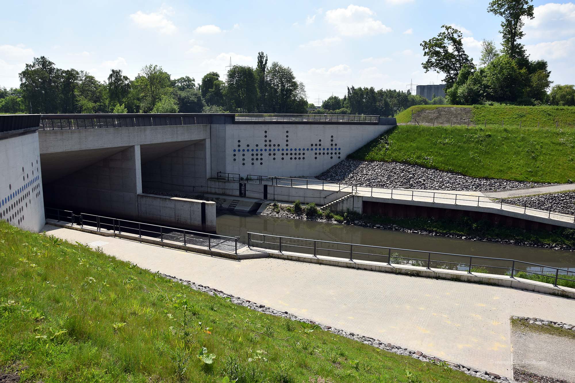 Doch die Emscher bleibt weiter südlich, passiert die einstige Henrichenburg, deren Grundmauern mit Hecken nachgebildet wurden und unterquert den Rhein-Herne-Kanal. Dieser sogenannte Emscherdurchlass wurde nun bereits zum dritten Mal gebaut und im Rahmen des Emscherumbaus im Jahr 2012 feierlich eröffnet. Ist schon ganz witzig, wenn ein kleiner Fluss von einem deutlich größeren Kanal überquert wird.