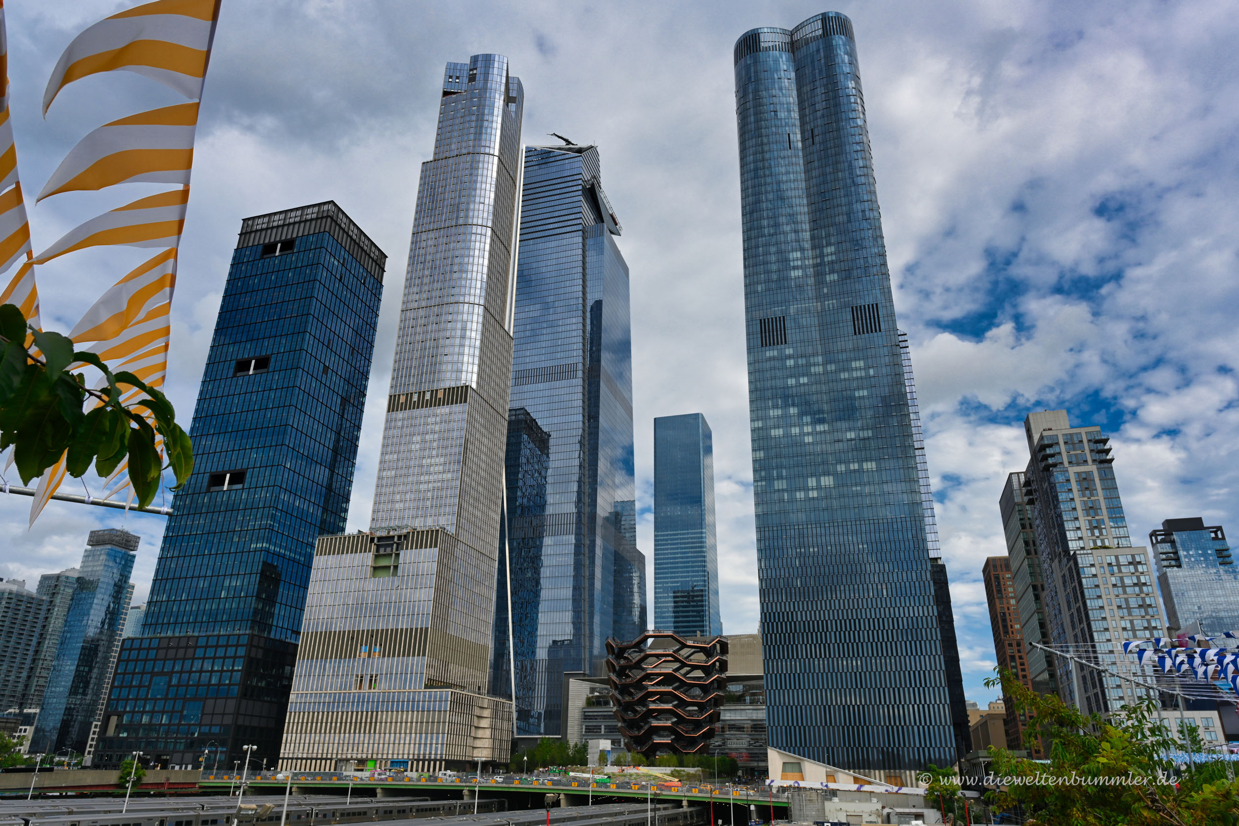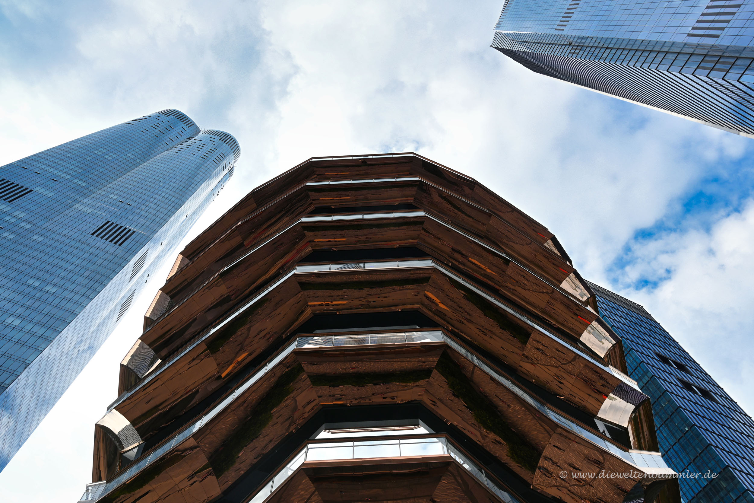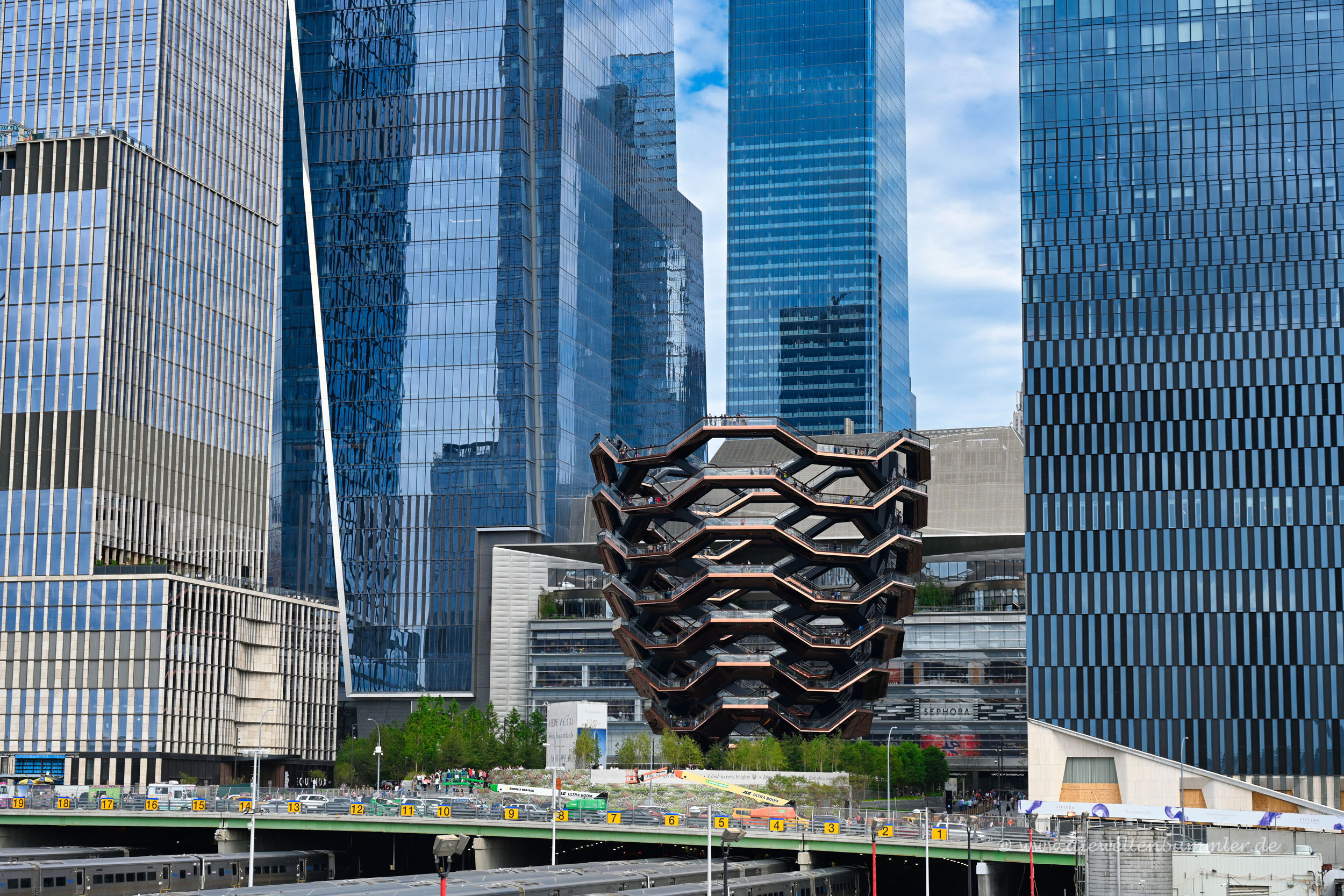 An einer Schlange stand man an, um zu einer der vielen Kassen zu gelangen. Dort bezahlte man seine Ware, die man direkt im Anschluss an einer Ausgabestelle abholen konnte. Es lief hier deutlich anders als bei uns. Beeindruckend und gut. Nur ein paar Blocks weiter befindet sich das neu entwickelte Viertel namens Hudson Yards. Dazu zählt ein ganz neuer, moderner und futuristischer Aussichtsturm mit dem Namen Vessel. Er besteht eigentlich nur aus Treppen, die die Form einer Vase bilden und im Auf und Ab nach oben führen.