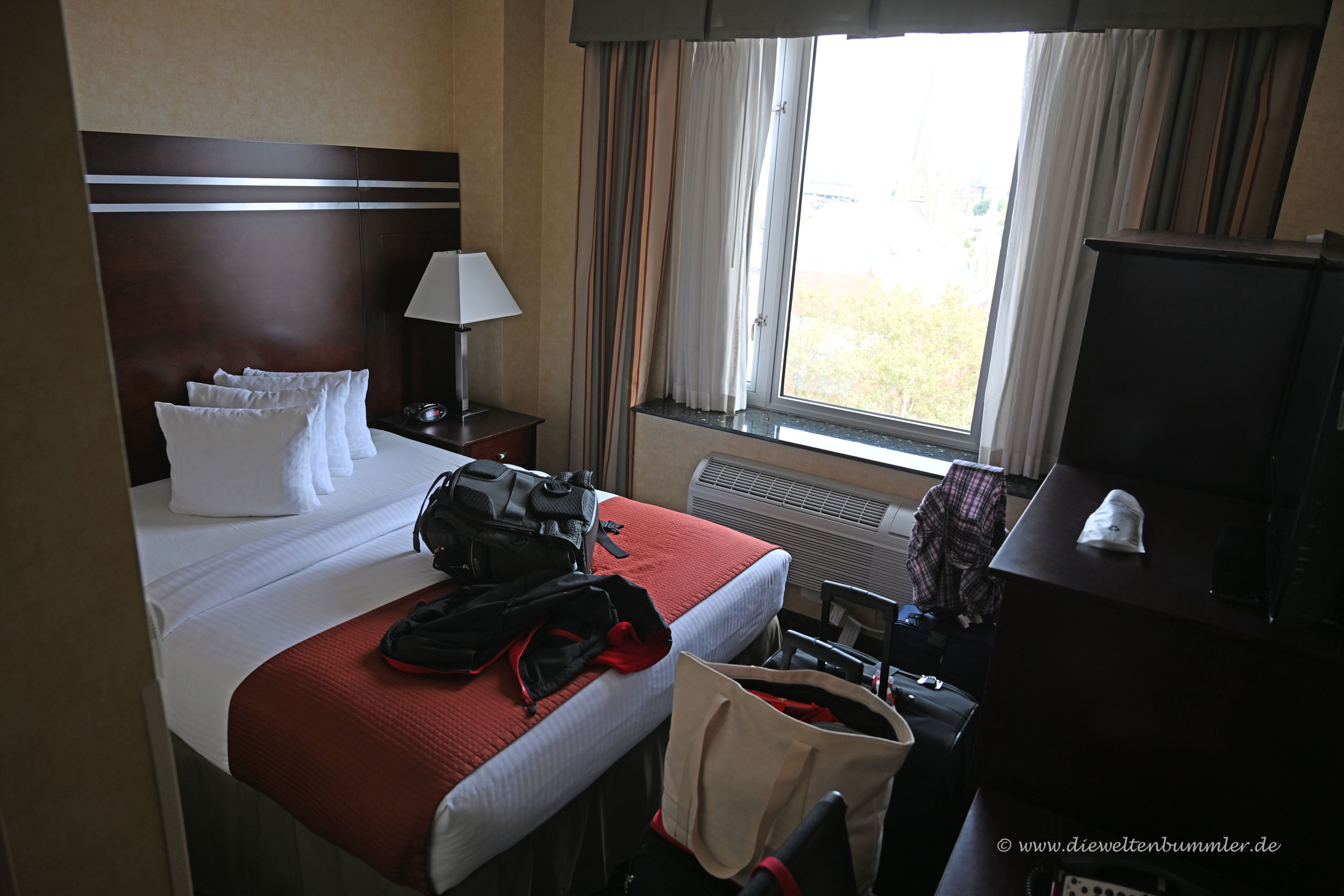 Und siehe da: Wir waren zwar ein wenig zu früh im Hotel, doch man bemühte sich, dass wir dennoch so schnell wie möglich unser Zimmer beziehen konnten. So warteten wir keine halbe Stunde und bekamen die Karte für eines der Zimmer, das wir schon einmal hatten. Was für ein Zufall und noch viel schöner: Bisher hatten wir bei diesem Hotel immer einen tollen Ausblick auf Manhattan.