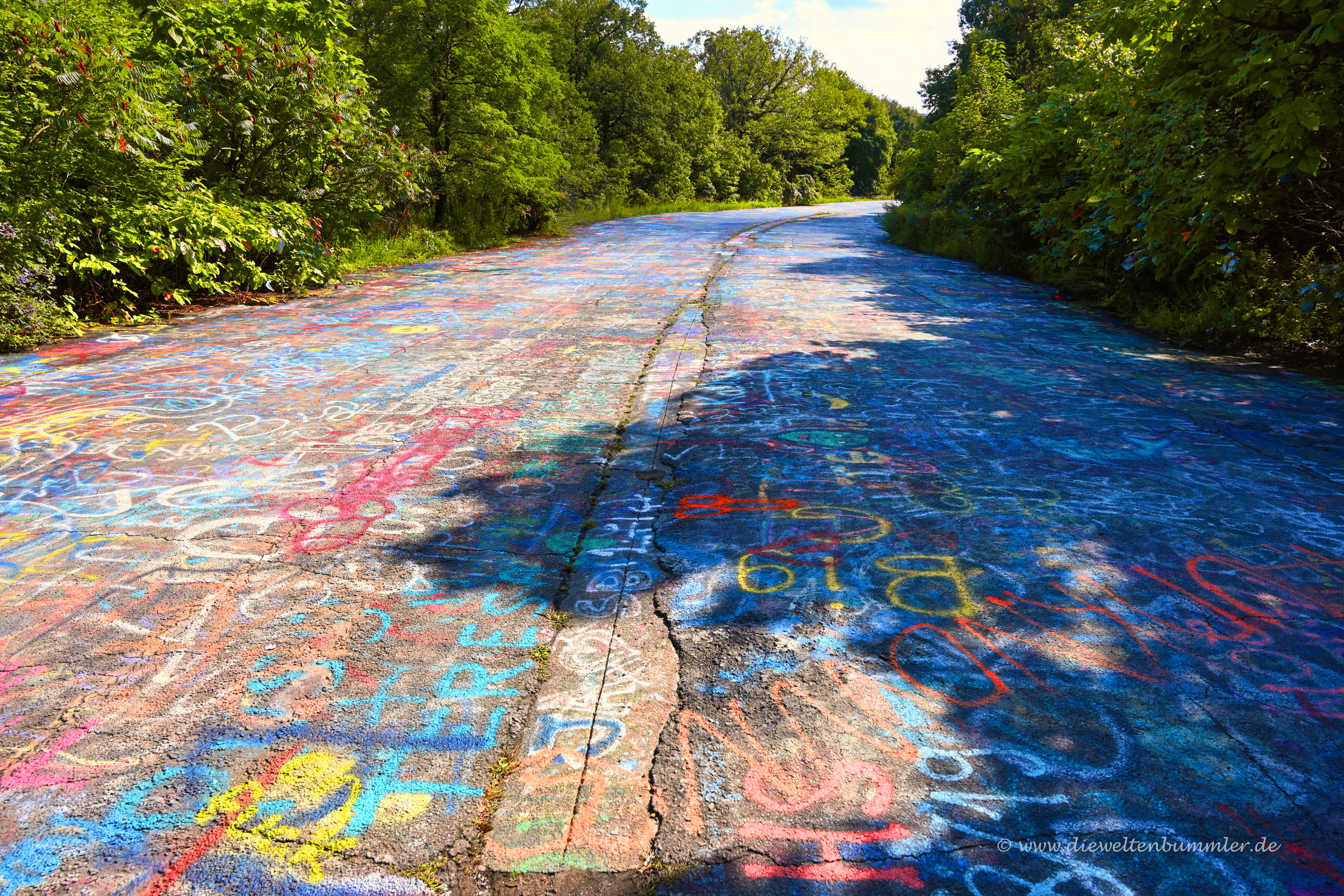 Die eigentliche heutige Sehenswürdigkeit von Centralia ist ein ebenfalls aufgegebenes Stück eines Highways. Dieses ist mehrere hundert Meter lang und zieht Graffitisprayer aus aller Welt an. Kein einziger Quadratzentimeter des Asphalts ist heute noch im originalen Zustand. Alles ist komplett besprüht. Auch wenn ich sonst kein Freund von Graffiti bin, so sieht das hier natürlich gut und einmalig aus.