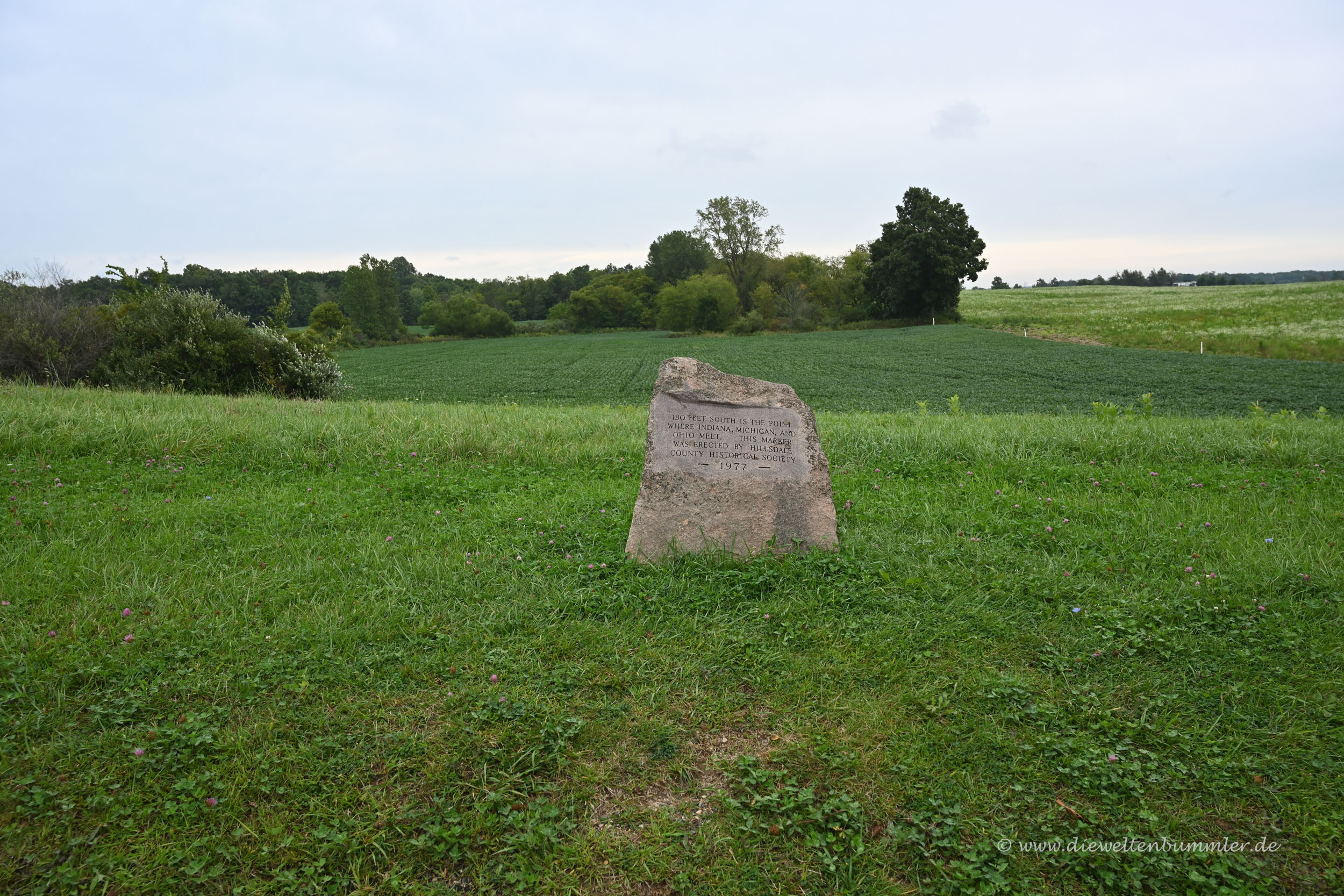 So ziemlich genau zwischen dem Lake Erie und dem Michigansee treffen nämlich die drei US-Bundesstaaten Michigan, Ohio und Indiana aufeinander. Und in der Tat gibt es dort eine Markierung für diesen Grenzpunkt, wenn auch nur eine kleine. Doch nach den Dreiländerpunkten von South Dakota, Iowa und Minnesota sowie von Nevada, Utah und Arizona war das nun schon das dritte von uns besuchte Dreiländereck in den USA. Und ein Vierländereck hatten wir ja auch schon. Über kleine Landstraßen fährt man dorthin und schon ging es für uns auf der I-90 weiter.