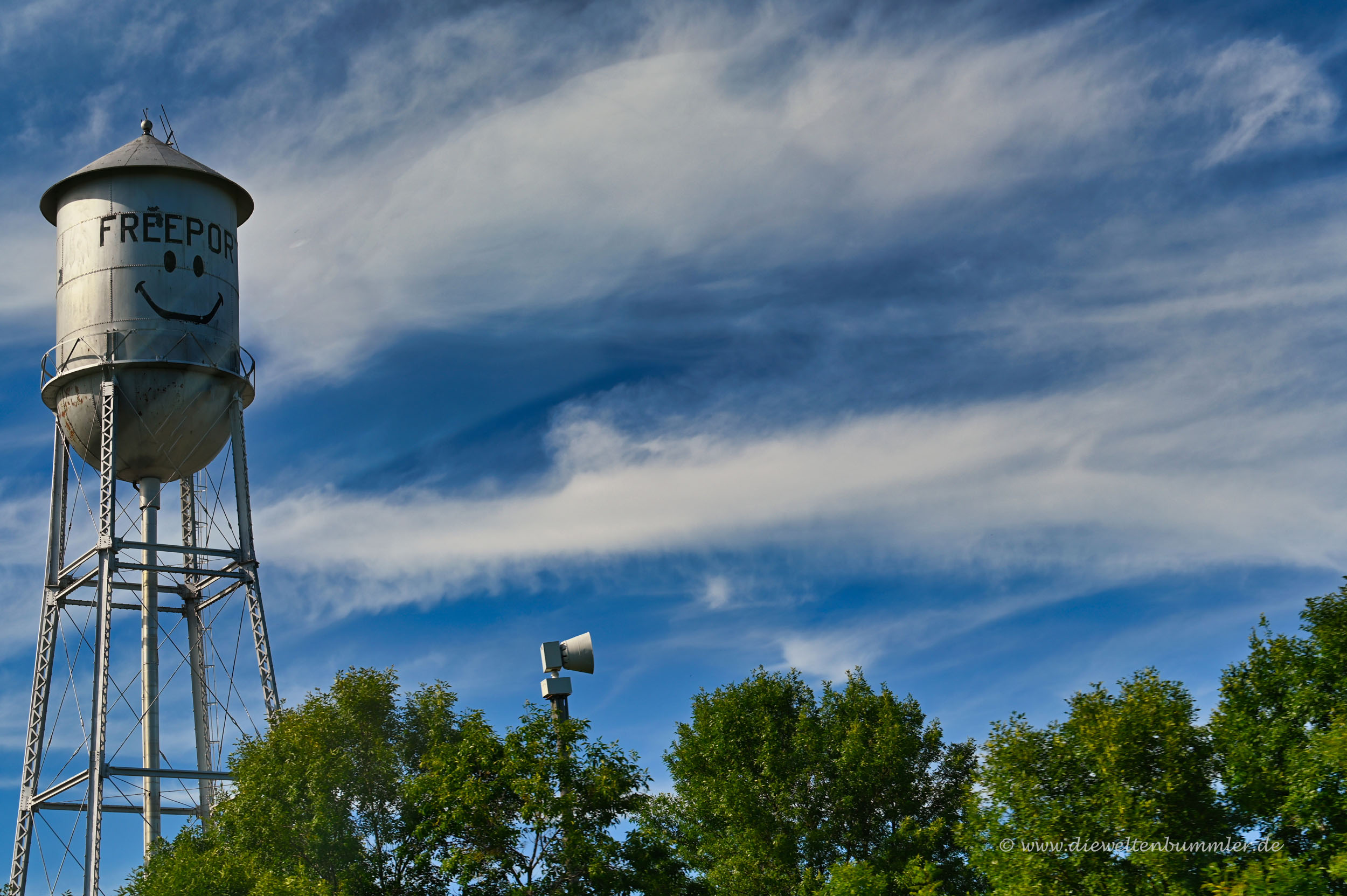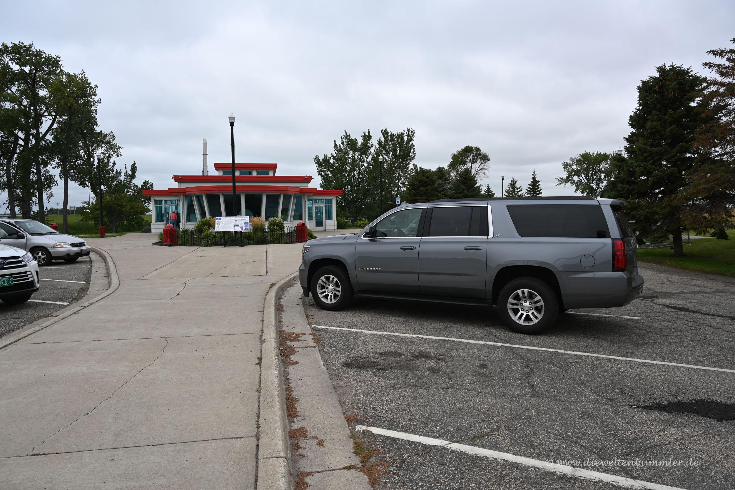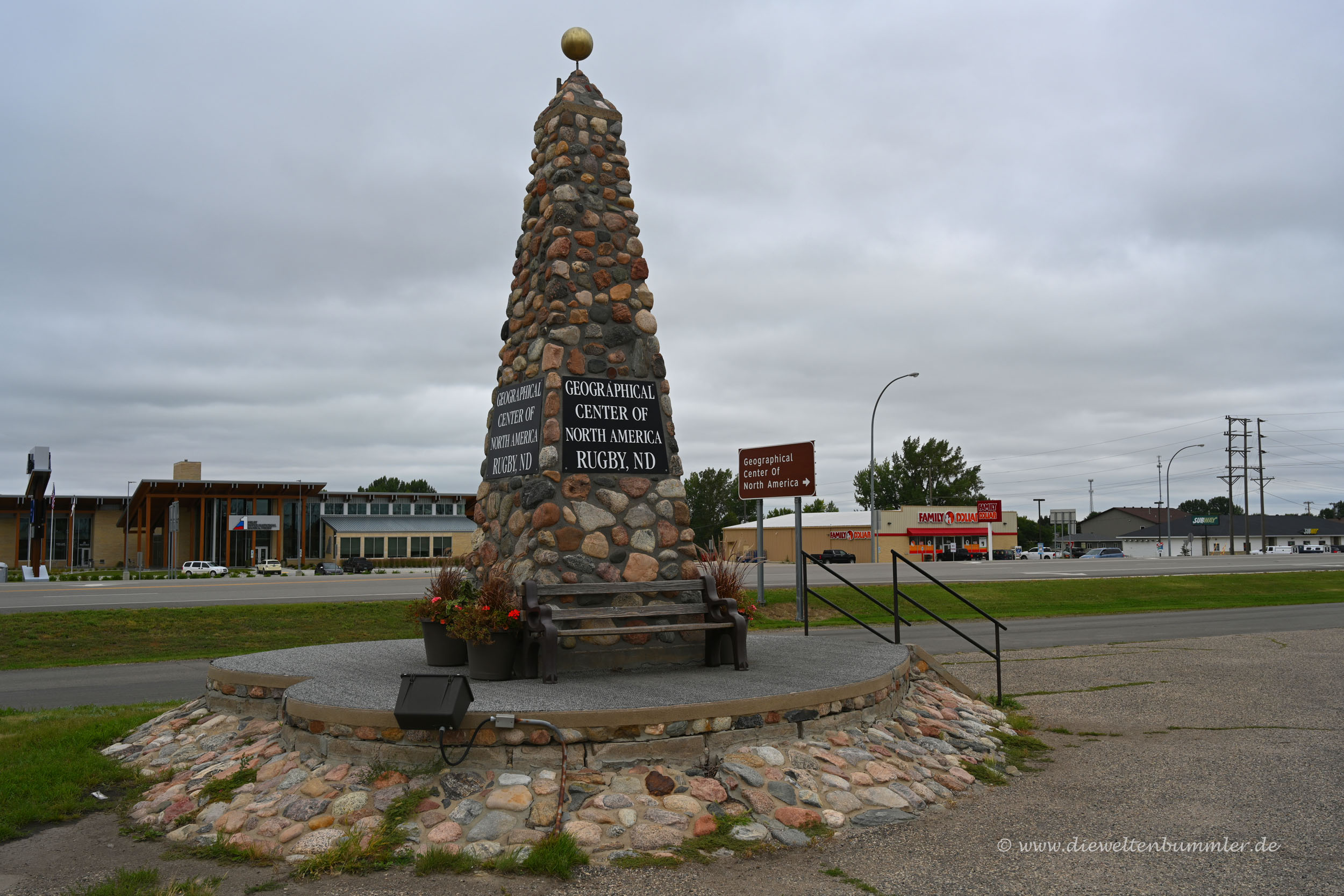Danach folgten wir deutlich kleineren Highways nach Nordwesten und staunten nicht schlecht, als wir plötzlich unterwegs Werbung für den geografischen Mittelpunkt Nordamerikas sahen. Den hatte ich gar nicht auf dem Schirm und das, wo wir doch geografische Mittelpunkte sammeln. Umso größer war meine Freude, dass wir ihn ausgerechnet getroffen haben. Es hätte hier in der Prärie von North Dakota ja auch sein können, dass wir zehn Meilen weiter westlich oder östlich daran vorbei fahren. Nein, in der kleinen Ortschaft Rugby trafen wir ausgerechnet auf diesen Mittelpunkt und legten natürlich dort direkt mal einen Fotostopp und eine kleine Pause ein.
