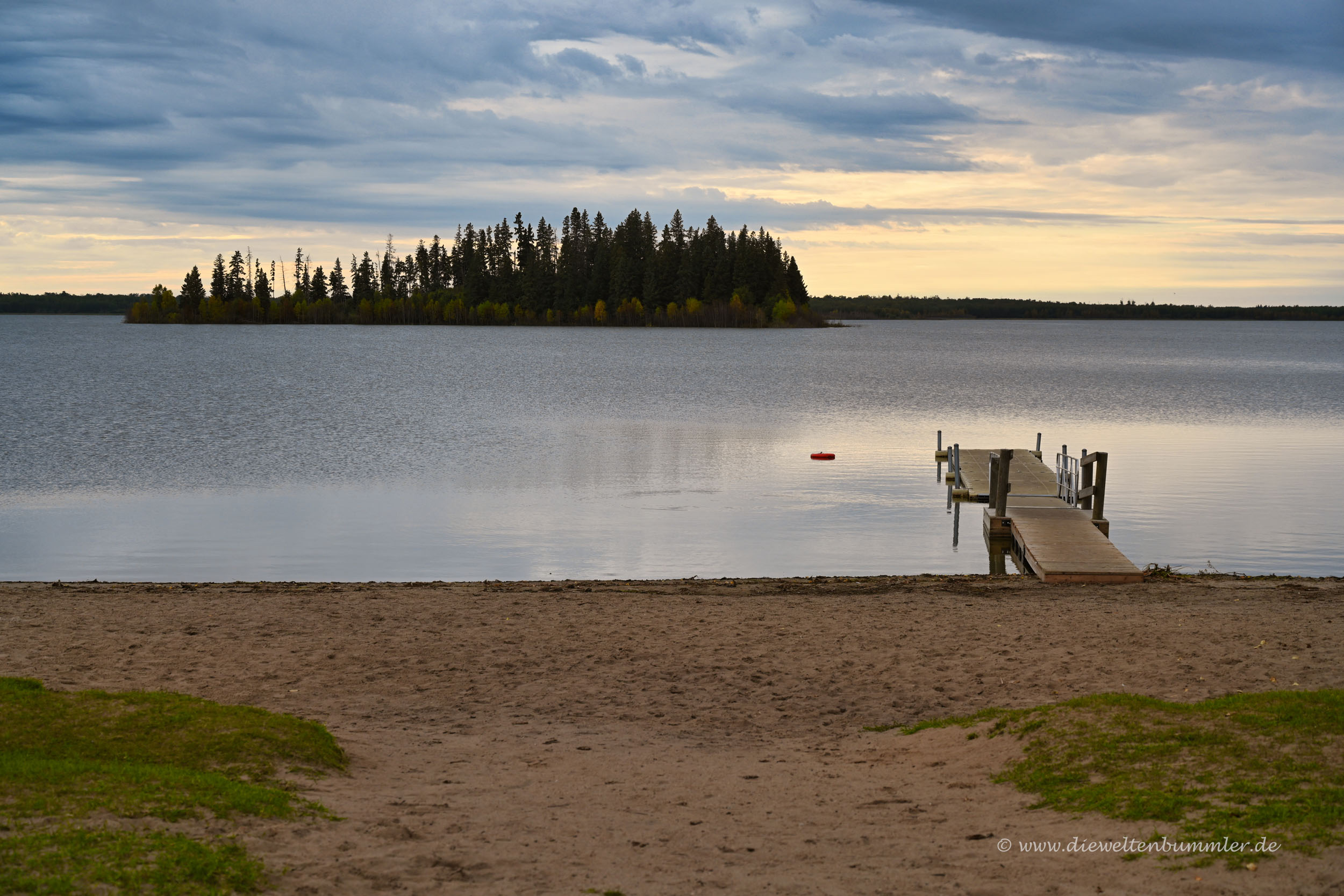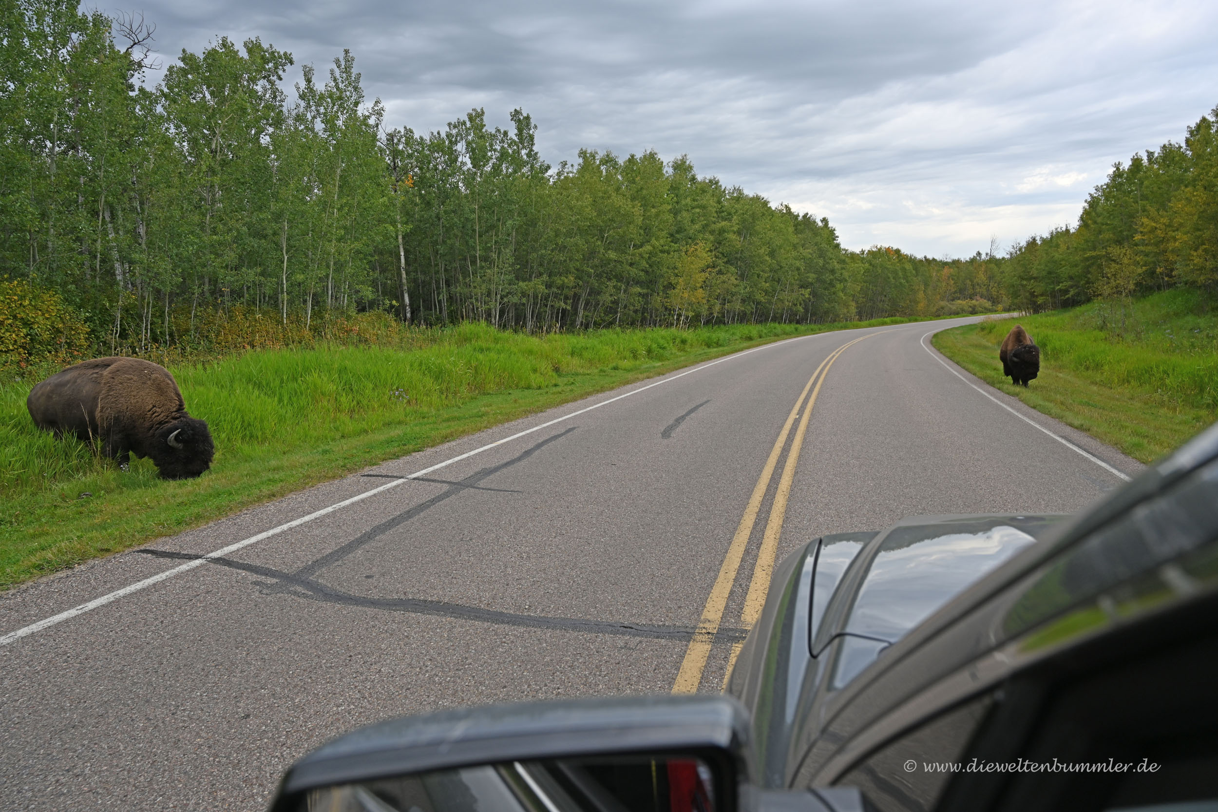 Allerdings ist der Elk Island Nationalpark relativ klein und besteht im Wesentlichen aus mehreren Seen mit Campingmöglichkeiten, einem Besucherzentrum und der Möglichkeit Bisons zu sehen. Damit waren wir dann endlich angekommen. Ab jetzt gab es deutlich mehr Sehenswürdigkeiten und wir freuten uns schon auf das, was noch kommen würde. Auf der Bison Loop Road im Nationalpark, einer kurzen schotterigen Rundstrecke sahen wir keine Bisons. Dafür aber ganze drei Tiere weiter hinten im Park.