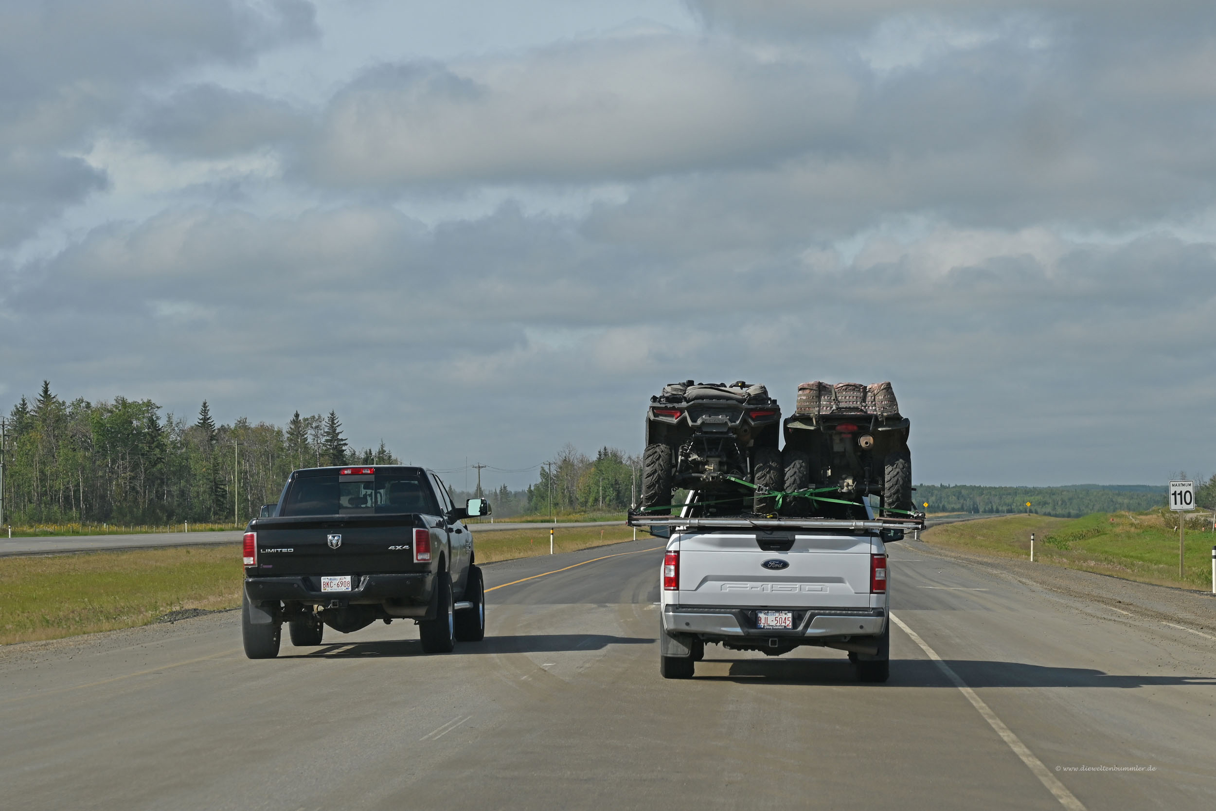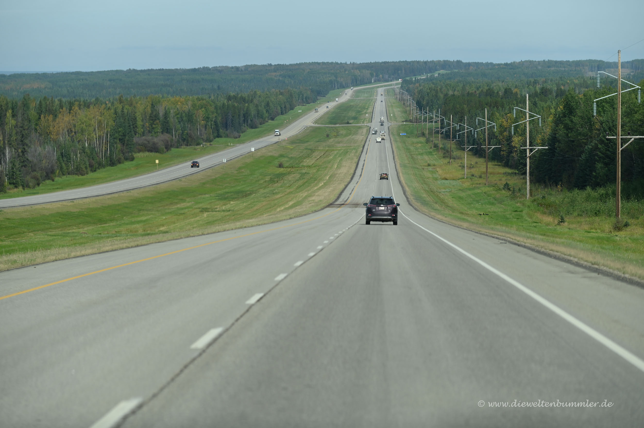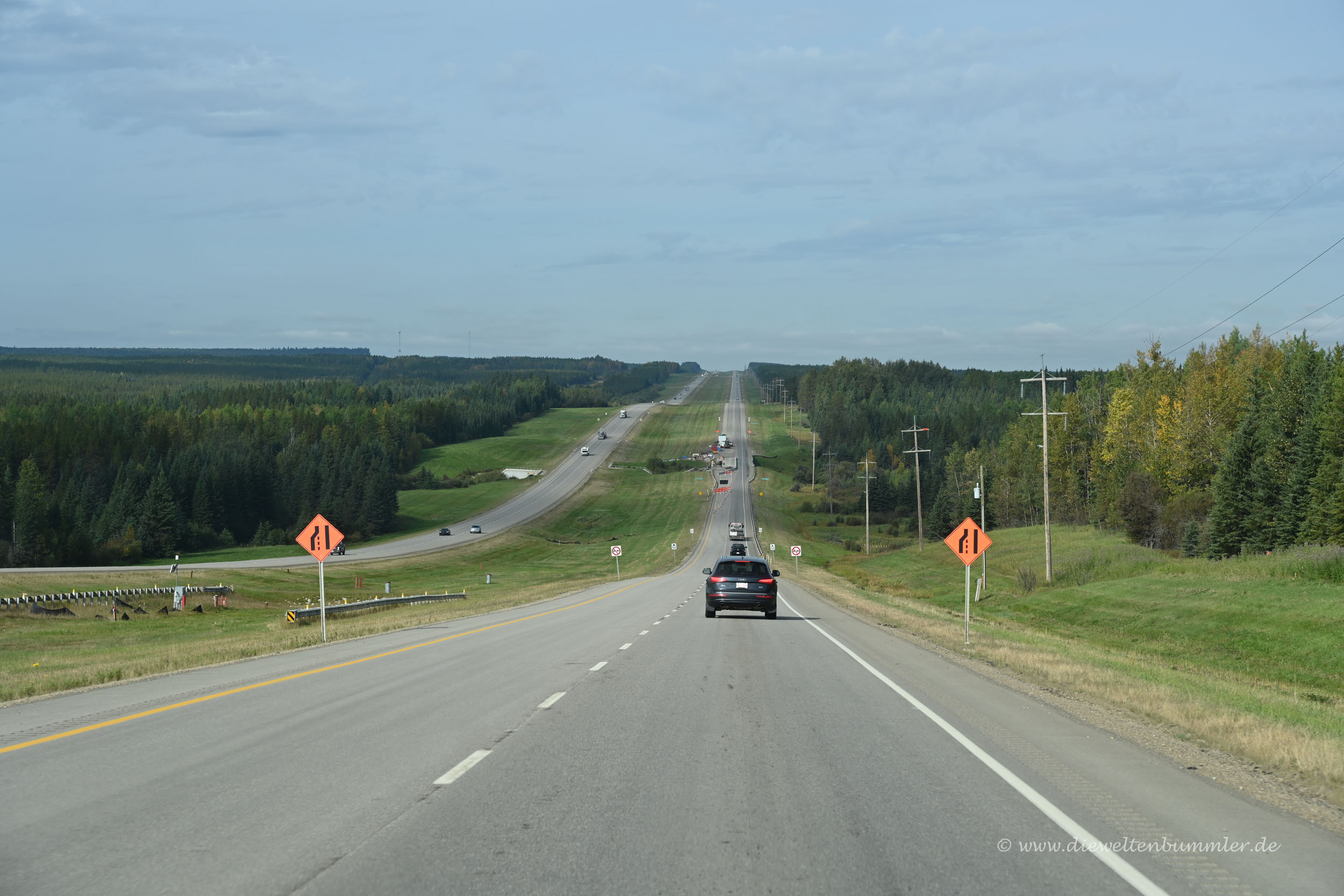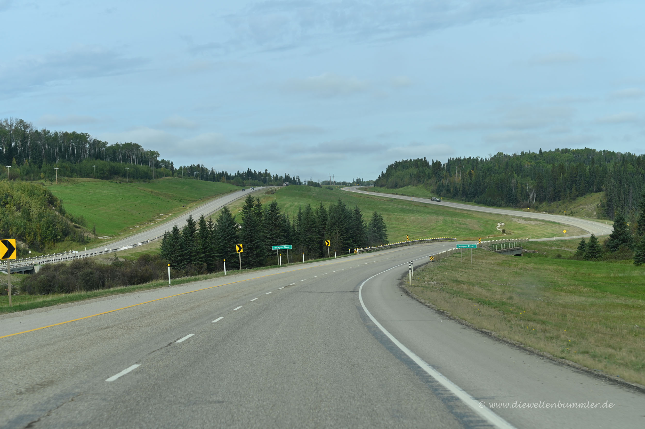 Mit der Abfahrt von Edmonton wurde die Landschaft abwechslungsreicher. Die breite Straße, die uns nach Nordwesten brachte, wurde leicht hügelig und wir hatten den Eindruck, nun endlich in einer klassischen Reiseregion unterwegs zu sein. Vorher war es auch schon schön und wir sahen viele tolle Sachen. Doch ab jetzt rechneten wir zu recht auch wieder mit mehr Wohnmobilen auf der Straße, was ein deutliches Zeichen für Urlaub und Tourismus ist.