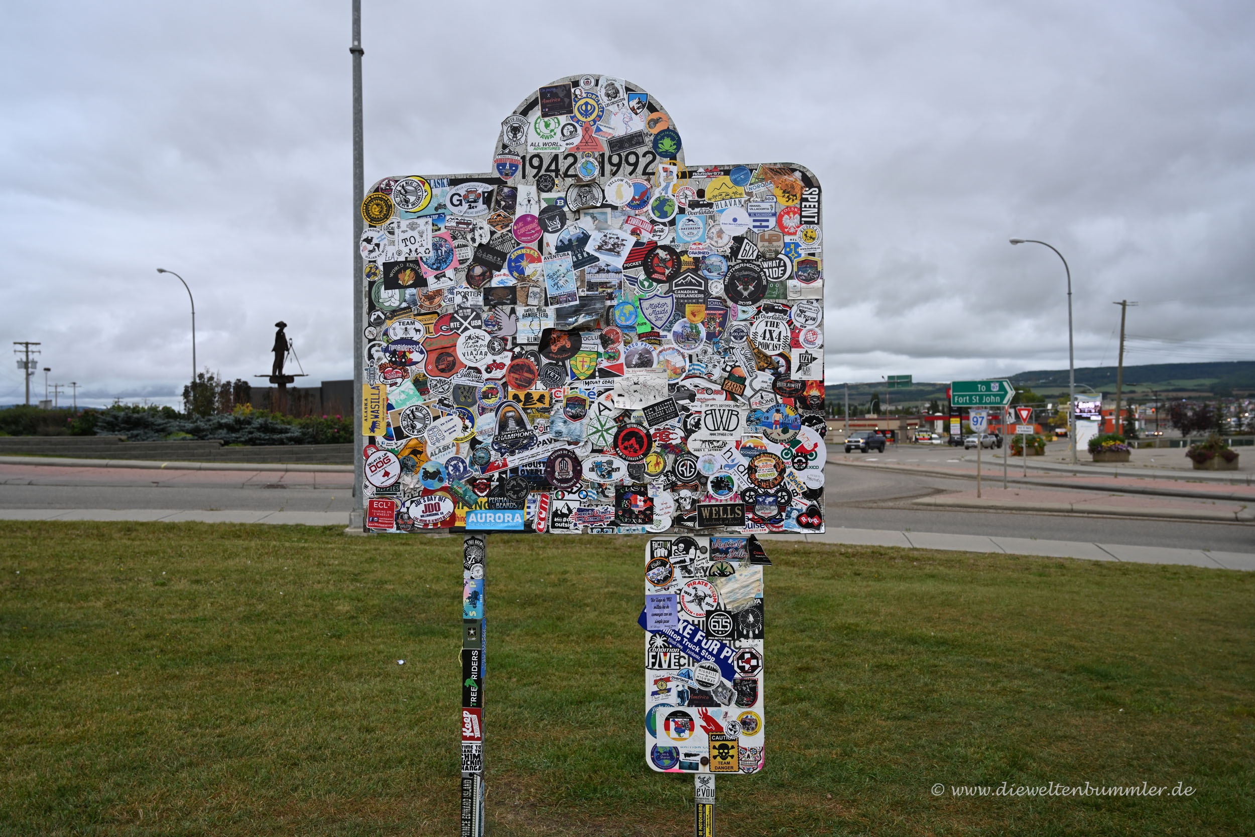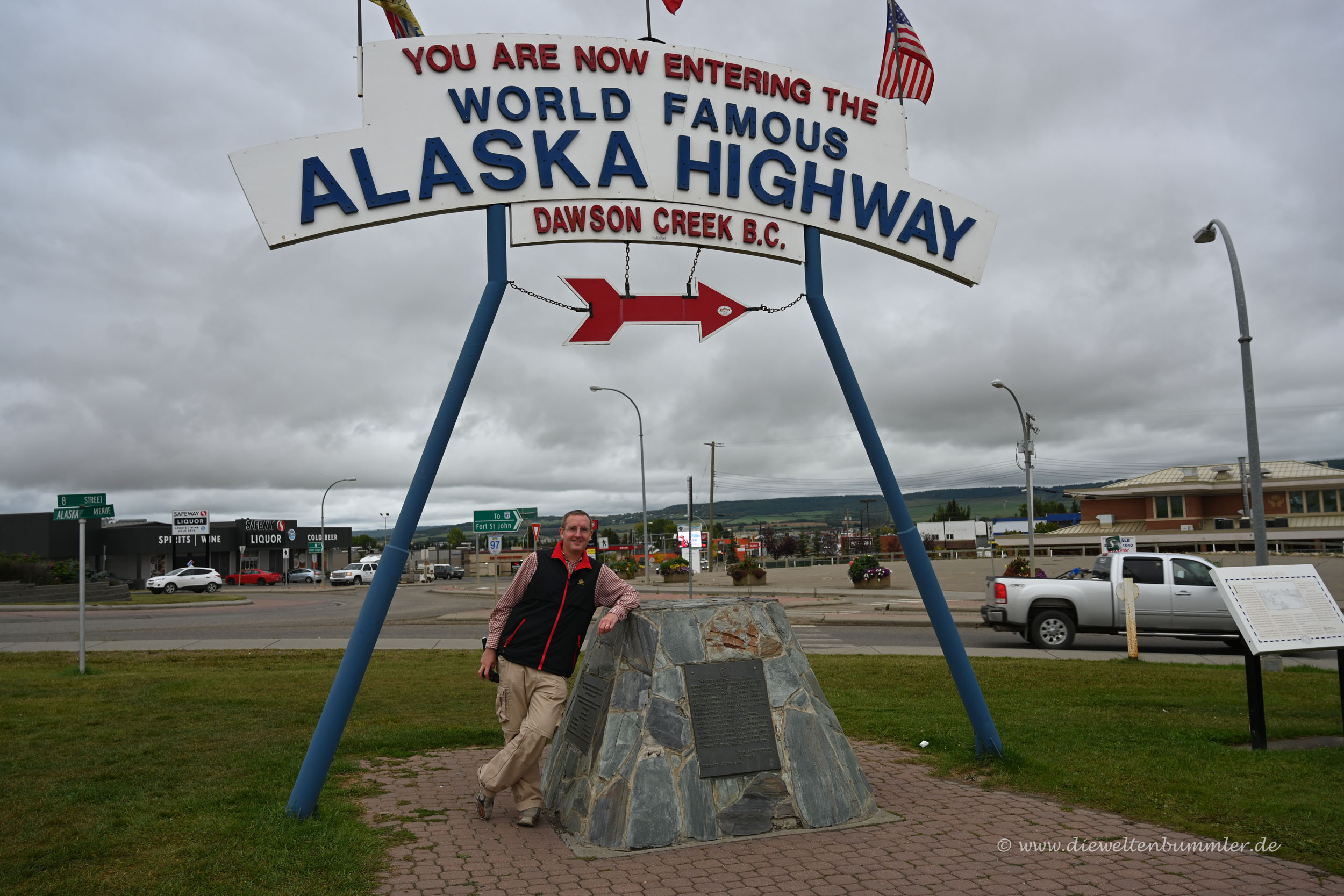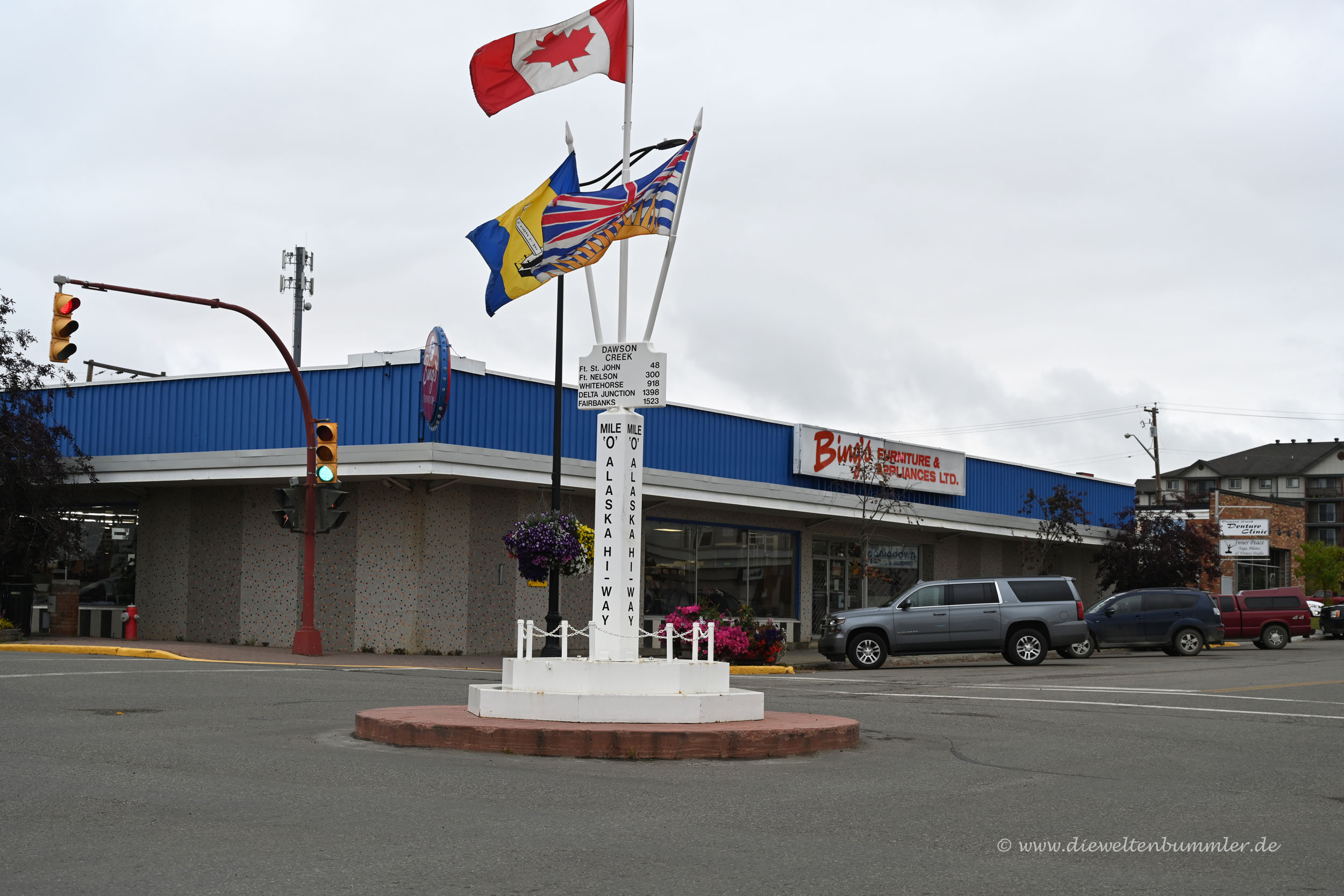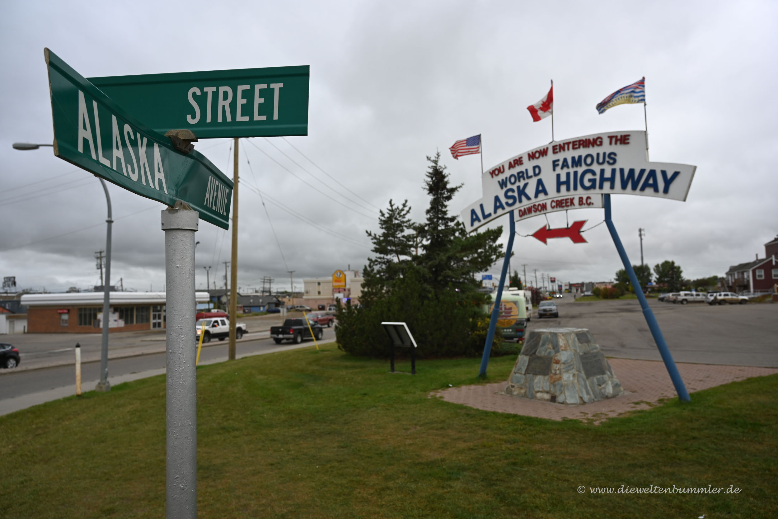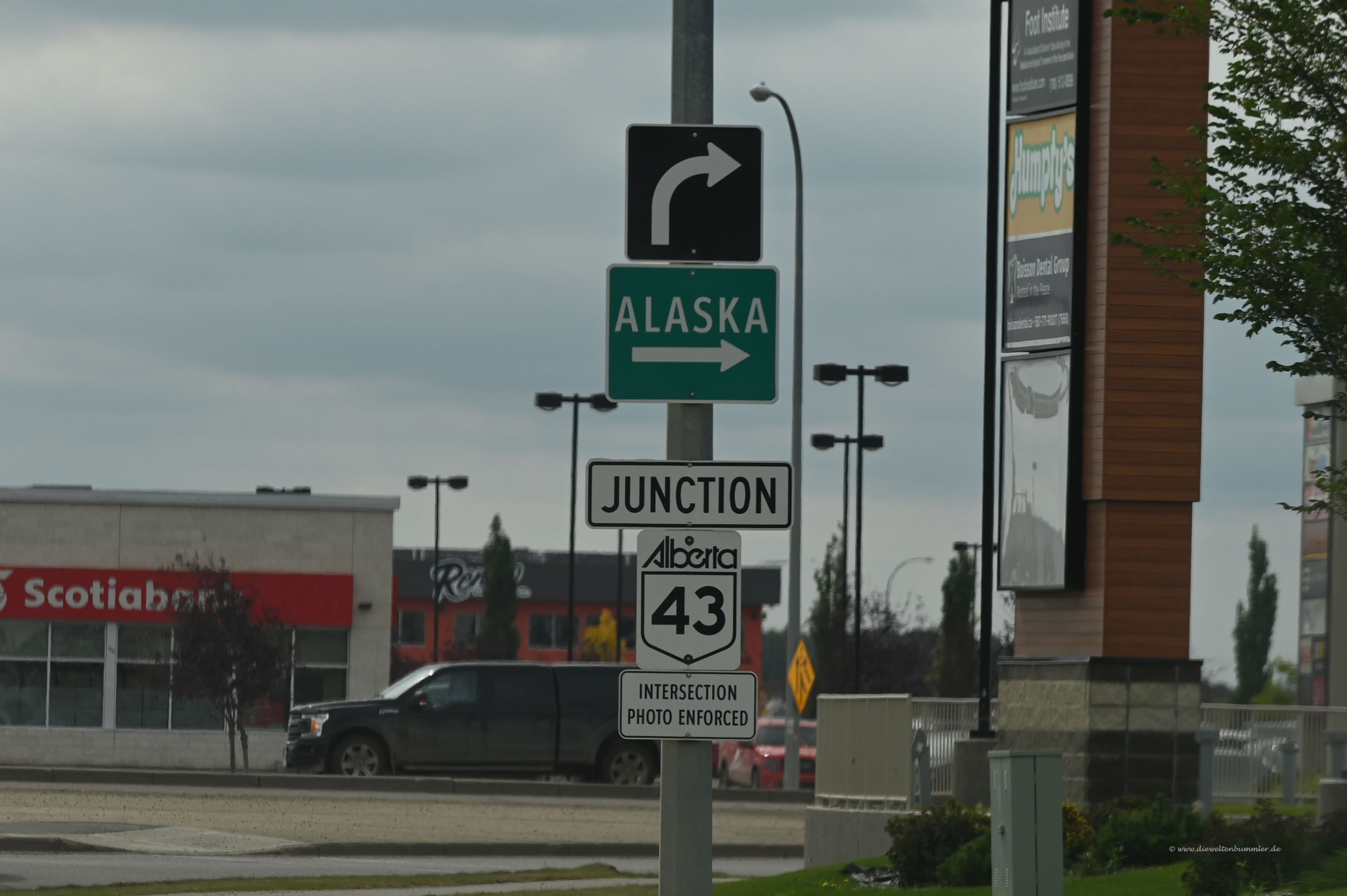 In Dawson Creek war es für uns Pflicht, eine längere Pause einzulegen. Denn hier befindet sich der Kilometer Null des Alaska Highways. Der Alaska Highway ist die Straße, die uns nun weiter in die Wildnis und nach Nordwesten bringen würde. Eine Straße, auf die wir uns schon lange gefreut hatten. Wir stärkten uns bei einer klassischen Burgerbude und steuerten dann den Parkplatz vom Nullkilometer an. Dabei freuten wir uns, dass an der Straßenkreuzung sogar ein ganz normales Verkehrsschild nach Alaska zeigt. Dabei sind das noch fast 2.000 km bis dort hin.