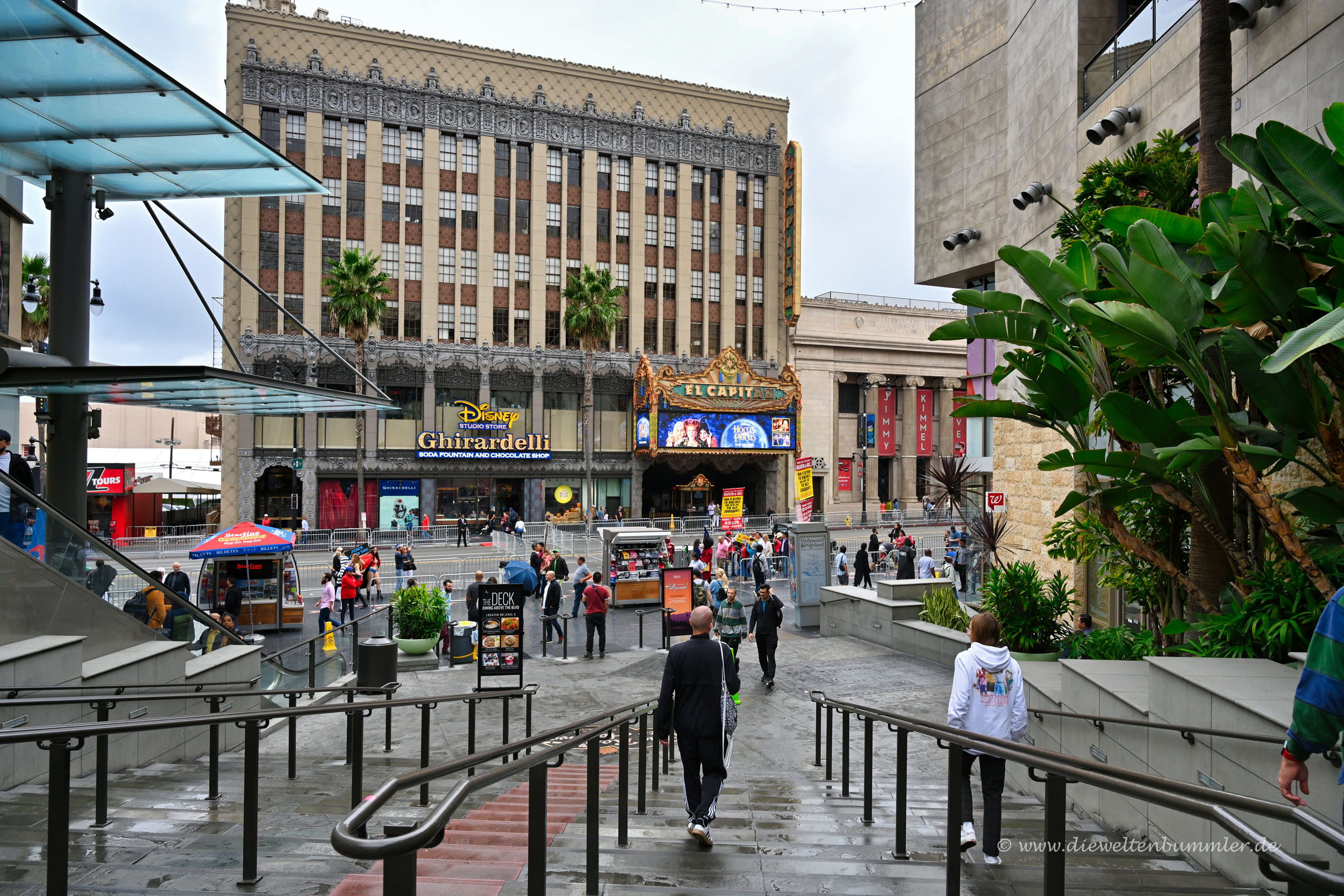 Das lief gut. Aber das war es dann auch schon mit gut. Das Wetter war schlecht und es regnete immer noch gelegentlich. Und der Hollywood Boulevard war nicht das, was wir uns von ihm versprachen. Wir betraten ihn an seinem Herzstück. Auf der einen Seite das Chinese Theatre und Madame Tussauds Wachsfiguren. Auf der anderen Seite das Showgebäude von Jimmy Kimmel.