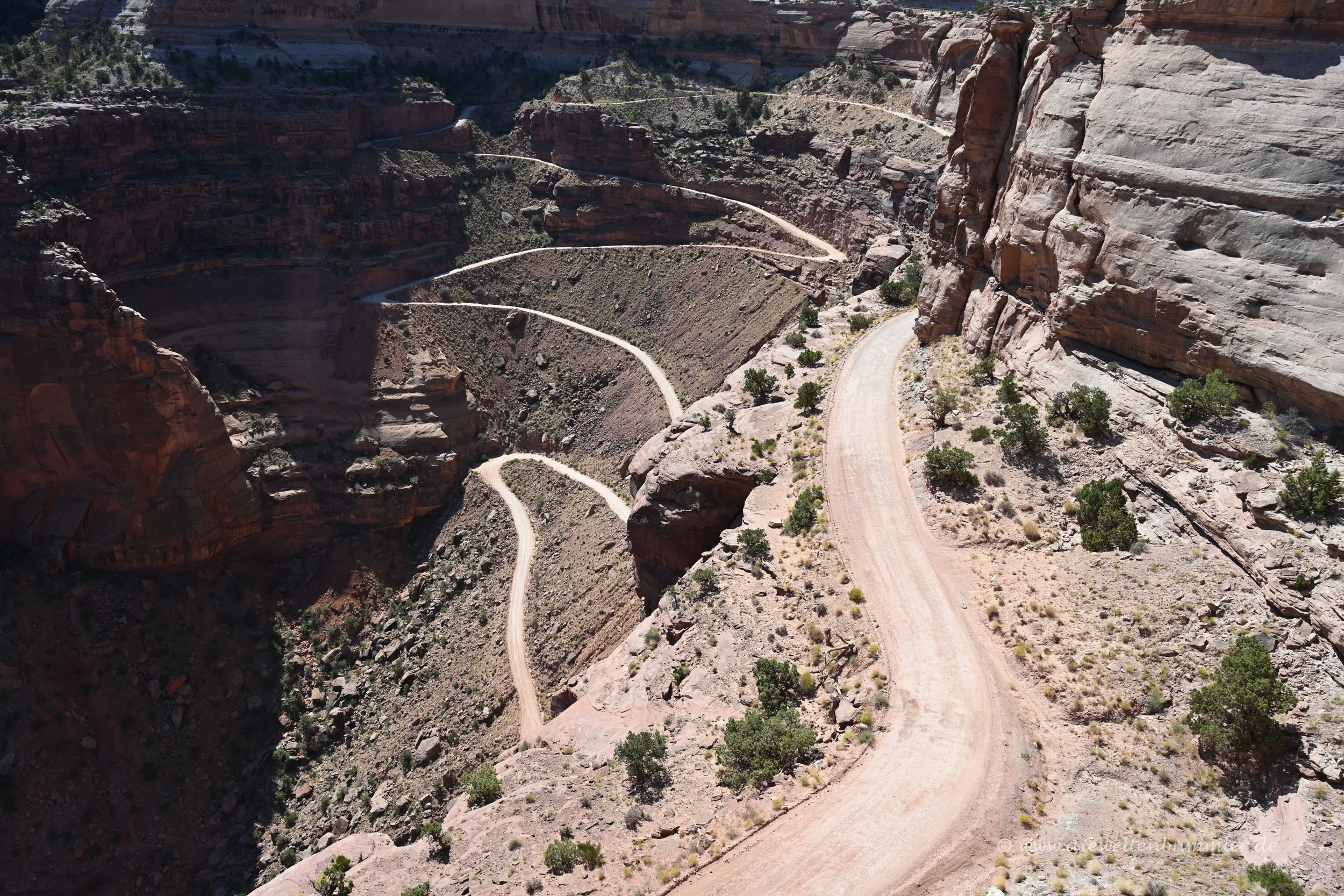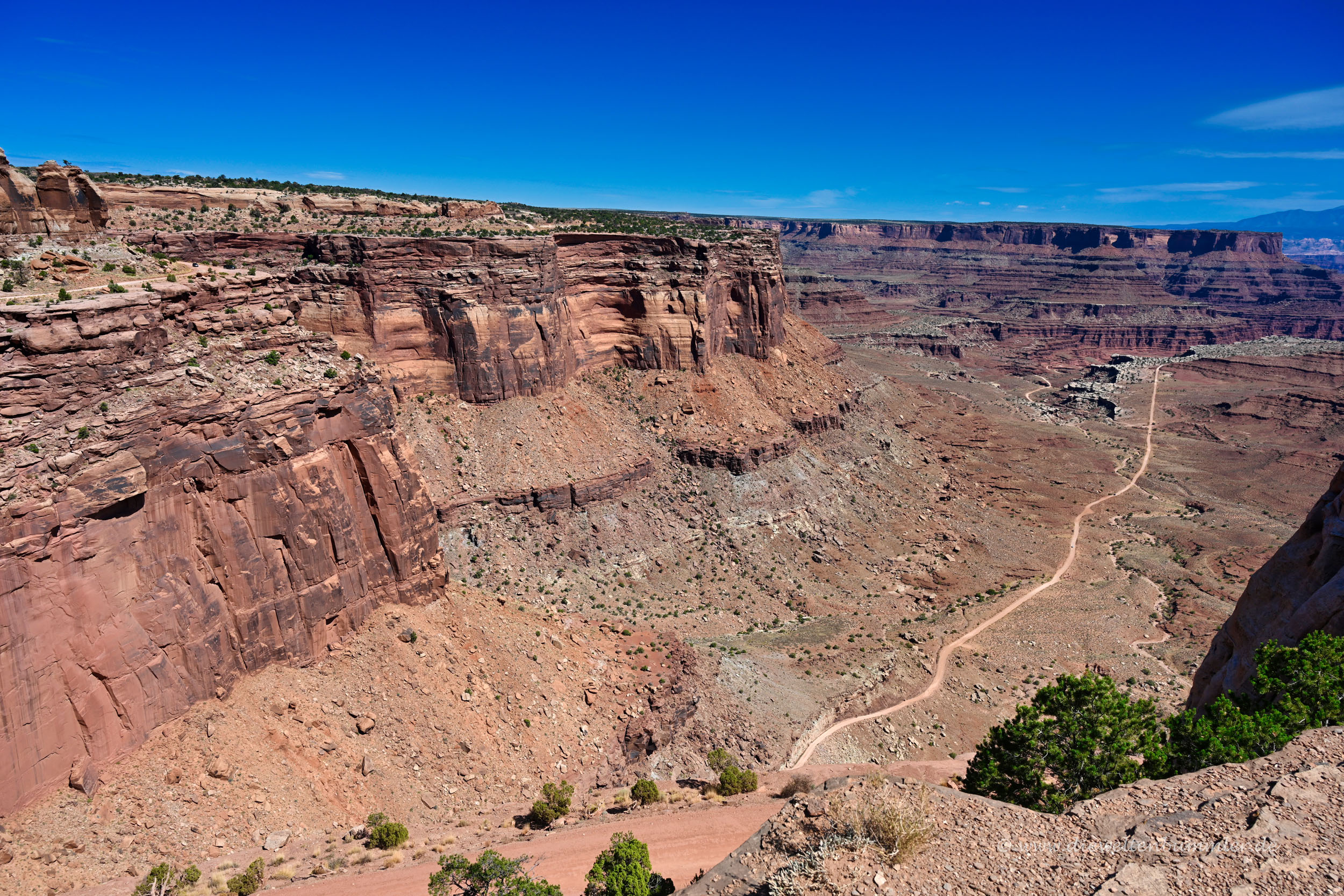 Auch hier warfen wir natürlich einen Blick in das Besucherzentrum, um kurz darauf am ersten Aussichtspunkt die Landschaft zu betrachten. Dort beginnt zugleich der Shafer Trail, eine Schotterstraße, die in das Tal zum Colorado River führt und unterhalb des Deadhorse Point verläuft. Wir waren uns nicht sicher, ob man das auch mit einem normalen Pkw machen könnte. Getraut haben wir uns nicht, sind uns aber ziemlich sicher, dass wir das beim nächsten Aufenthalt im Vorfeld einplanen würden.