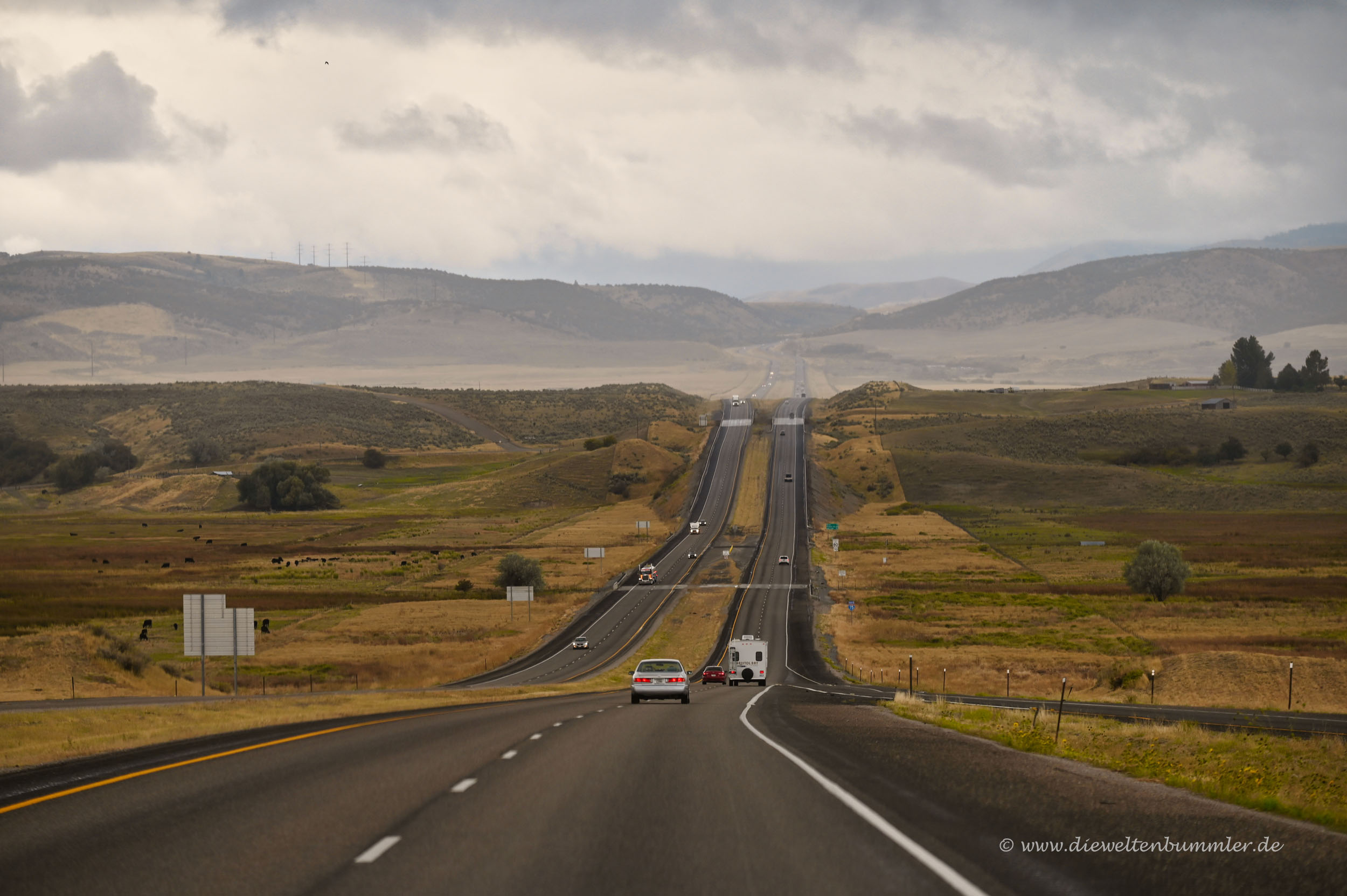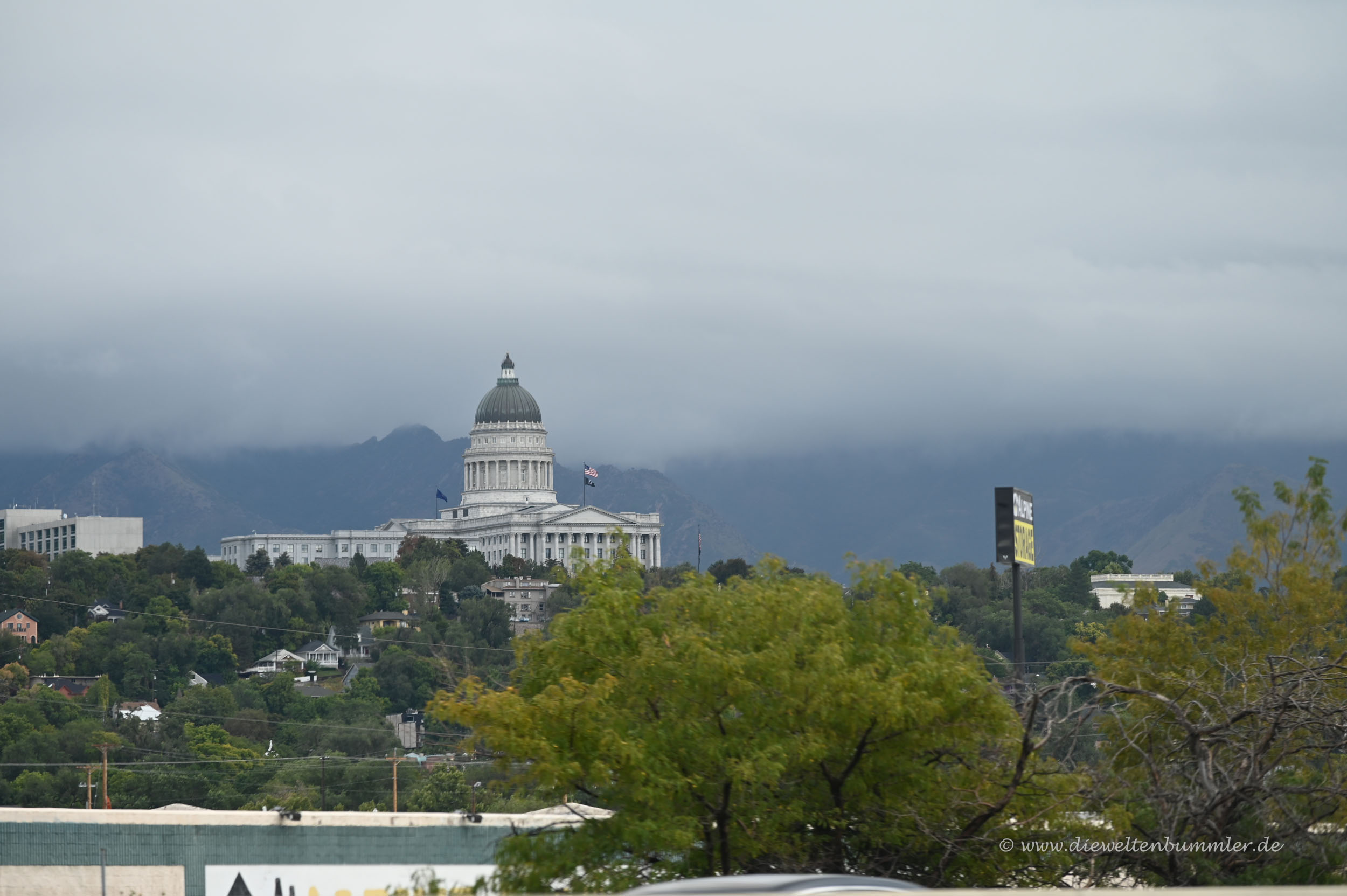Was uns das Leben aber ein wenig schwer machte, war das Wetter. Auf der Autobahn rund um Salt Lake City war es extrem ungemütlich. Es regnete stark, die Sicht war schlecht und der Verkehr ziemlich dicht. Letzteres ist nun wirklich kein Problem für uns, sind wir ja gewohnt. Aber in einem weiten Land wie der USA ist man ja ansonsten eher sehr alleine unterwegs – abgesehen rund um die großen Städten.