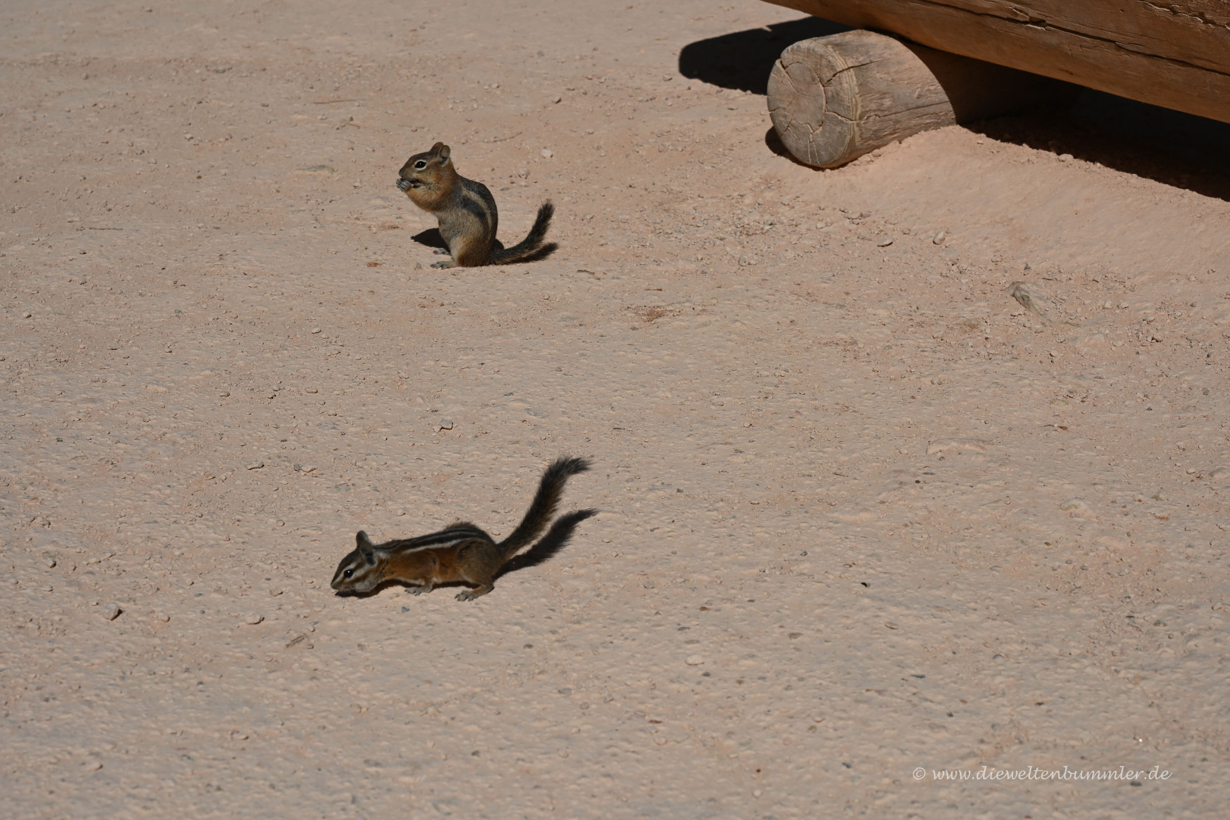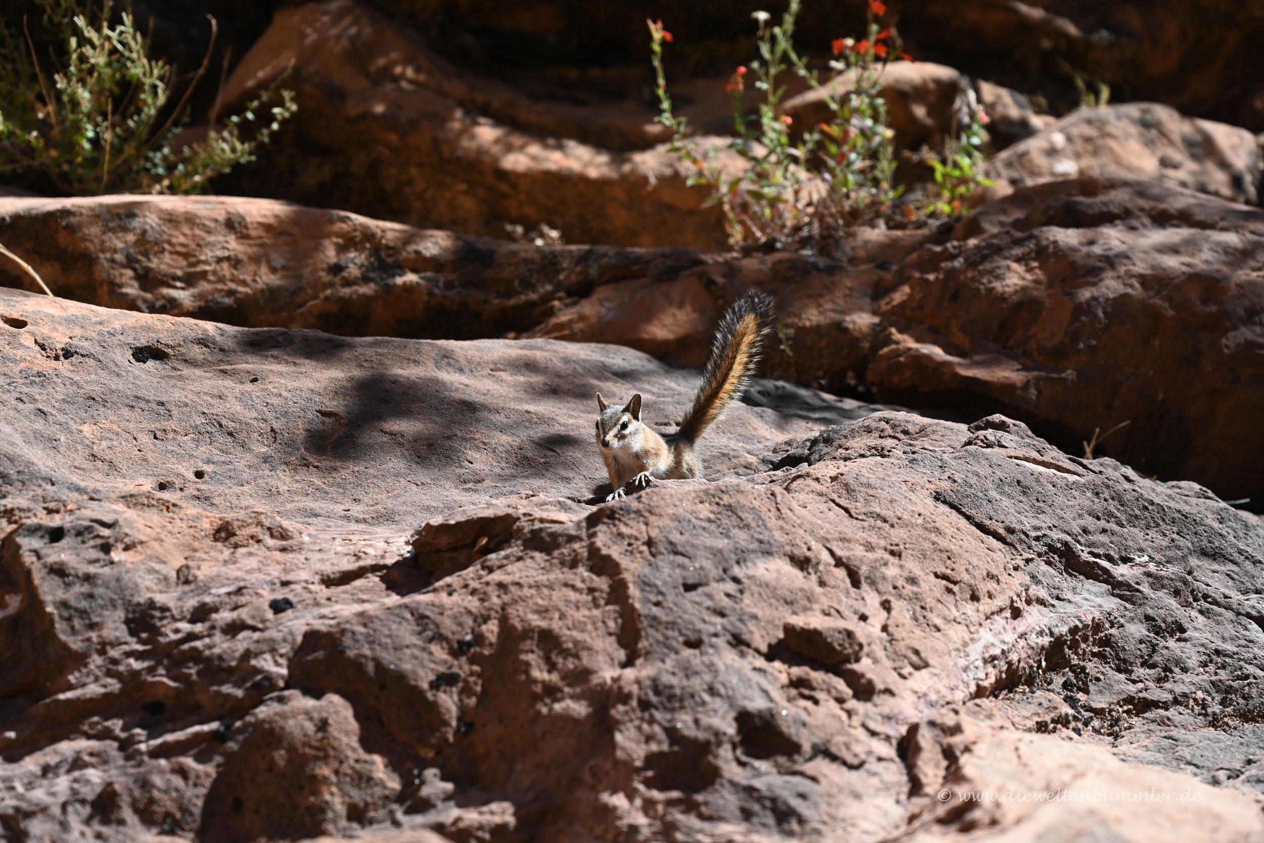 Wir wanderten den Canyon hinab, gingen wieder zu den Picknickplätzen, die wir schon von damals kannten und hofften darauf, dass an dieser Stelle auch wieder die hier sehr zutraulichen Chipmunks kommen würden. Und siehe da, unser Wunsch ging in Erfüllung. Genau an dieser Stelle näherten sich uns die Chipmunks und hielten sogar ihre kleinen Pfötchen an unsere Hand, weil sie sich dort Futter erhofften. Das gab es allerdings nicht, weil es einerseits verboten ist, wilde Tiere zu füttern und es andererseits genügend doofe Touristen gibt, die es trotzdem machen.