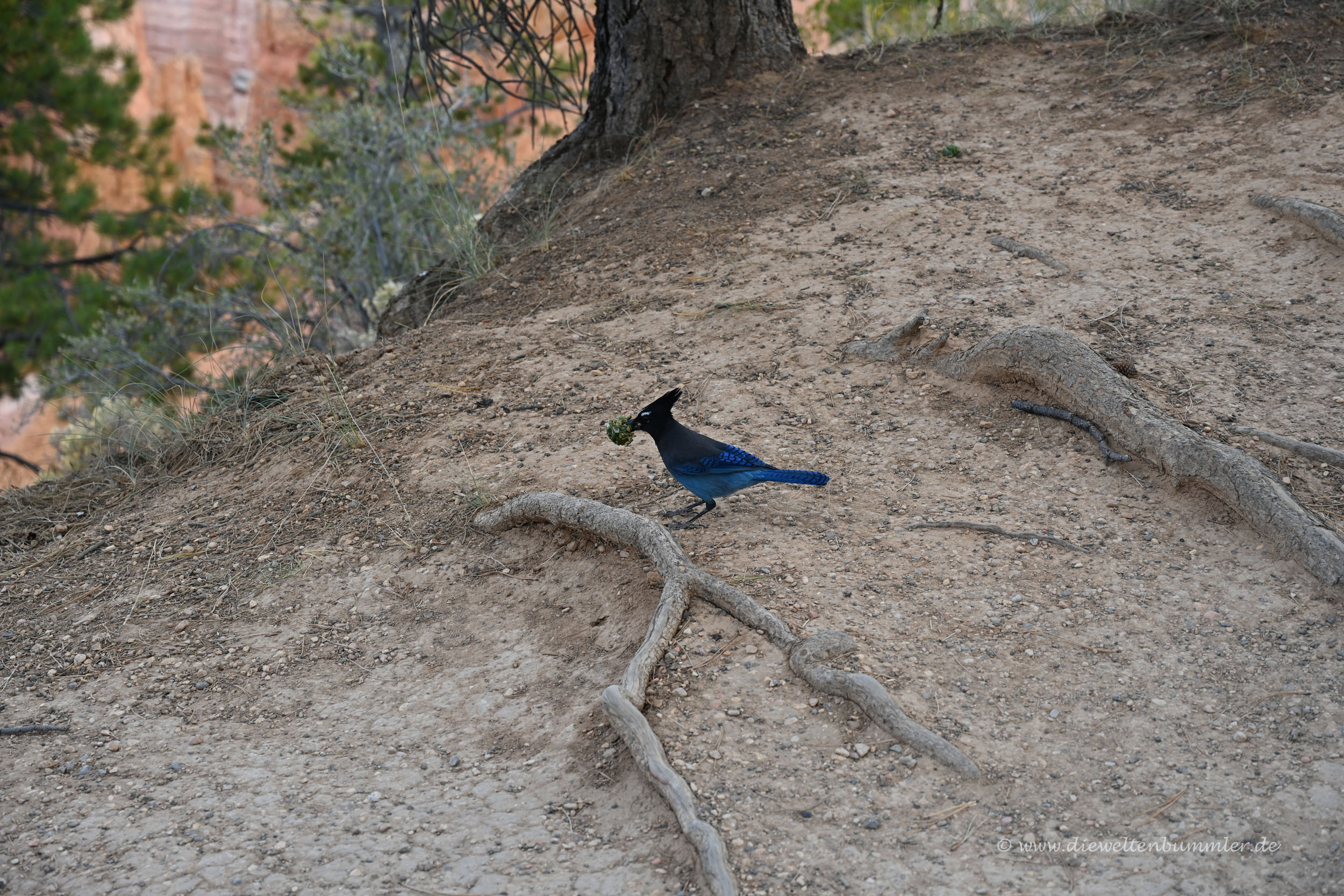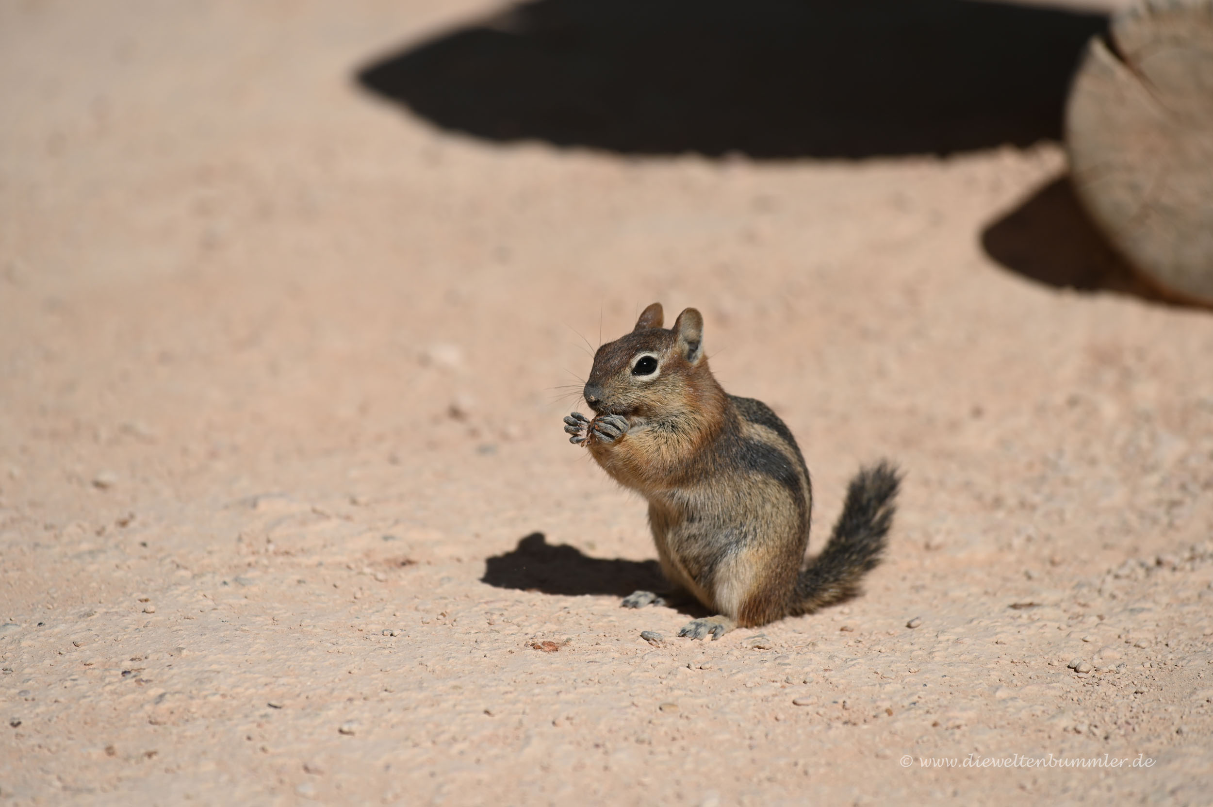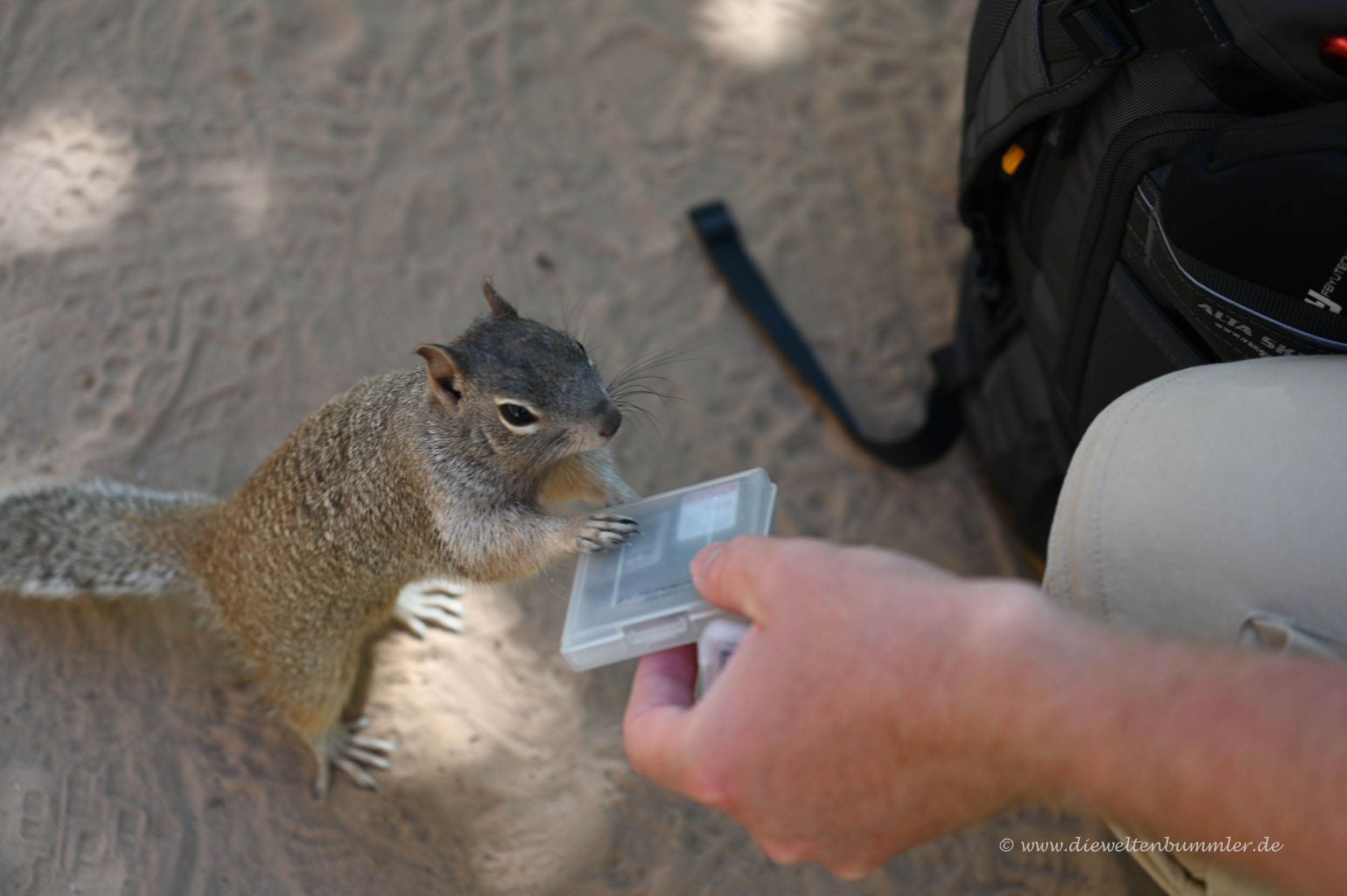 Ein anderes Squirrel kam mir ebenfalls sehr nahe und ich streckte meine Hand entgegen, so wie ich das bei den Chipmunks im Bryce Canyon Nationalpark auch tat. Na ja, war dieses Mal nicht so clever. Das Eichhörnchen kam, schaute kurz und biss mir dann kurzerhand in den Finger. Ich erschrak natürlich, aber zum Glück biss das Squirrel nicht fest zu und schon gar nicht durch die Haut. Dabei hätte das Tier das mit den scharfen Zähnchen sehr gut gekonnt.