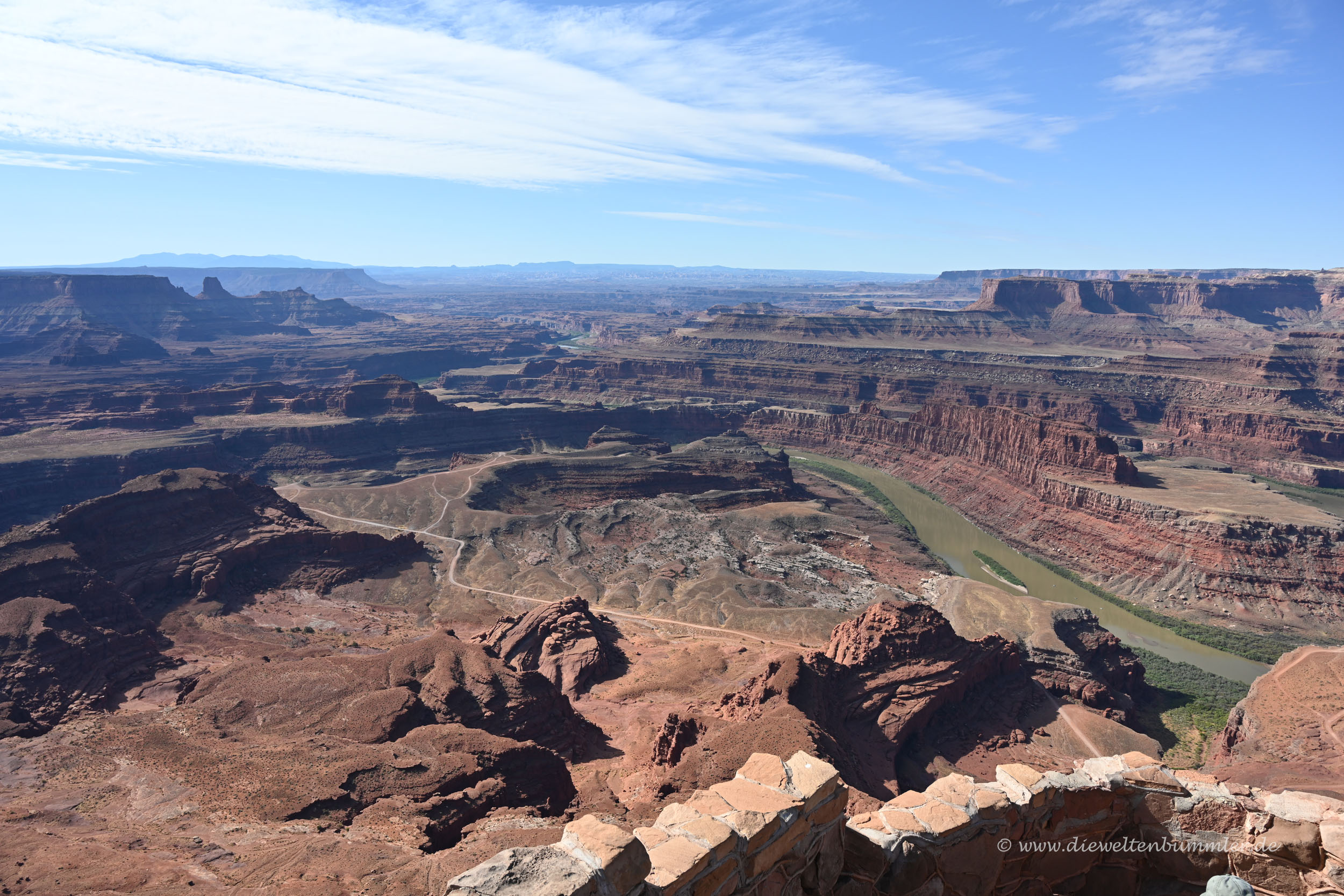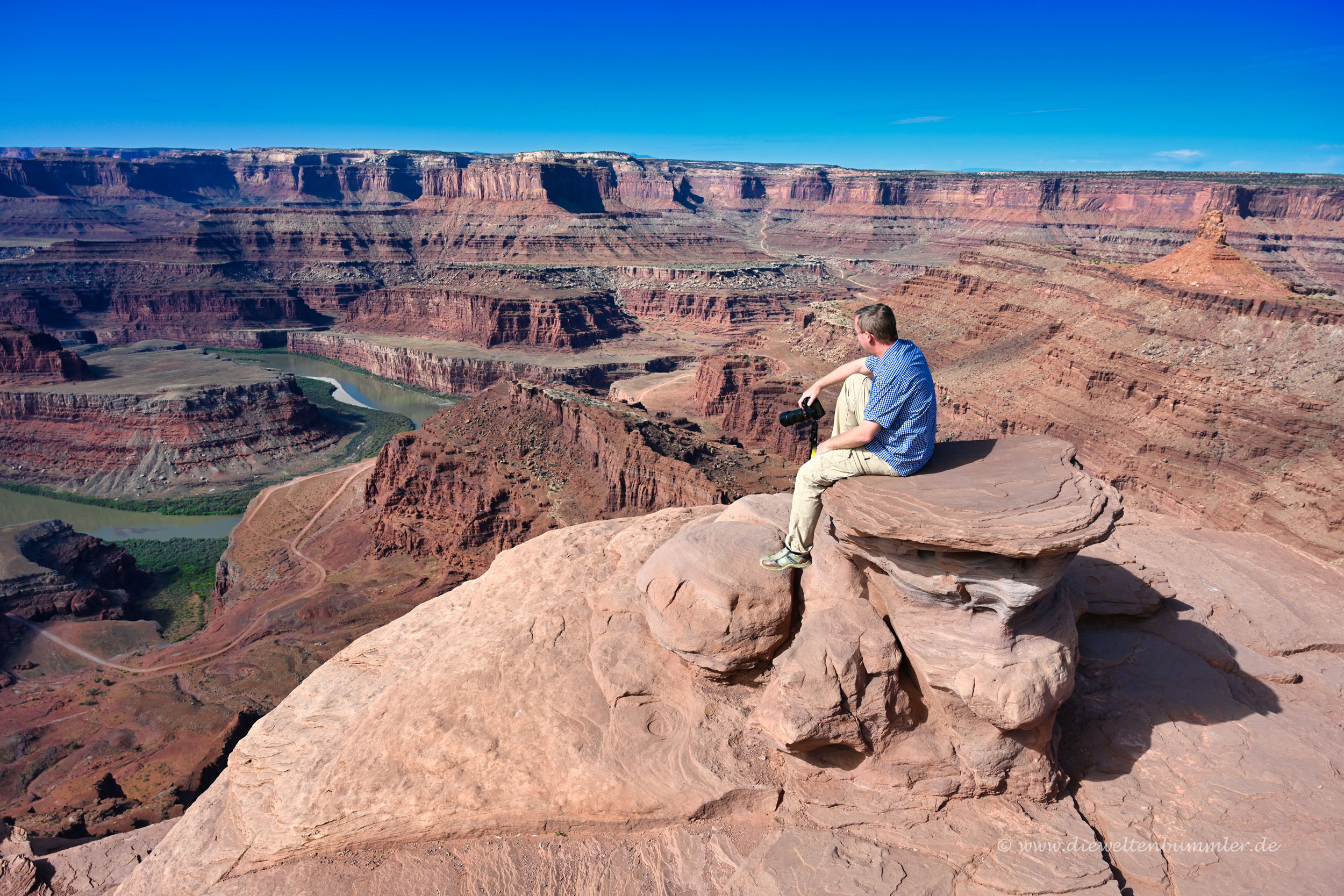 War irgendwie seltsam, denn wir hätten ja auch am Morgen beim Frühstück auf die Idee kommen können. Aber egal, es war ja nicht zu spät. Wir hatten unser Zimmer für den Abend sicher und konnten uns jetzt schön Zeit lassen. Wir fuhren also bis zum Ende des State Parks, exakt zum Deadhorse Point, und gingen die letzten Meter bis zur Abbruchkante zu Fuß. Von dort blickten wir in das Tal des Colorado River, den wir im Laufe unserer Reise natürlich noch einige Male sehen würden.