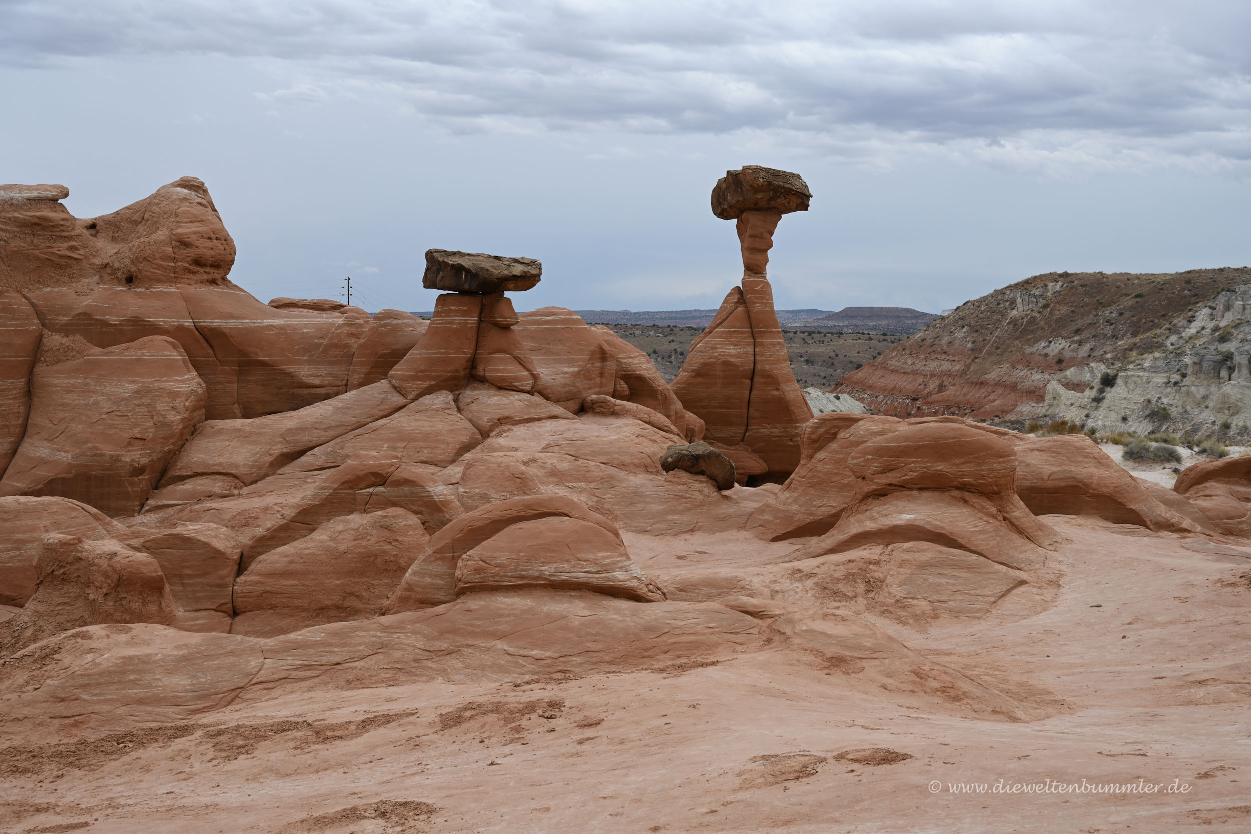 Wir wollten aber zwischen Page und Kanab auch noch zu den Toadstool Hoodoos. Weitere Hoodoos, die nun einfach so in der Landschaft standen. Bei Weitem nicht zu vergleichen mit dem Bryce Canyon Nationalpark, aber deshalb nicht weniger schön. Auch diese erreichten wir nur nach einer kurzen Wanderung. Besonders schön an den Toadstool Hoodoos war die Lage zwischen Bryce Canyon, Antelope Canyon, Zion Nationalpark und Horseshoe Bend. Denn dadurch waren die meisten Touristen eher in diesen großen, bekannten Hotspots unterwegs.