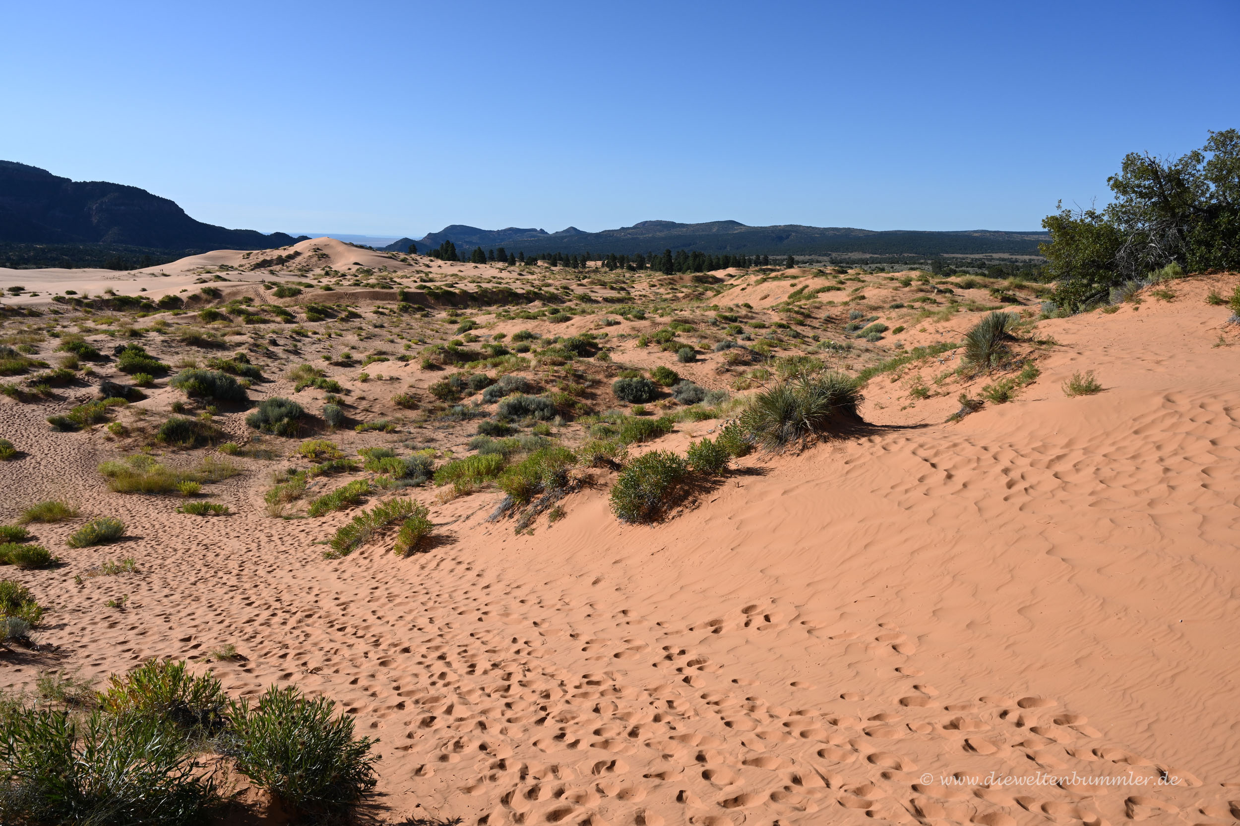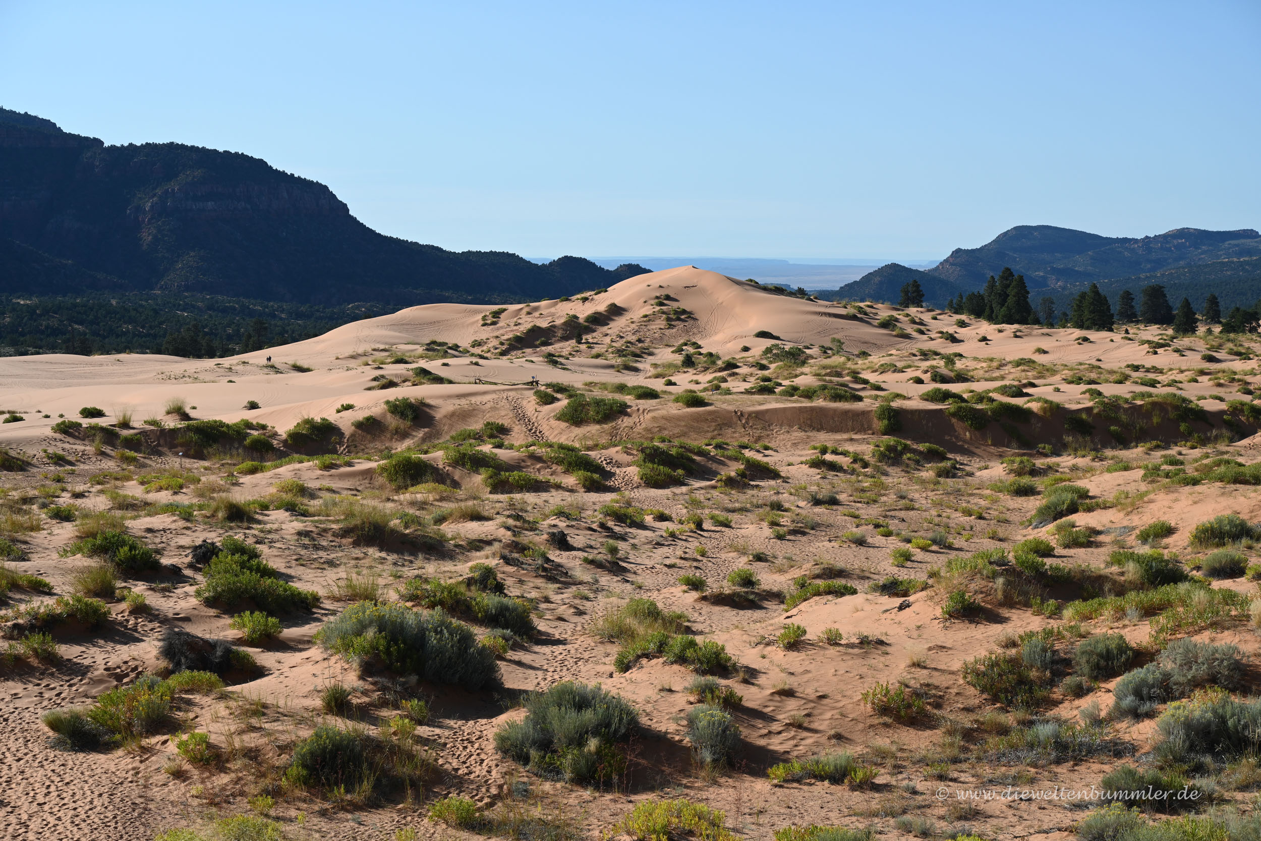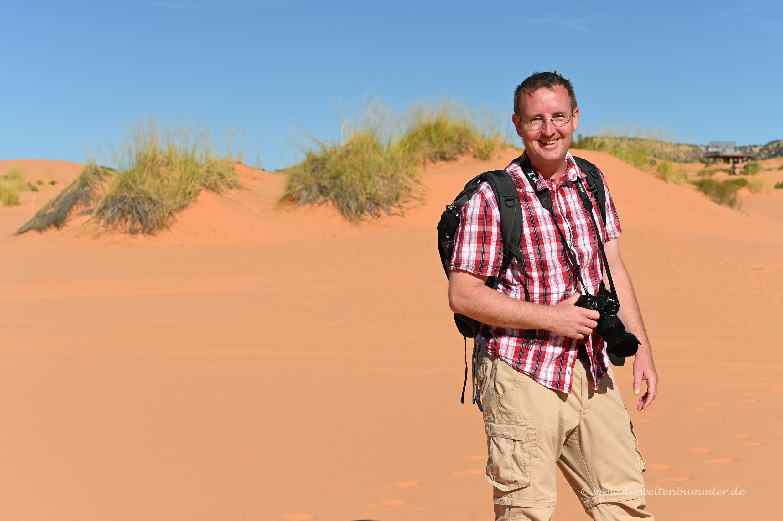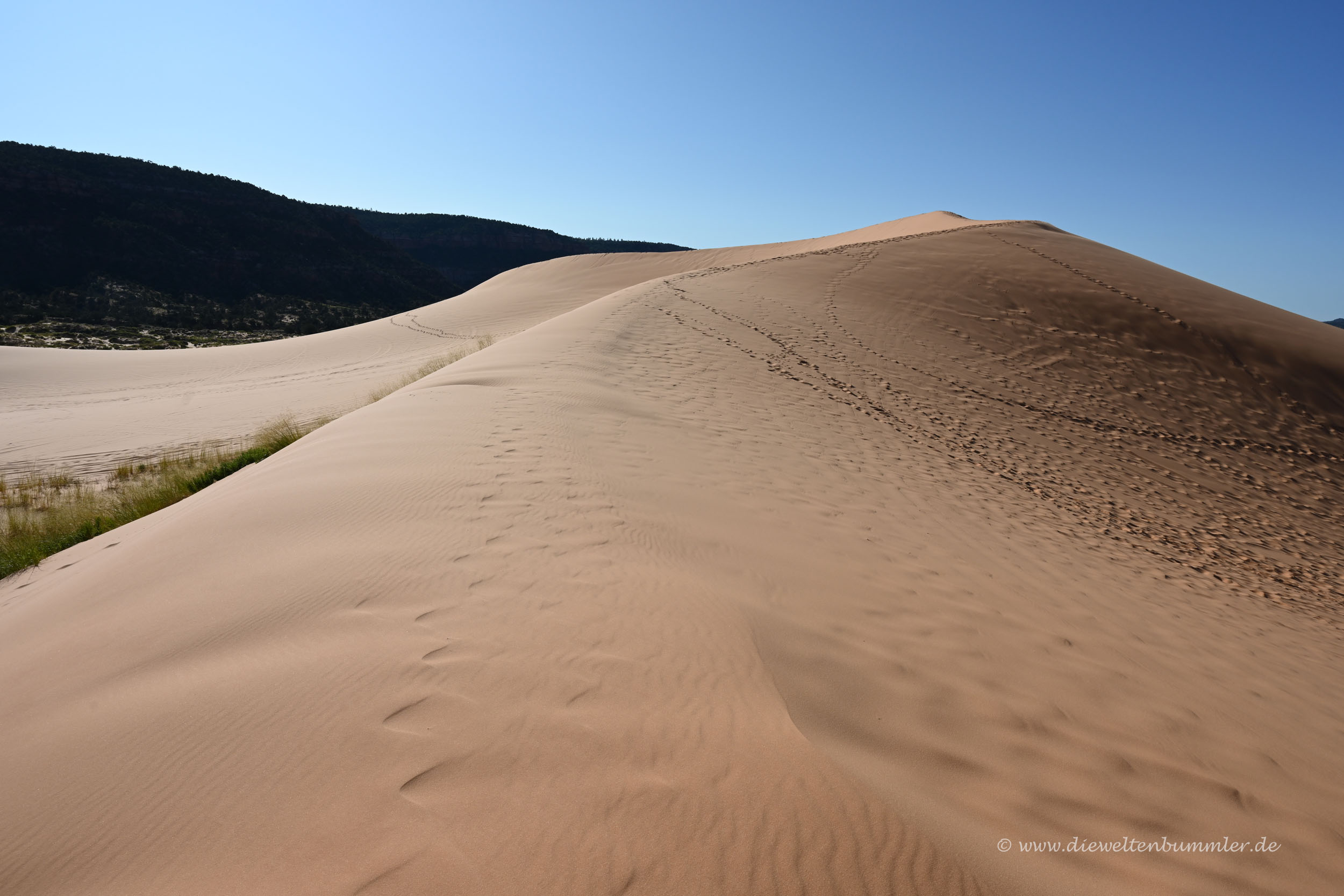 Allzu lange hielten wir uns zwar nicht auf, weil wir einmal natürlich in den Zion Nationalpark wollten und weil wir nach langen Spaziergängen in den Dünen dann irgendwann auch mal genug Sand in den Schuhen hatten. So schön die Dünen auch waren, so muss man auch sagen, dass ein Besuch der Dünen in den frühen Abendstunden besser wäre. Dann würde die Farbe der Düne im Licht der untergehenden Sonne deutlich besser zur Geltung kommen.