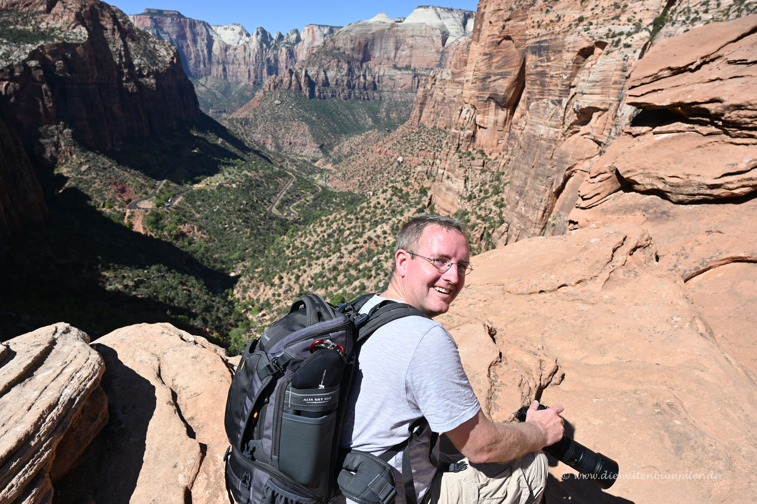 Am Ende des Trails standen wir am Aussichtspunkt und hatten einen absoluten fantastischen Blick auf das Tal, in das wir später hinab fahren würden. Wir konnten die Straße erkennen und wir sahen in der Ferne auch die Straße, in der man nur mit dem Shuttlebus hineinfahren konnte. Das sollte unser nächstes Ziel sein.
