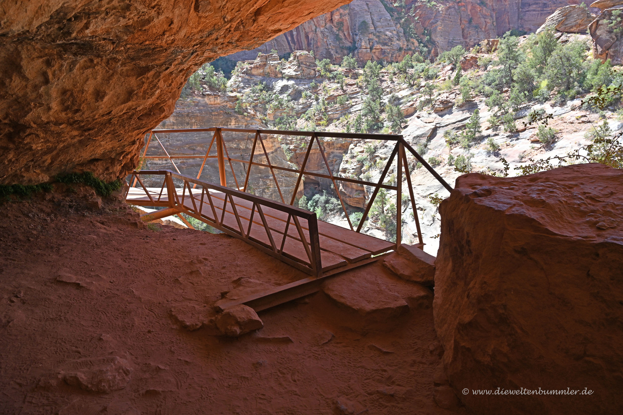 Anschließend erreicht man einen Tunnel, durch den man einspurig in ein Tal hinab fährt. Wir wussten jedoch zum Glück, dass wir unbedingt vor dem Tunnel anhalten sollten. Der Parkplatz hierfür war zu klein und so parkten wir am Straßenrand. Denn von hier aus gibt es einen kleinen Trail zum Canyon Overlook. Gerade als wir diesen Wanderweg betraten, kam uns eine Gruppe junger Deutscher entgegen, die uns sagten, dass der Weg absolut anstrengend sei. Nun ja, die jungen Herren sahen nicht so aus, als würden sie oft wandern. Und so war der Wanderweg zwar schon ein wenig herausfordernder, aber als anstrengend würden wir ihn nicht gerade bezeichnen.