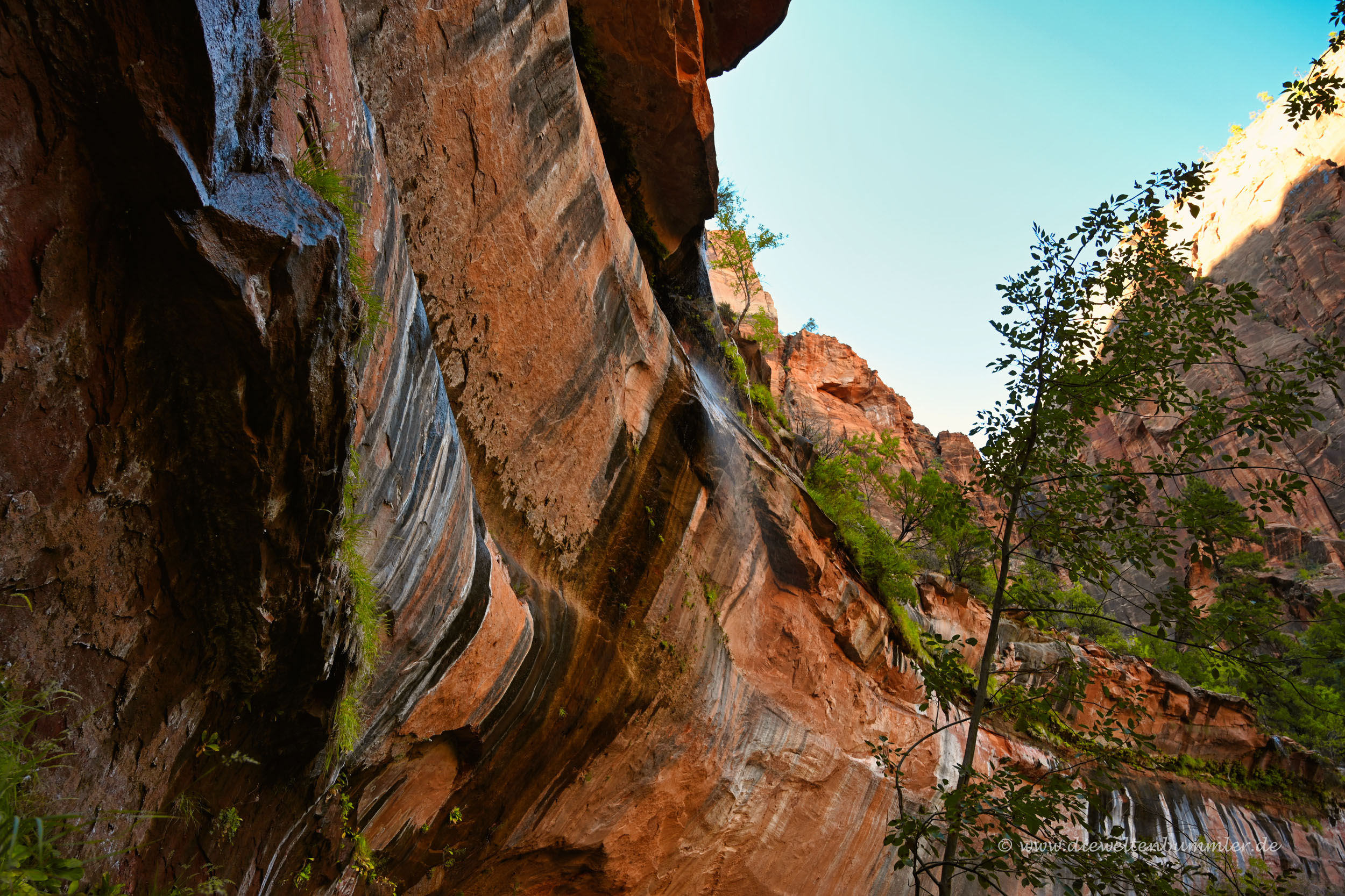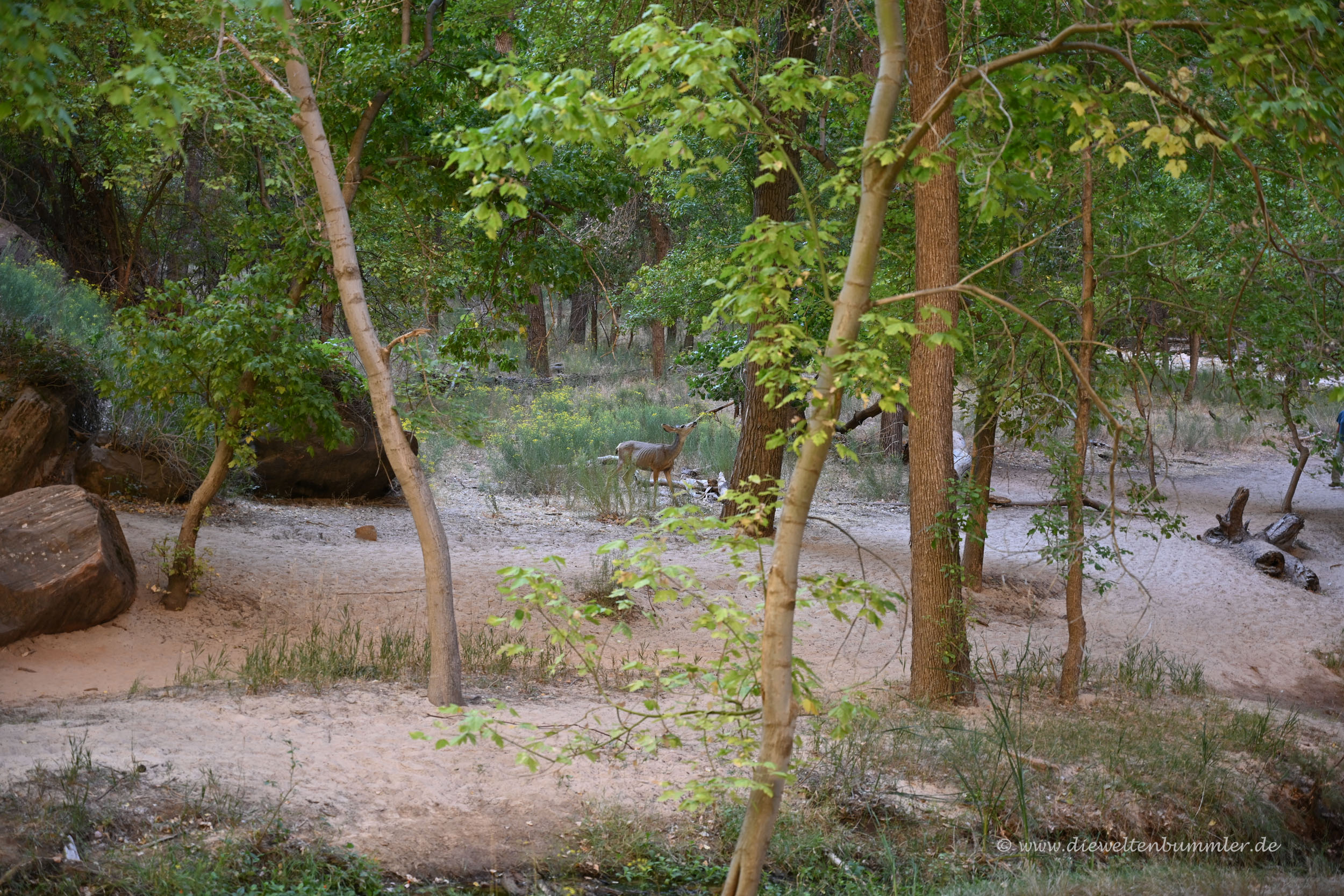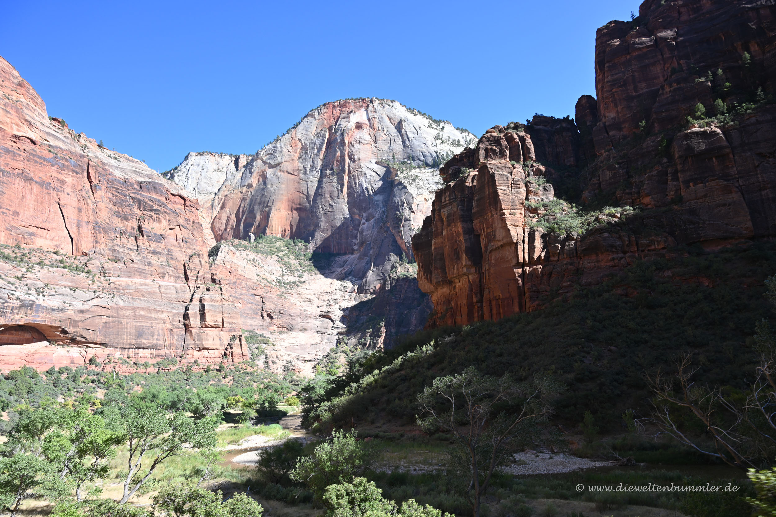 Auf den berühmten Felsen Angel’s Landing wollten wir nicht. Das hatten wir schon im Vorfeld ausgeschlossen. Wir wollten lieber unten im Tal bleiben und hier wandern, so gut es ging. Am Ende des Tals würde man nämlich durch das knietiefe Wasser wandern müssen. Und darauf hatten wir nun auch nicht wirklich Lust. Das heißt, Lust hatten wir schon. Aber wir trauten uns mit unserer Kameraausrüstung nicht so recht. Würden wir auf den glatten und nassen Steinen ausrutschen, dann wäre im Grunde unsere gesamte Ausrüstung hinüber und das wollten wir nicht riskieren.