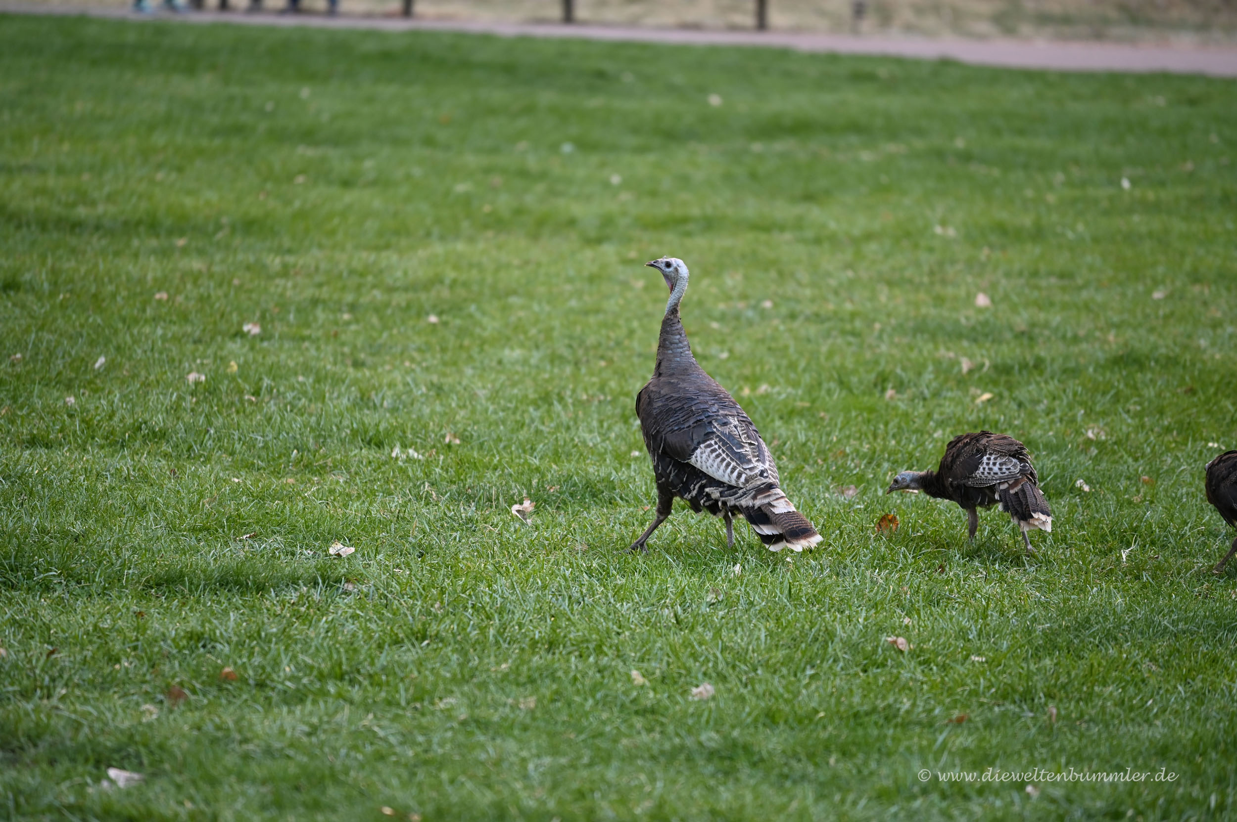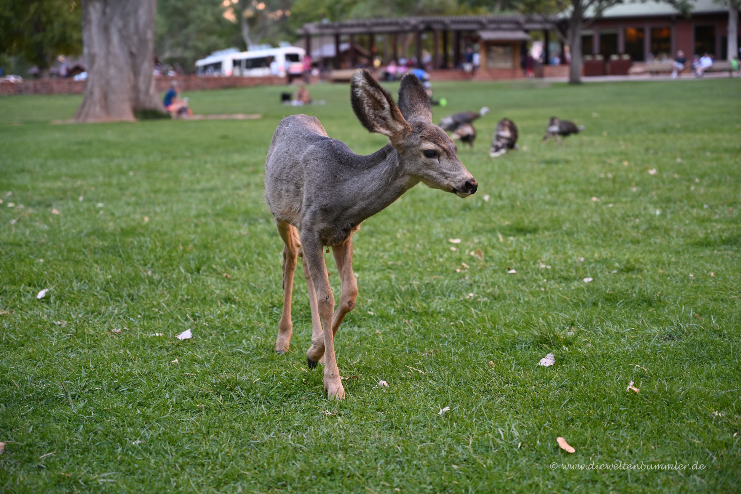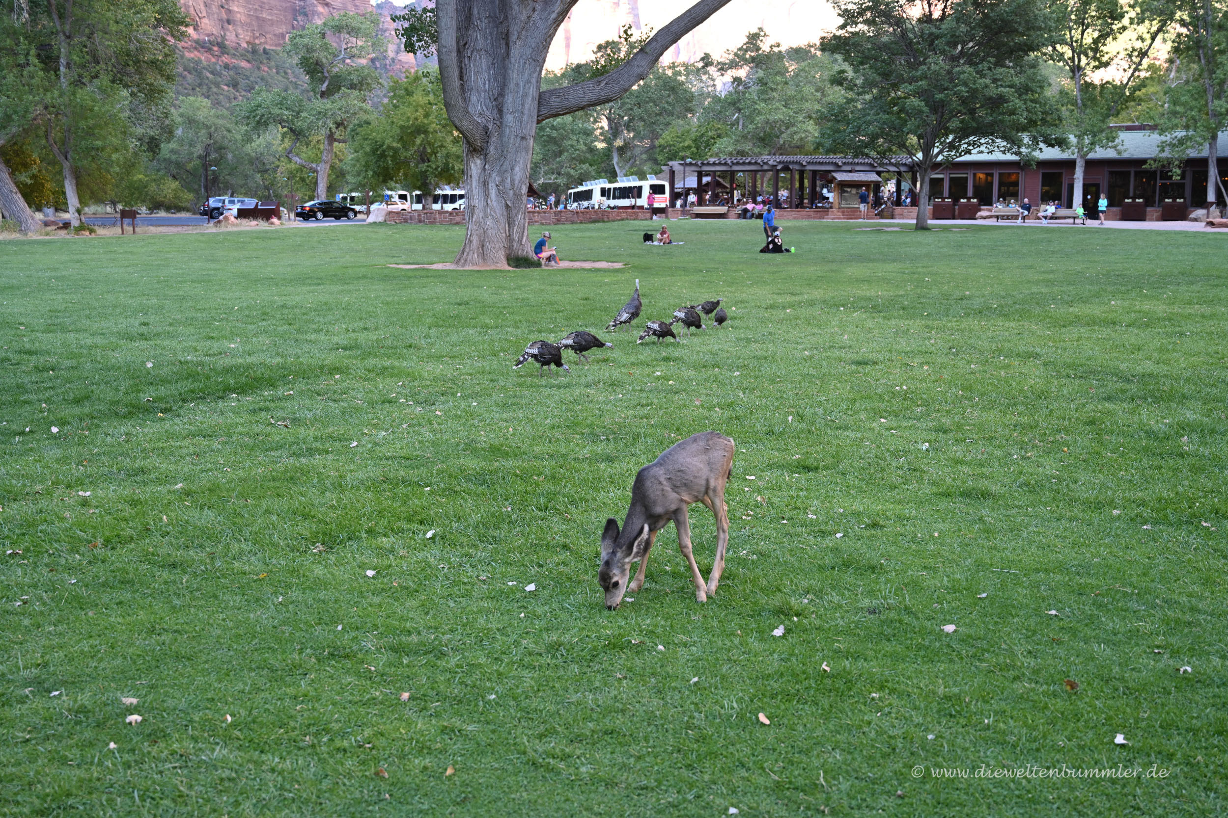 Andererseits gab es ohnehin schon genug andere Dinge zu sehen. Zum einen die tolle Felsenlandschaft, aber zum anderen auch die Tierwelt. Obwohl hier so verdammt viele Menschen unterwegs waren, teilte man sich das enge Tal mit Rehen, Rehkitzen und wilden Truthähnen. Ein Rehkitz kam mir sogar sehr nahe, weil ich unbeabsichtigt zwischen dem Tier und seiner Mutter stand. Schnell habe ich natürlich Platz gemacht. Wilde Truthähne in so großer Zahl hatte ich auch noch nicht gesehen. Auch schön.